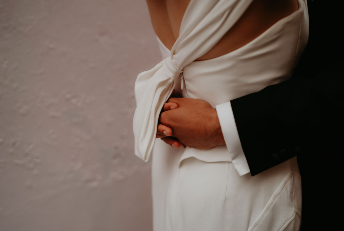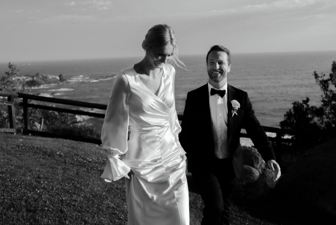 It must be said: the folks at Grace Loves Lace know their way around a wedding dress. Bonny’s slinky, silky gown was the first dress she tried on… and the last! “I wanted something simple and timeless with a low-cut back,” she explains of her pick. “I found this beautiful silk gown whilst scrolling through Instagram and I knew I had to have it. I flew my mum over from Sydney to show her and we both knew it was the one straight away, I didn’t bother looking anywhere else. I added a touch more detail with a pearl back piece.” The elegant Grace Loves Lace number was the perfect partner for Andrew’s M.J. Bale suit, with another HM fave, Alexandra Cohen, snapping pics on the day (get in touch with her here). Gorge!