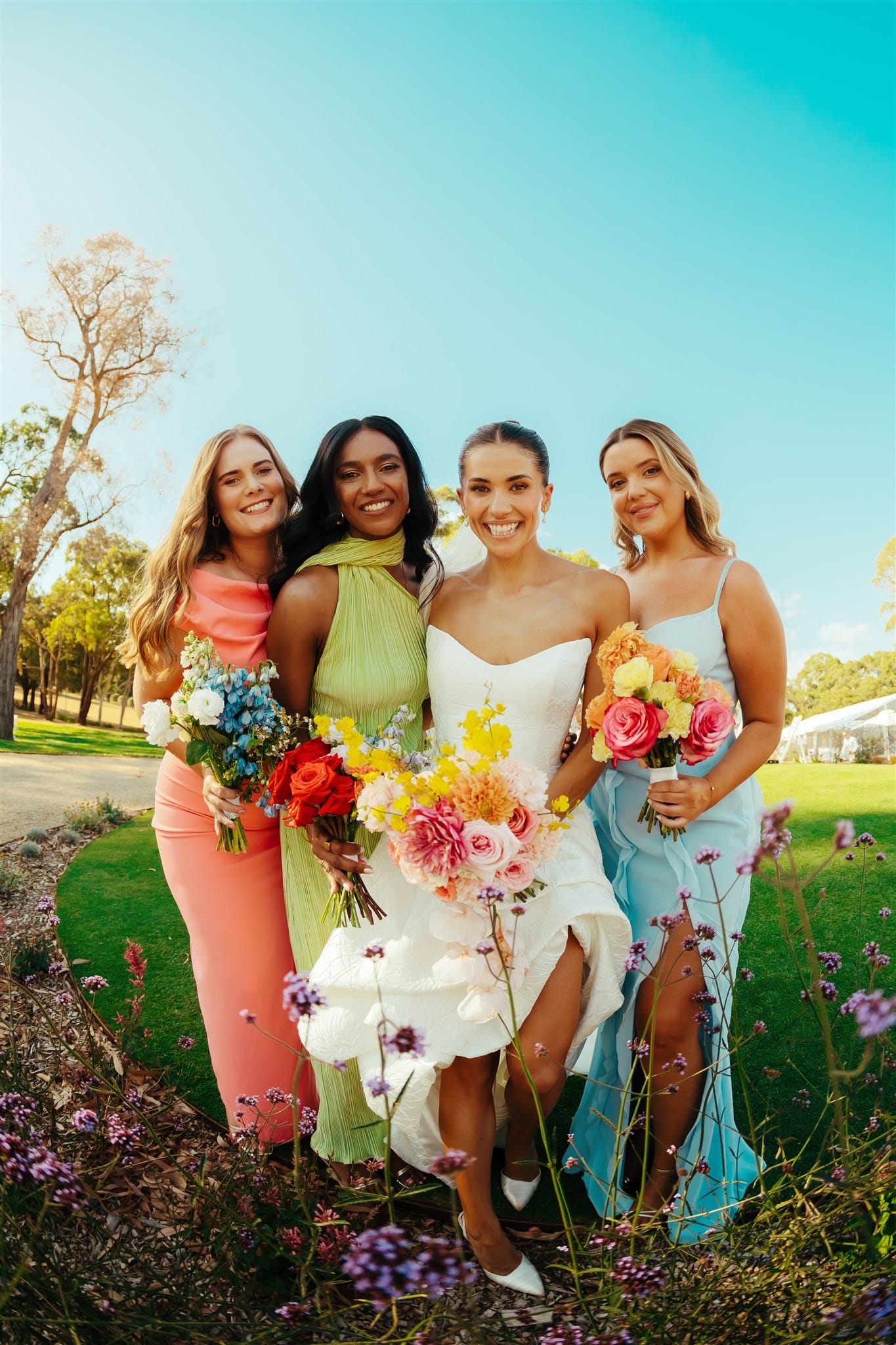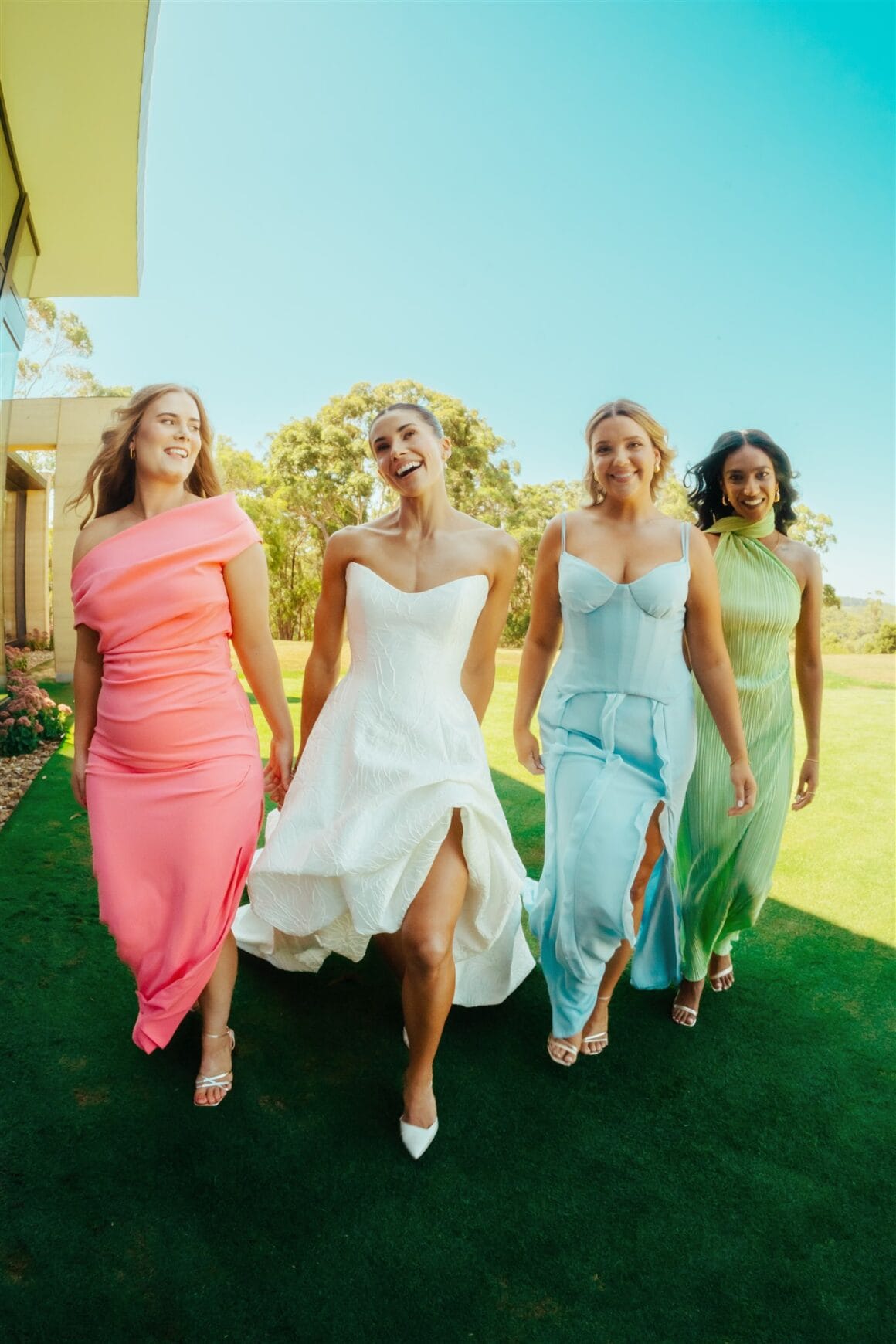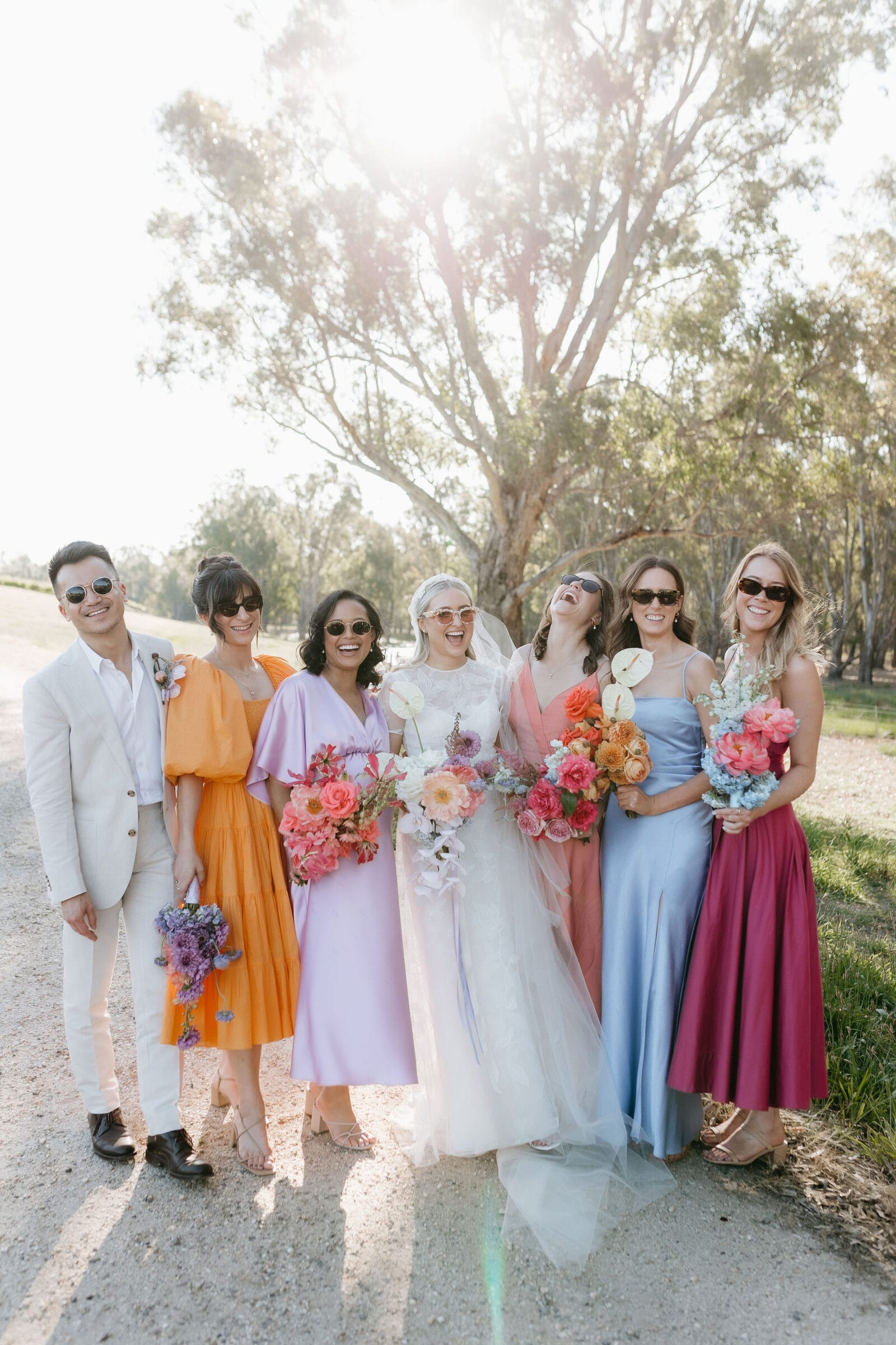 Colour and music were the main focus for Annabel and Will when planning their wedding at Mitchelton Winery in Nagambie. And Annabel’s wedding party clearly nailed the brief when it came to colour – the bold, block shades popping against the florals from Honesty Flora.