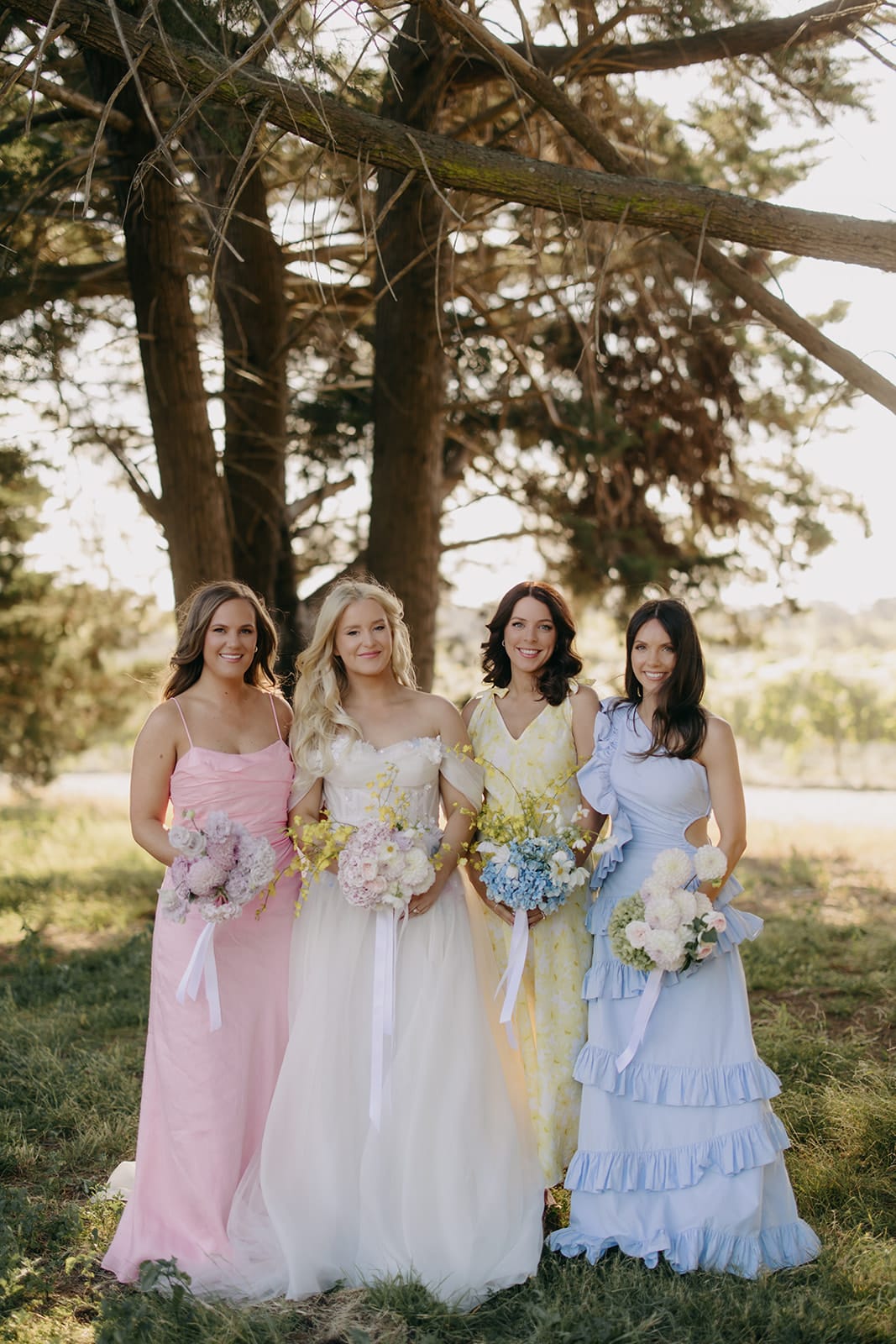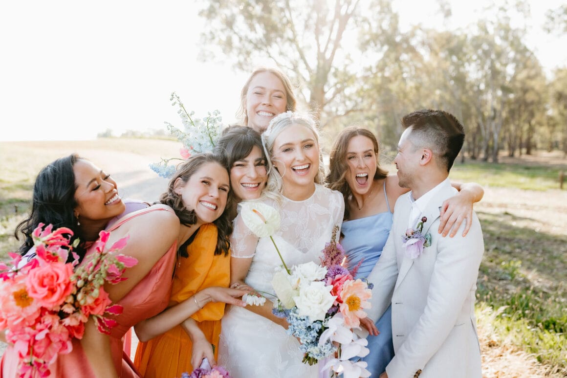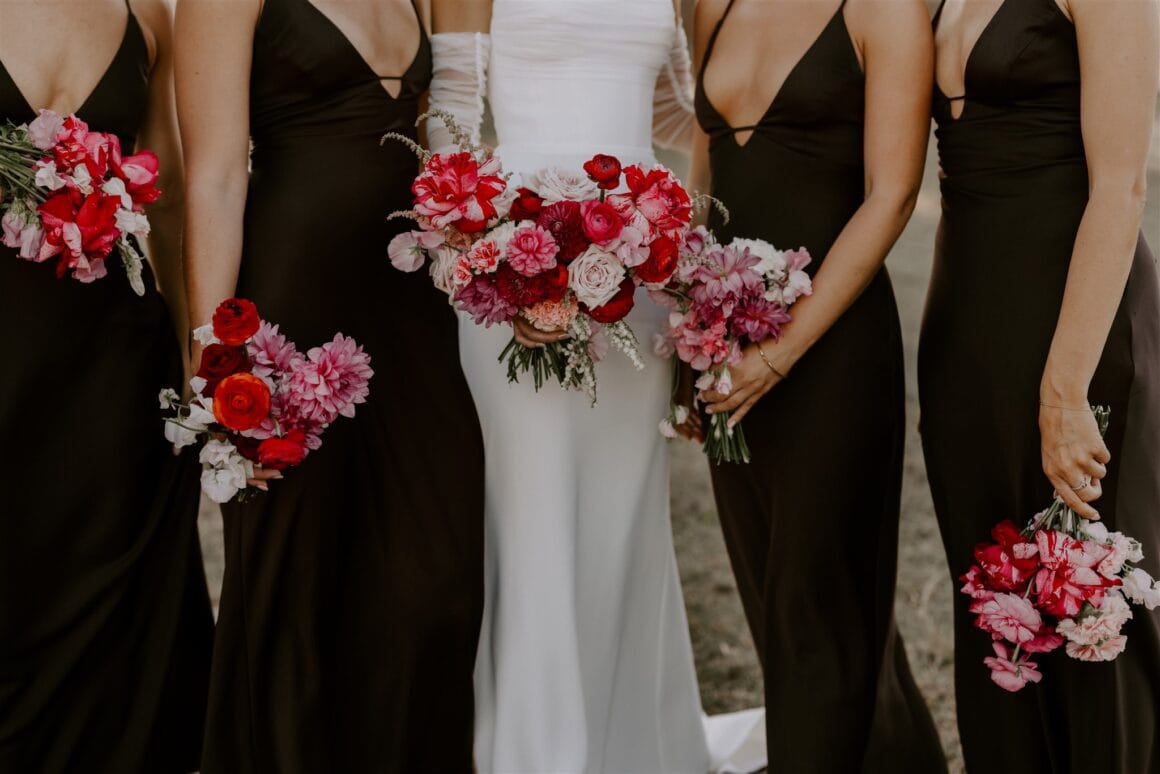 Colour and music were the main focus for Annabel and Will when planning their wedding at Mitchelton Winery in Nagambie. And Annabel’s wedding party clearly nailed the brief when it came to colour – the bold, block shades popping against the florals from Honesty Flora.