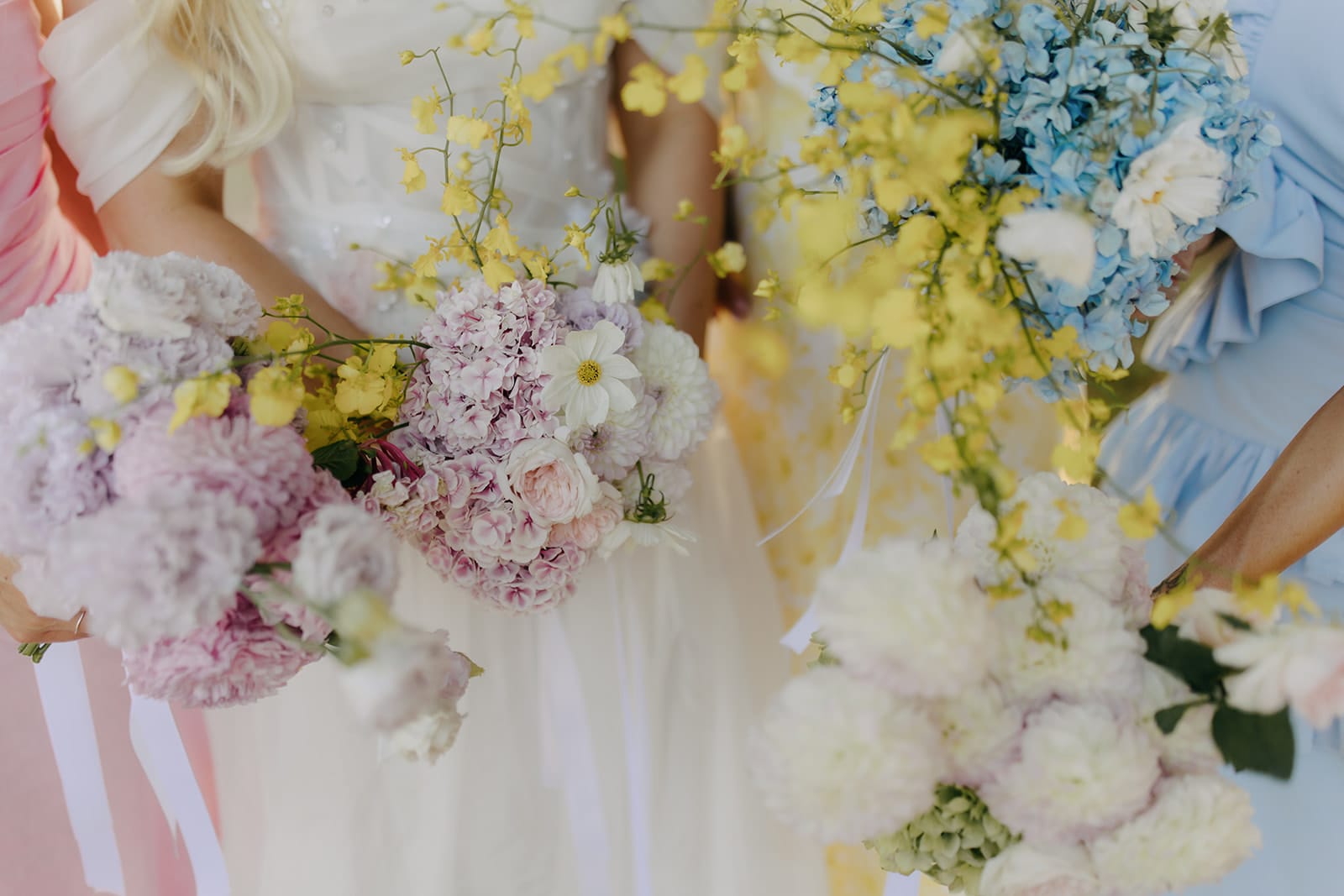 “I loved the idea of introducing colour and fun through the flowers and outfits,” Hannah told us. “My bridesmaids wore Gorman, which I love for their hectic prints and colours, and Ross at Bloom Boy really nailed the colourful whimsical vibe I was going for on the flowers.”