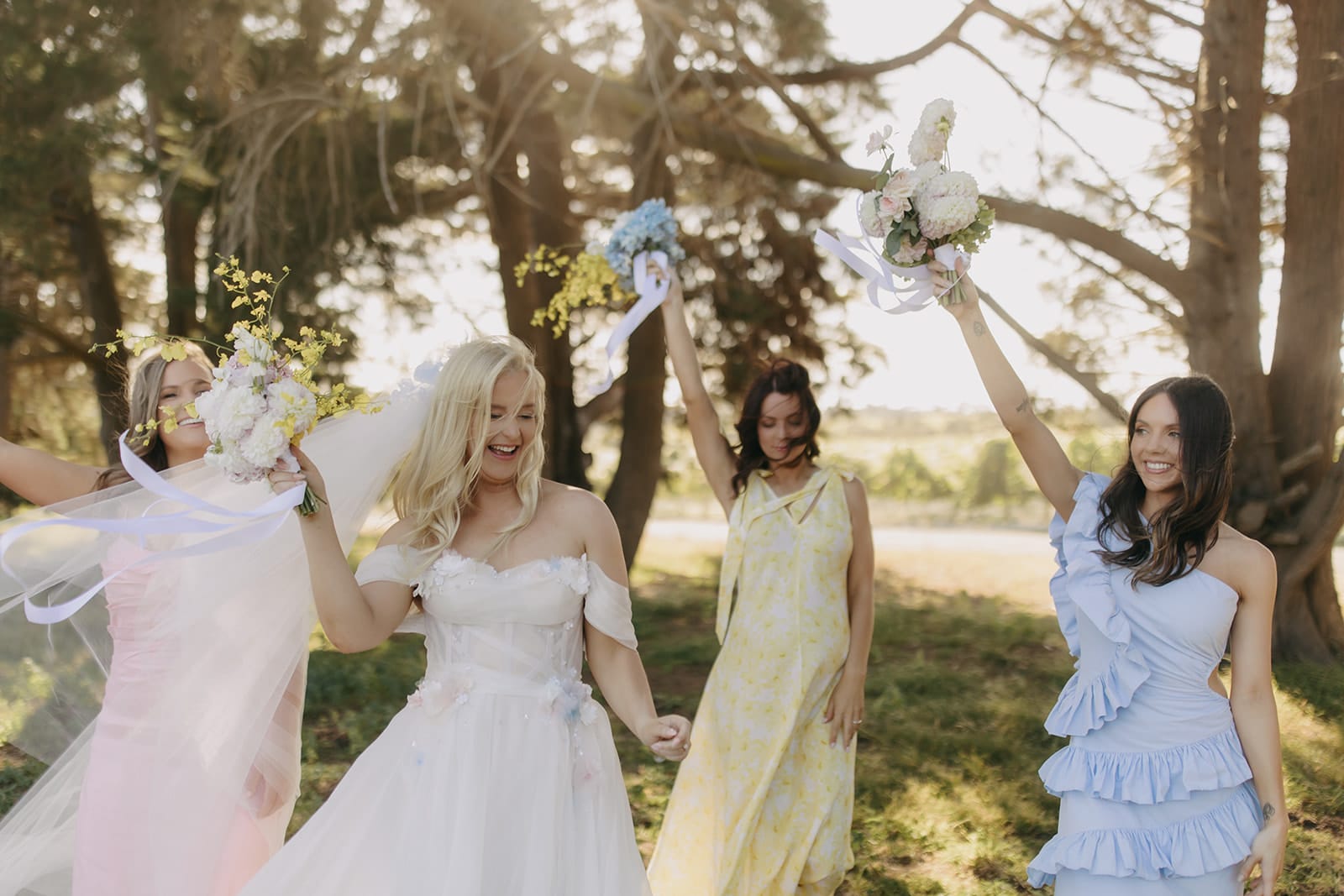 Colour and music were the main focus for Annabel and Will when planning their wedding at Mitchelton Winery in Nagambie. And Annabel’s wedding party clearly nailed the brief when it came to colour – the bold, block shades popping against the florals from Honesty Flora.