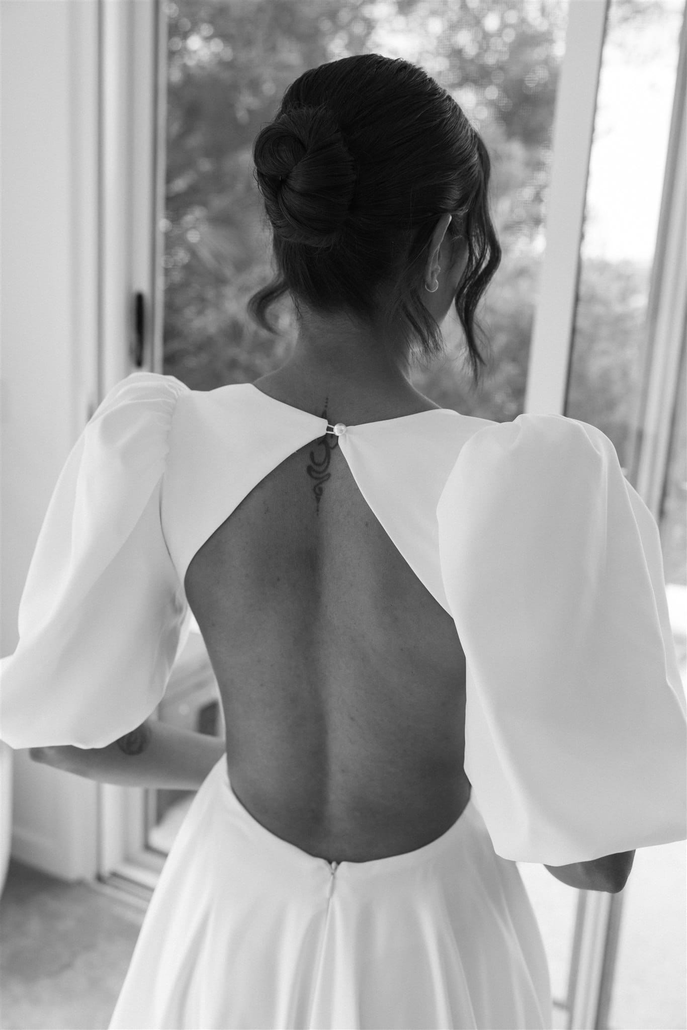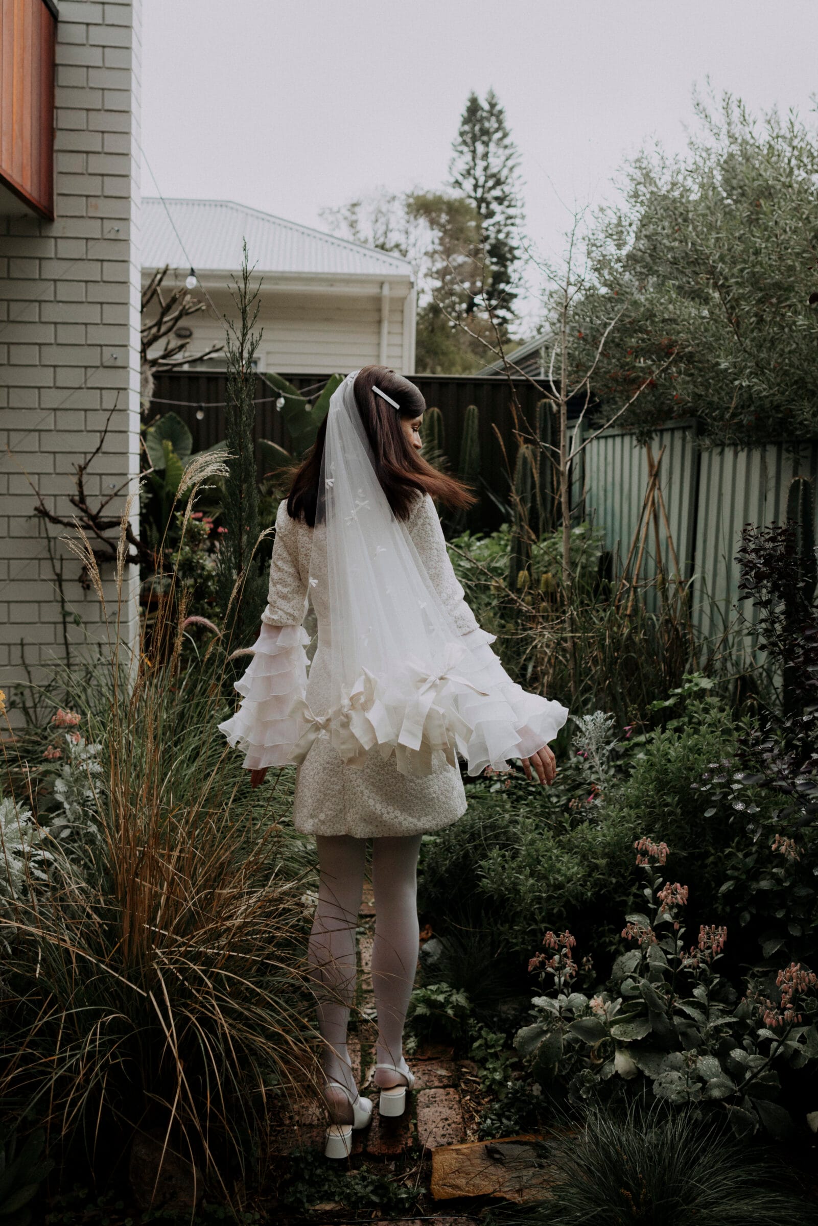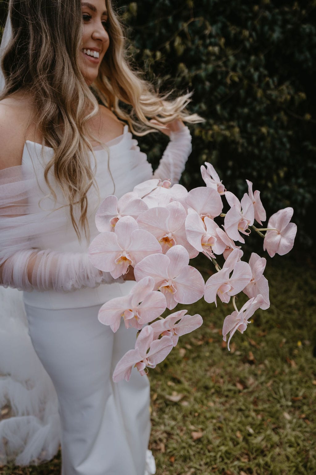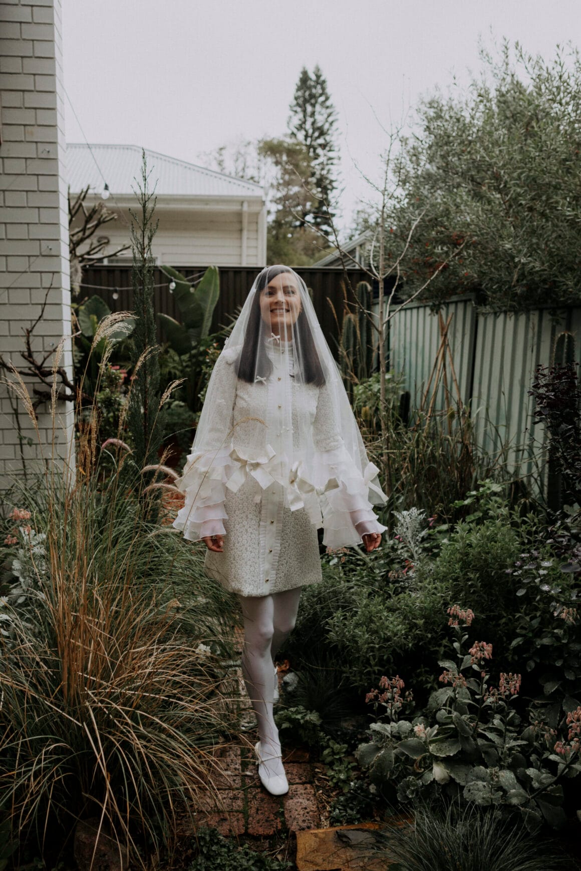 “The dress is a KYHA Studios design, with an added tulle bow at the back. After circling around many other styles, I returned back to the style I originally pictured myself in. I found trusting my initial feelings was the key. I also shopped alone and would highly recommend! It was so good to have an honest, professional opinion, unwaivered by the fear of offending other’s who are expressing their opinions if I had come with a group. The tulle bow came from a love of the ‘dramatic veil blowing in the wind’ vibe, however I knew anything on my head would annoy me, not to mention my hairstyle being less than ideal for fixing a veil to. The answer to this was about 7m of tulle from Spotlight, press-studded into the back of the existing tulle component of the dress.”