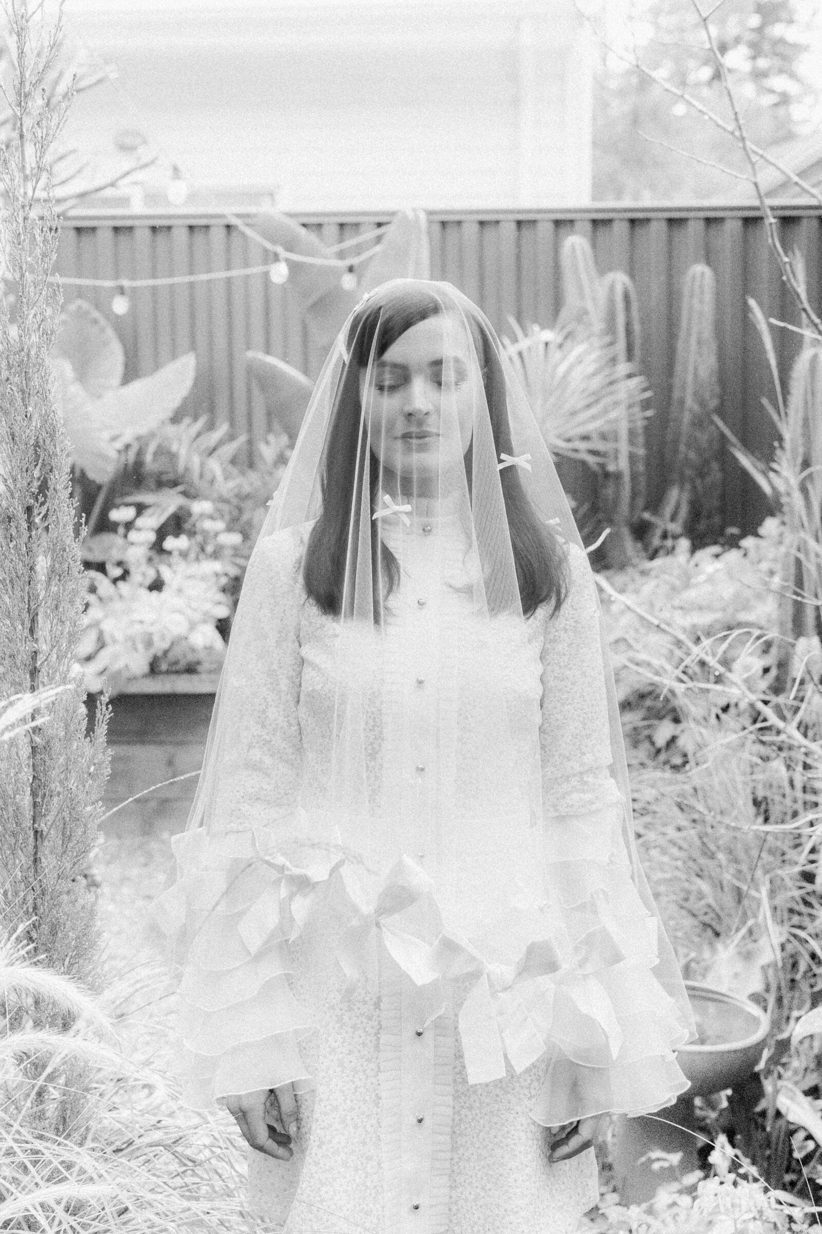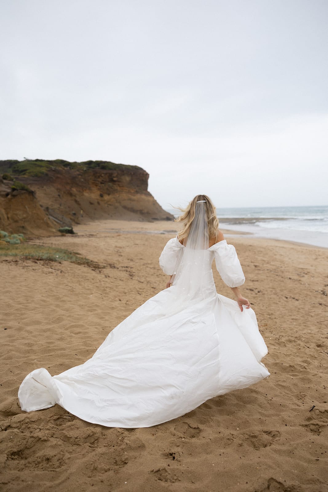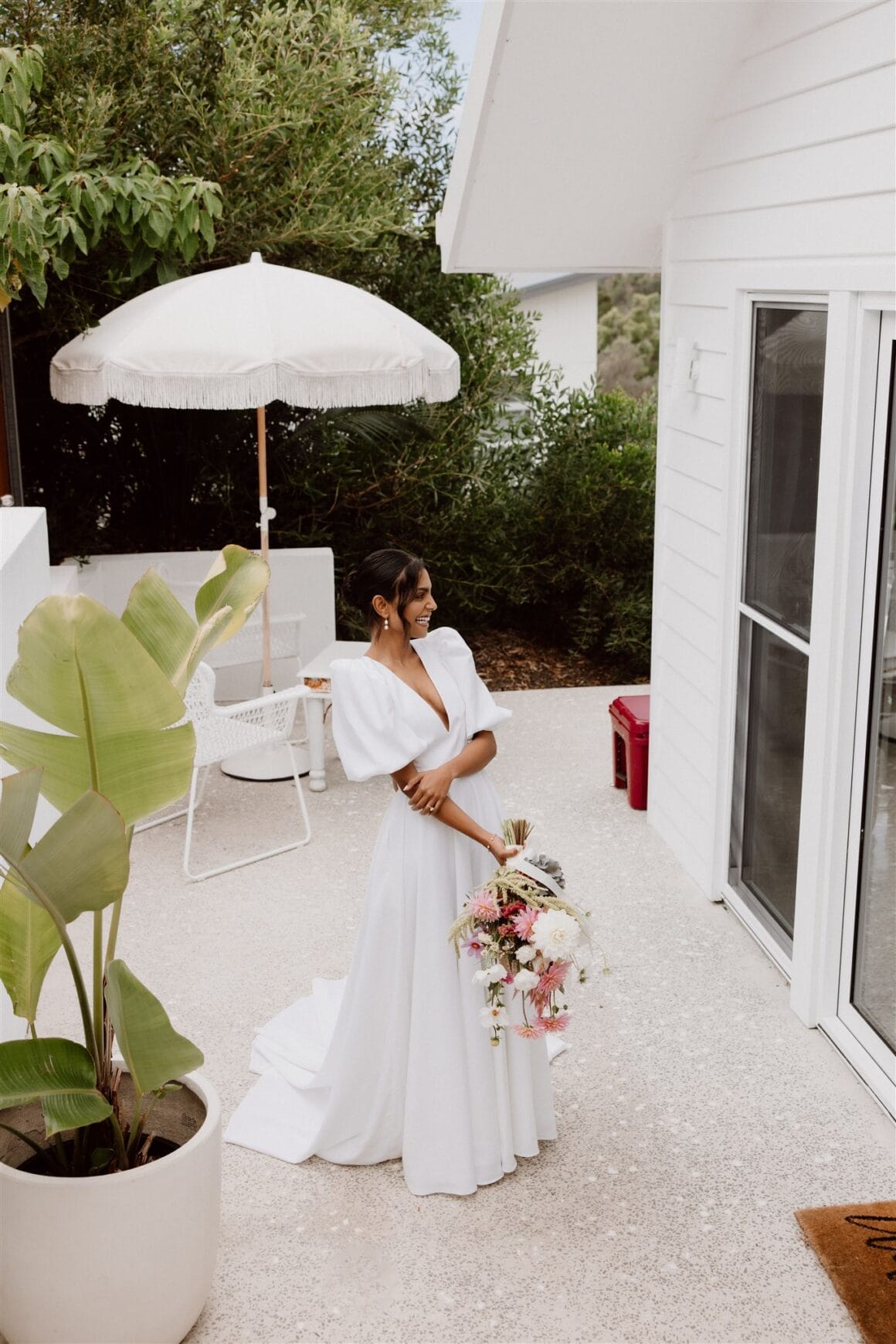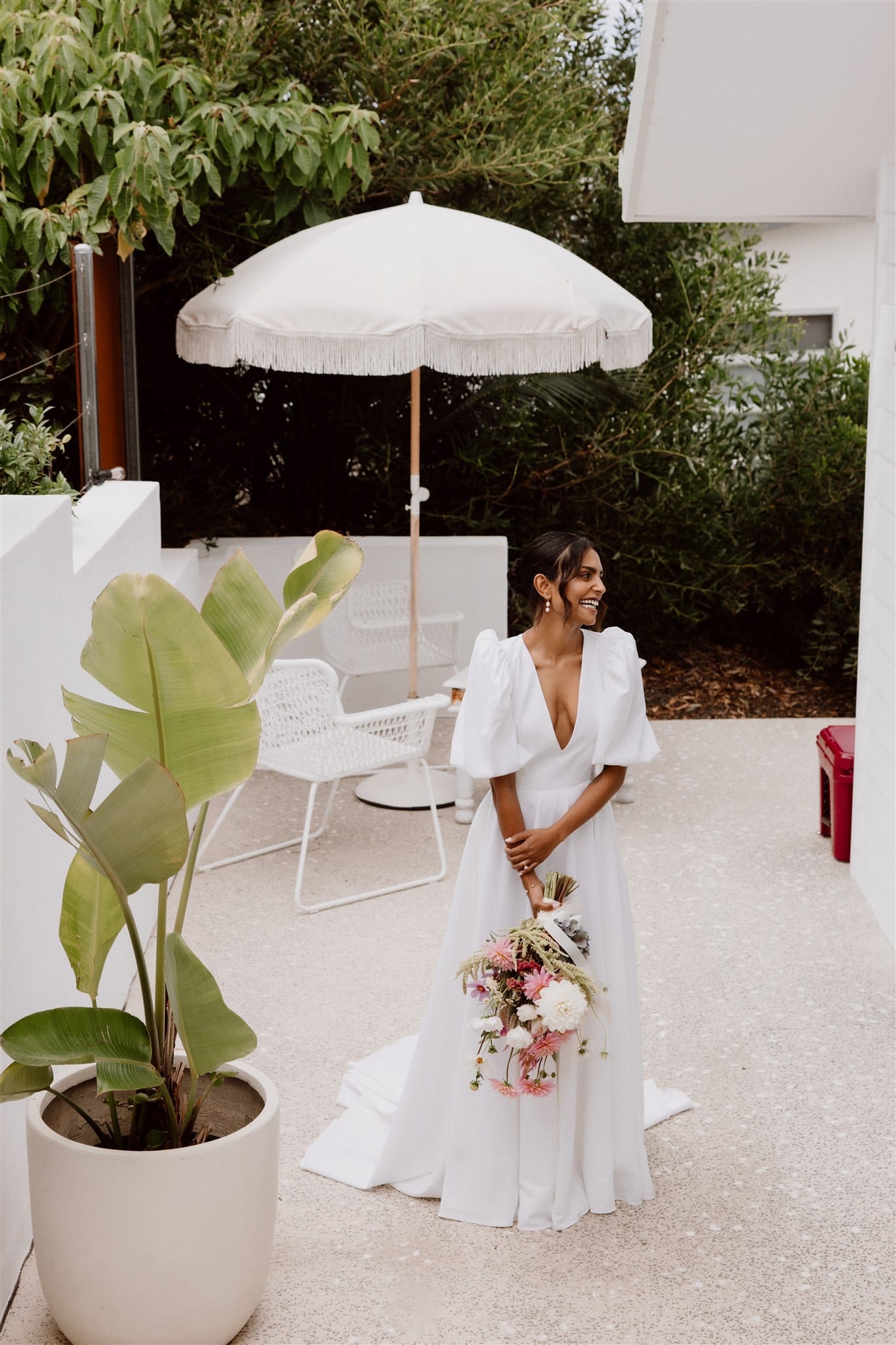 “The dress is a KYHA Studios design, with an added tulle bow at the back. After circling around many other styles, I returned back to the style I originally pictured myself in. I found trusting my initial feelings was the key. I also shopped alone and would highly recommend! It was so good to have an honest, professional opinion, unwaivered by the fear of offending other’s who are expressing their opinions if I had come with a group. The tulle bow came from a love of the ‘dramatic veil blowing in the wind’ vibe, however I knew anything on my head would annoy me, not to mention my hairstyle being less than ideal for fixing a veil to. The answer to this was about 7m of tulle from Spotlight, press-studded into the back of the existing tulle component of the dress.”
