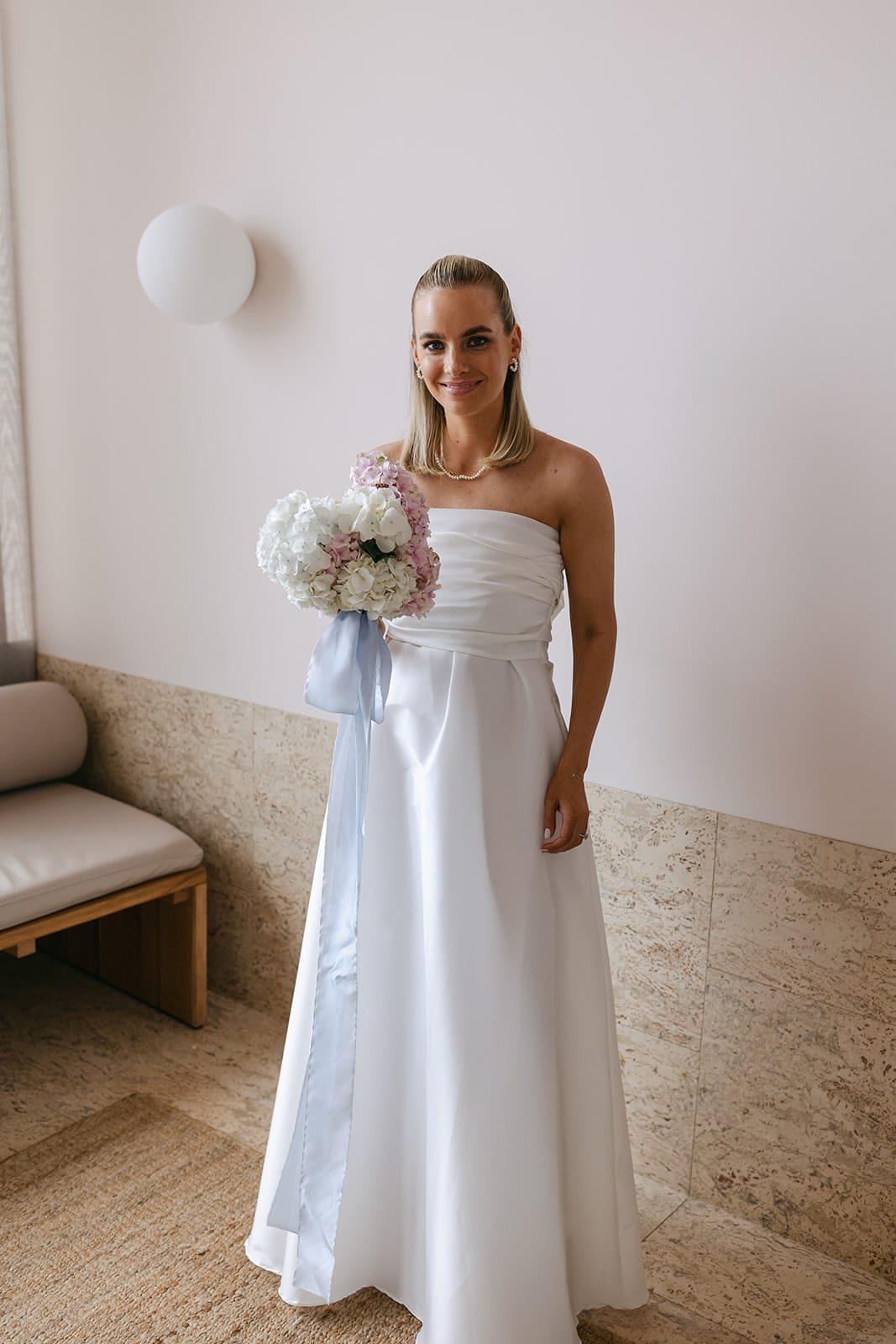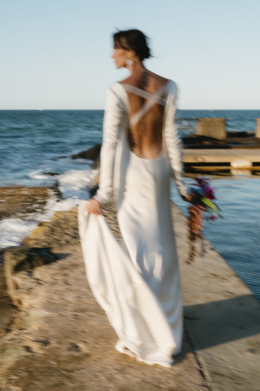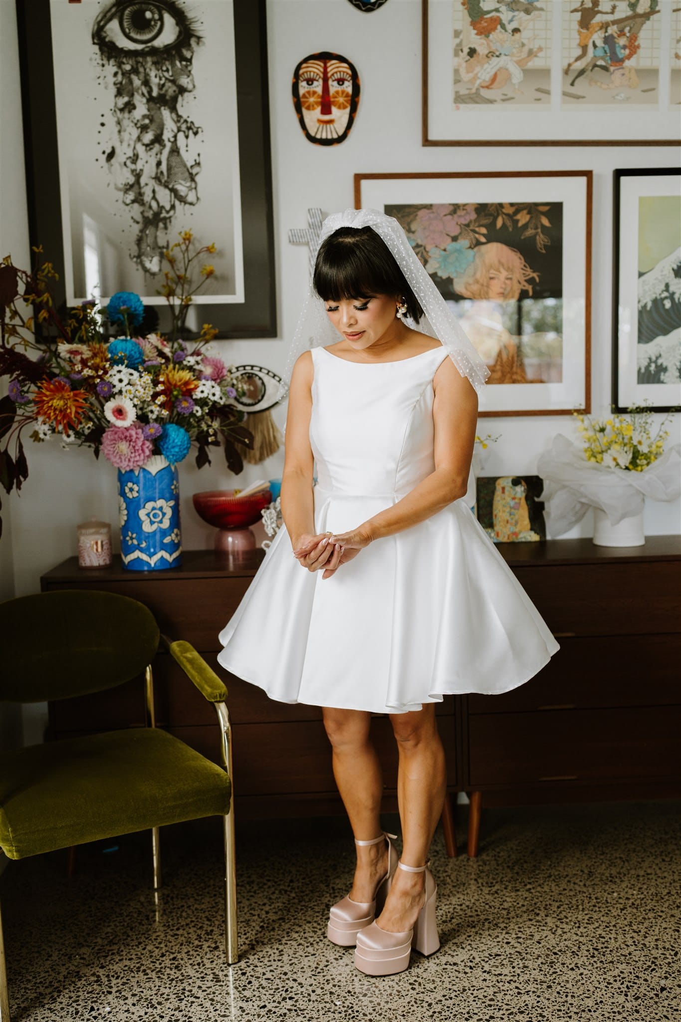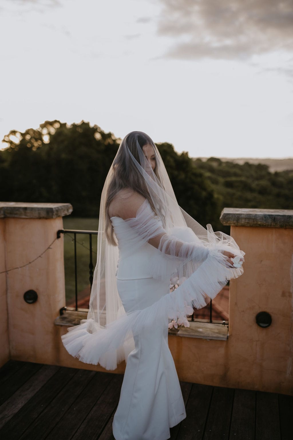 “The dress is a KYHA Studios design, with an added tulle bow at the back. After circling around many other styles, I returned back to the style I originally pictured myself in. I found trusting my initial feelings was the key. I also shopped alone and would highly recommend! It was so good to have an honest, professional opinion, unwaivered by the fear of offending other’s who are expressing their opinions if I had come with a group. The tulle bow came from a love of the ‘dramatic veil blowing in the wind’ vibe, however I knew anything on my head would annoy me, not to mention my hairstyle being less than ideal for fixing a veil to. The answer to this was about 7m of tulle from Spotlight, press-studded into the back of the existing tulle component of the dress.”