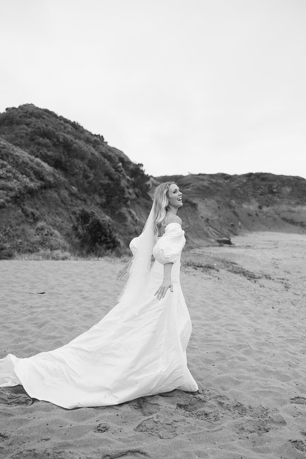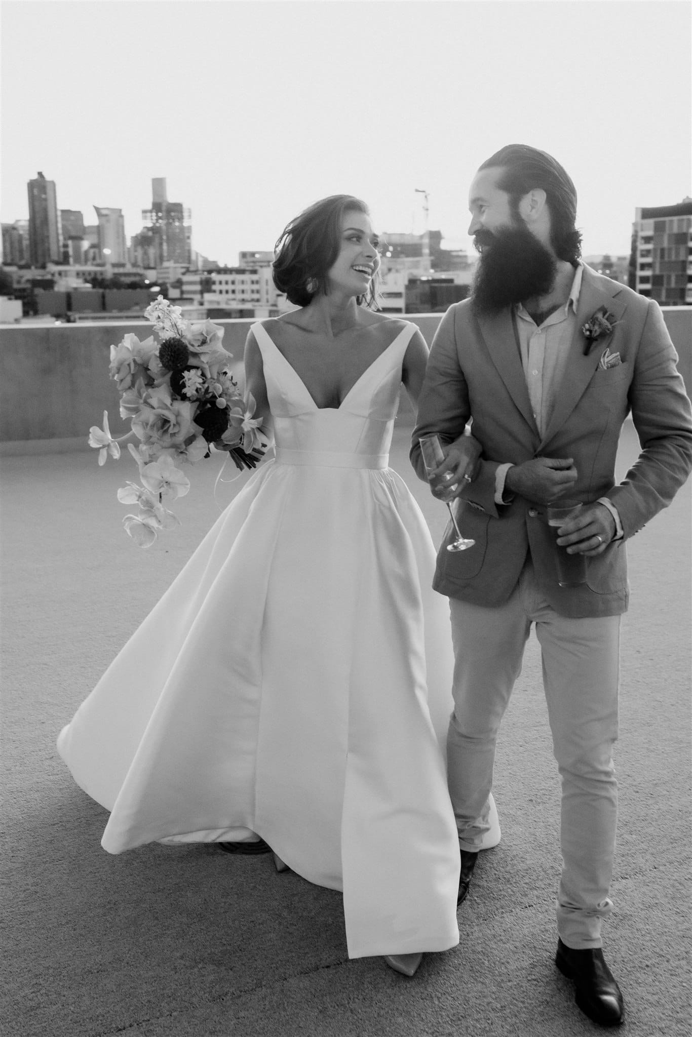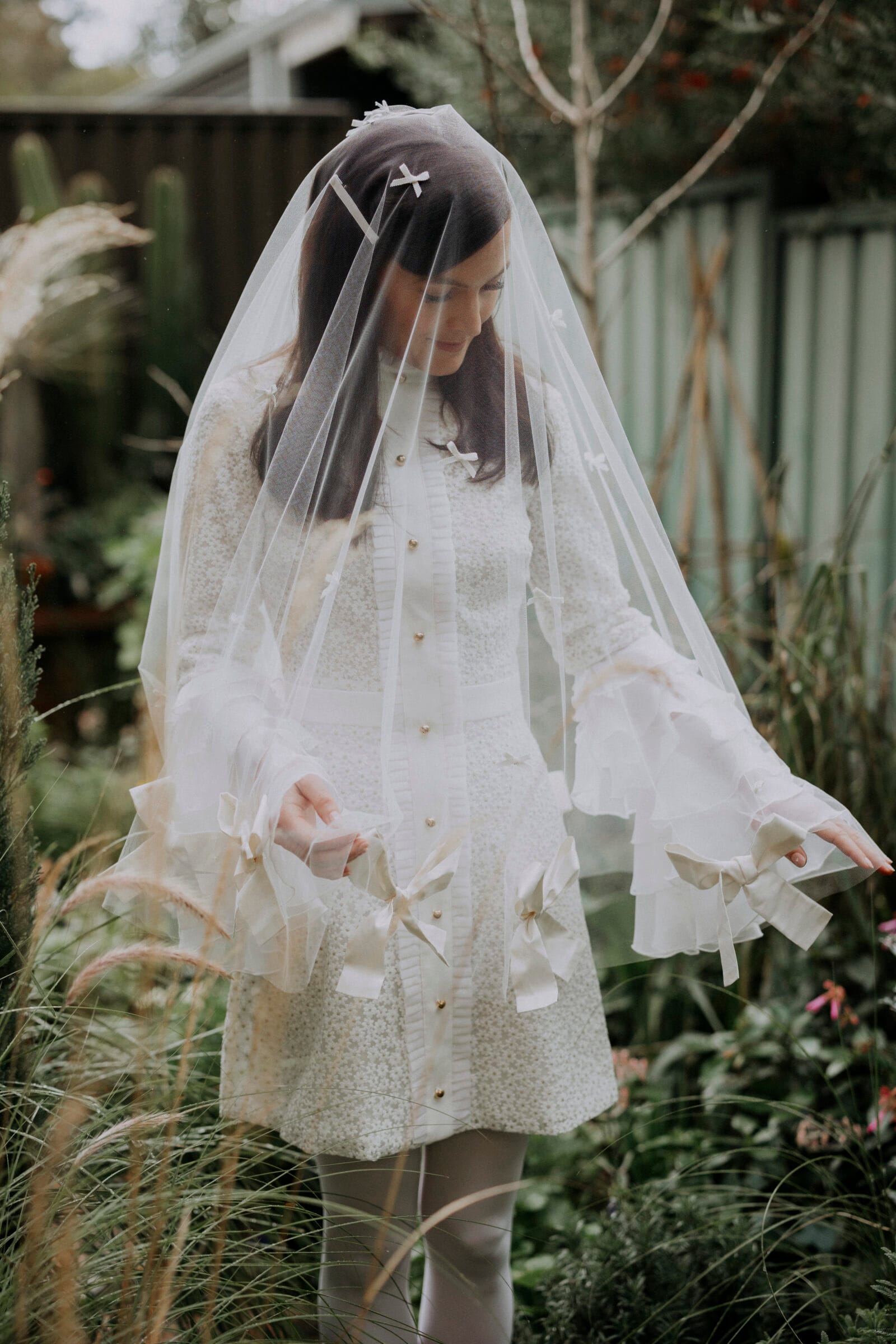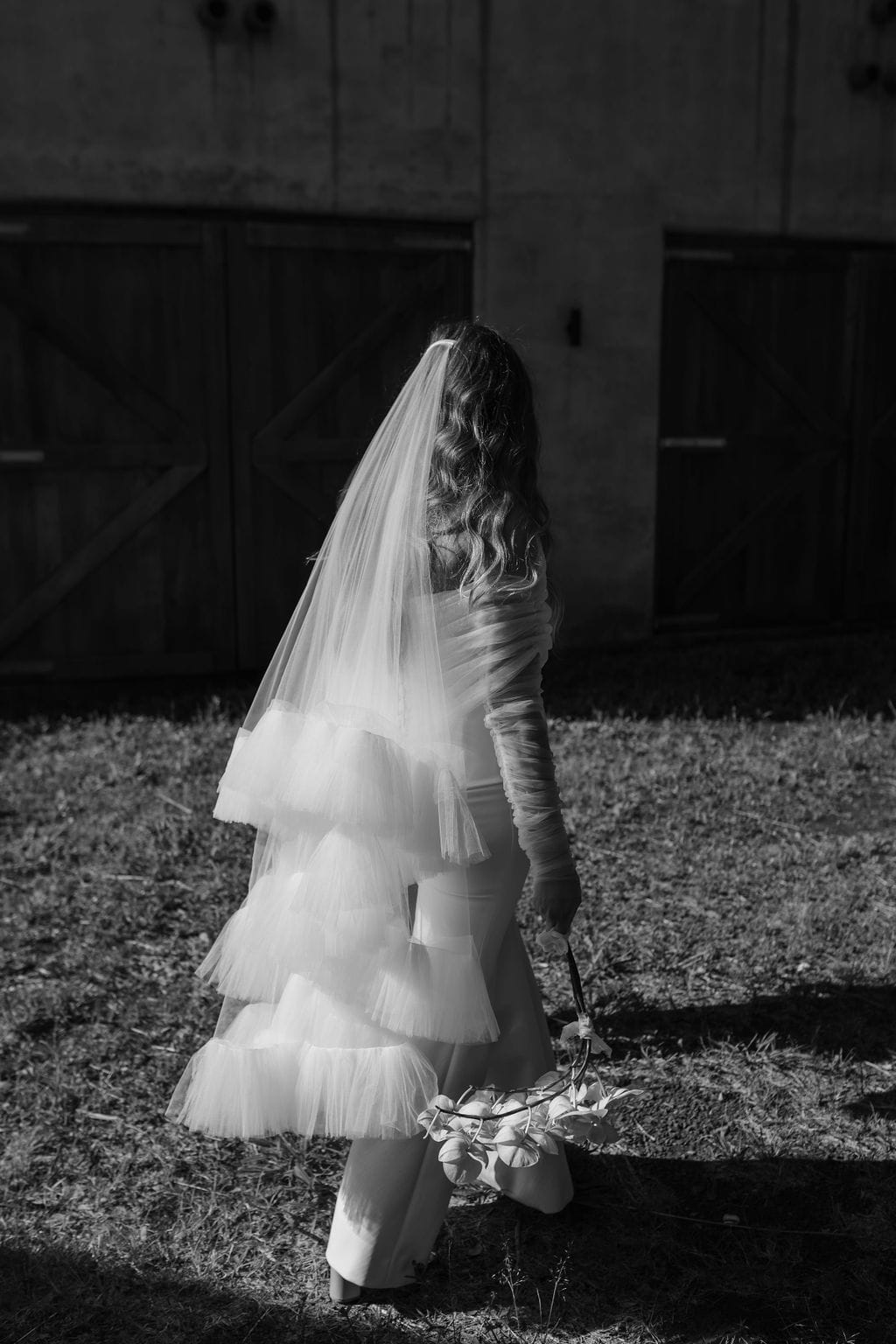 “The dress is a KYHA Studios design, with an added tulle bow at the back. After circling around many other styles, I returned back to the style I originally pictured myself in. I found trusting my initial feelings was the key. I also shopped alone and would highly recommend! It was so good to have an honest, professional opinion, unwaivered by the fear of offending other’s who are expressing their opinions if I had come with a group. The tulle bow came from a love of the ‘dramatic veil blowing in the wind’ vibe, however I knew anything on my head would annoy me, not to mention my hairstyle being less than ideal for fixing a veil to. The answer to this was about 7m of tulle from Spotlight, press-studded into the back of the existing tulle component of the dress.”