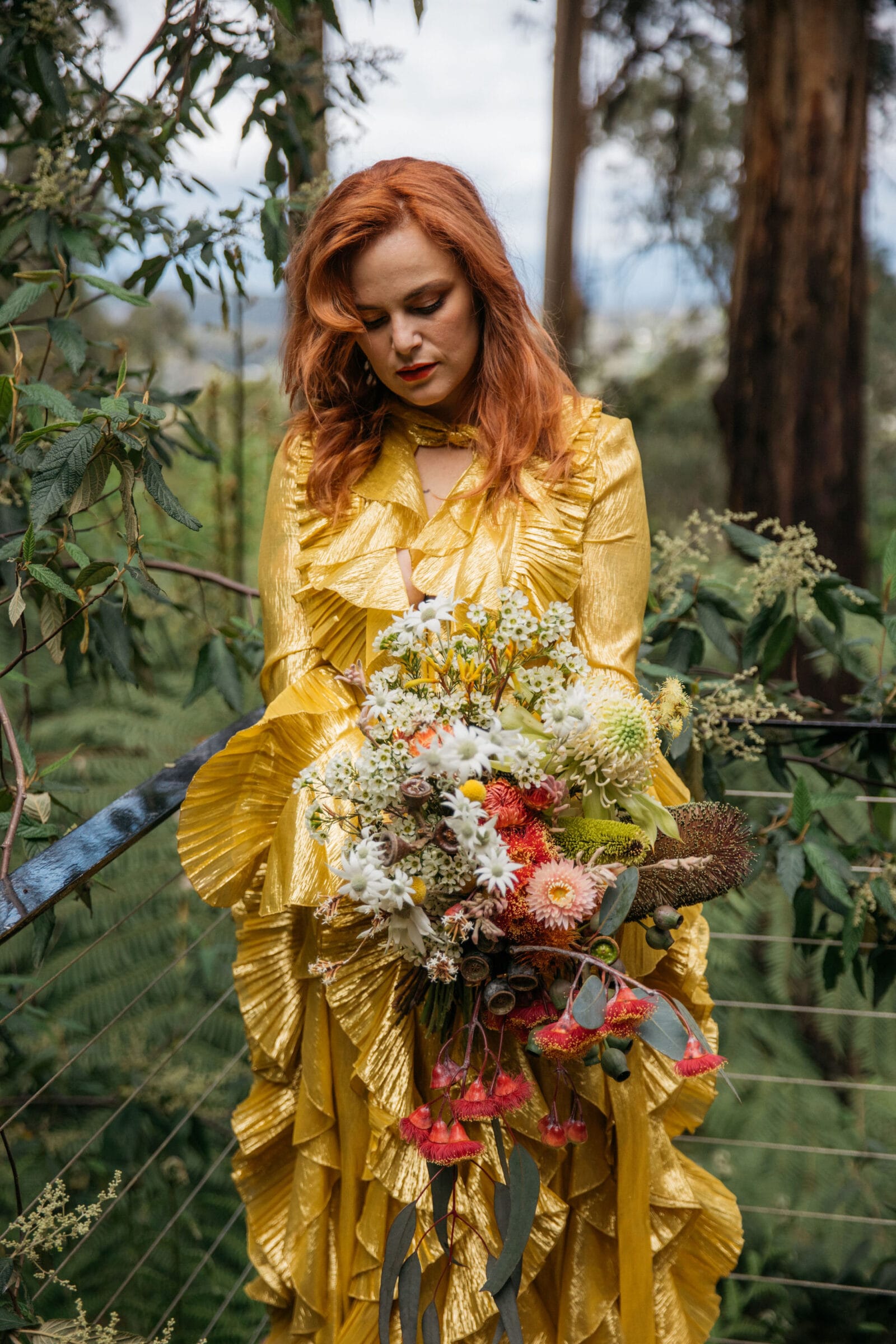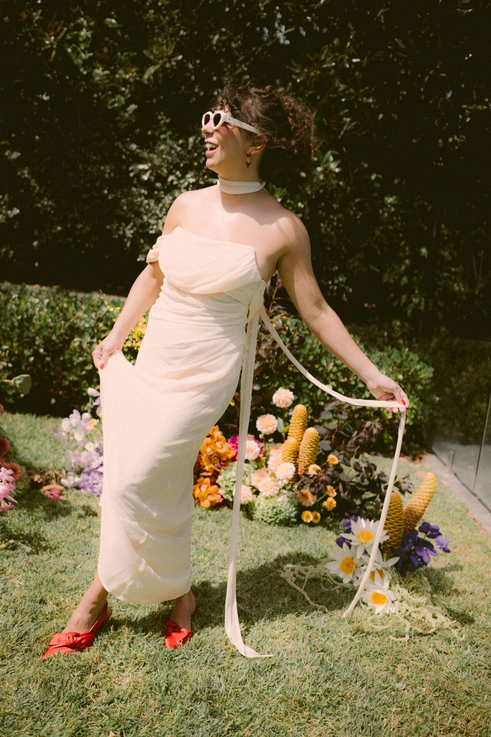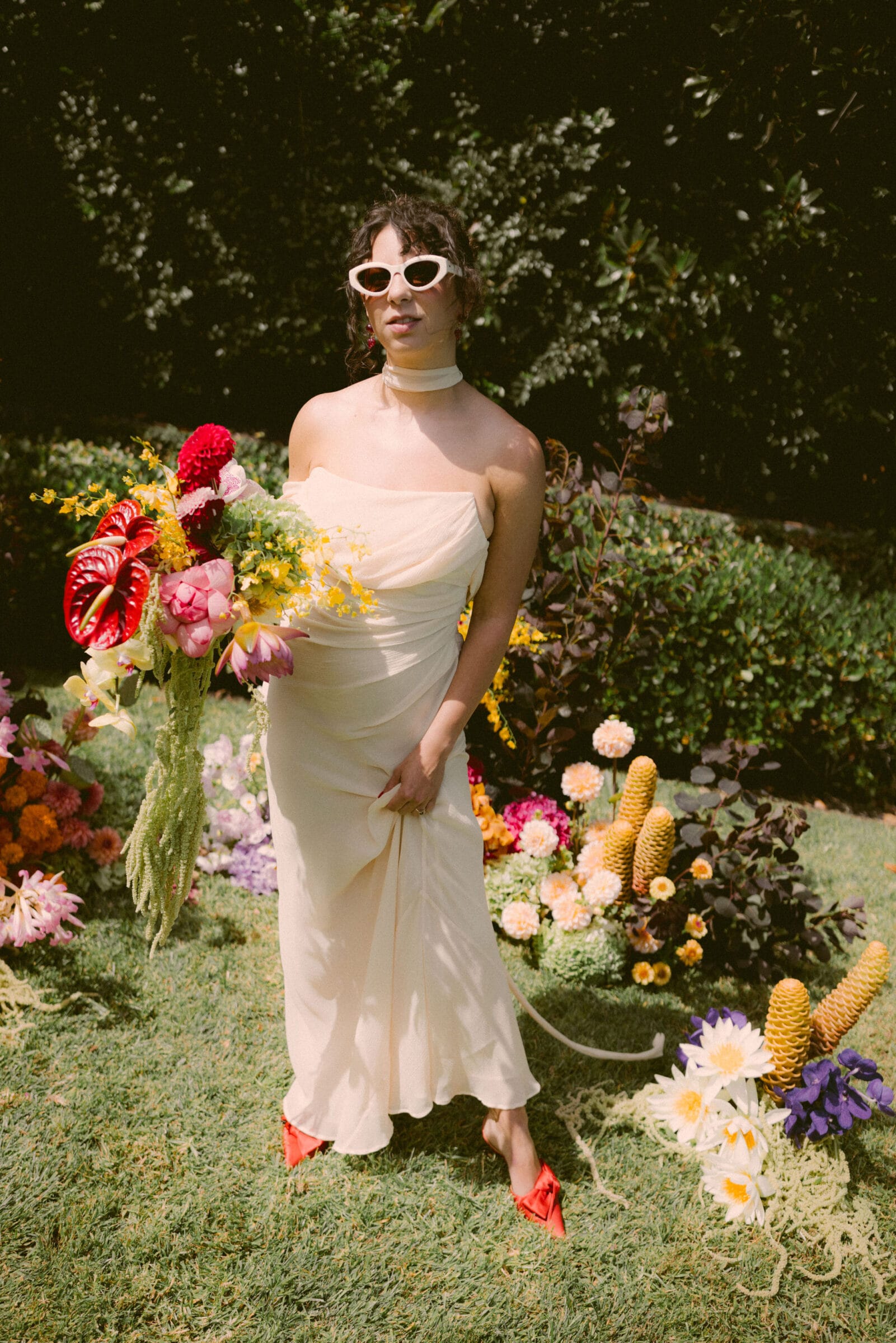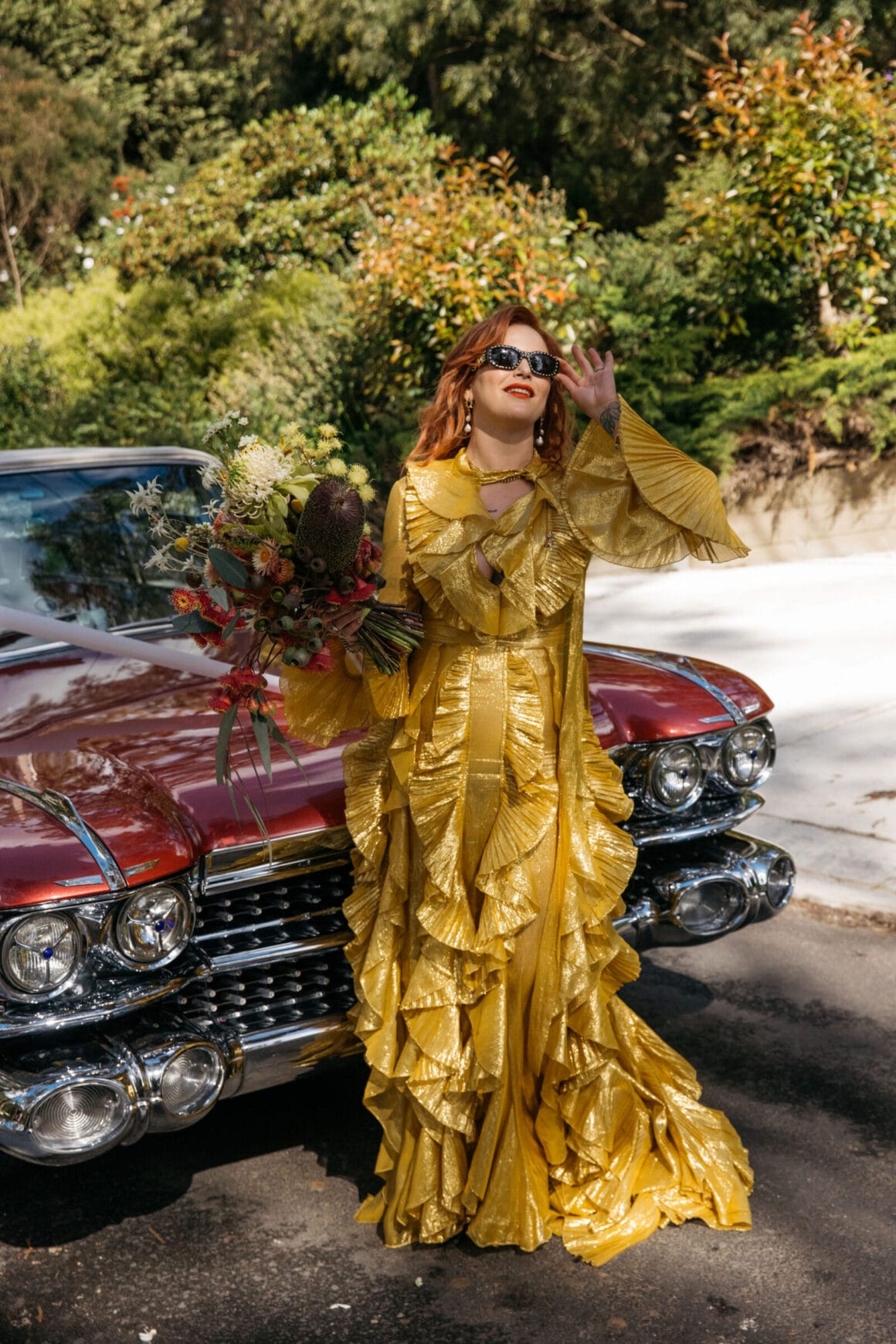 “A Melbourne designer called Seeley designed it. I wanted something nontraditional with colour and an interesting silhouette. They made a few sketches and we looked for silk that matched the buttery yellow. Once we had the dress completed, we added the neck fabric for the ’90s vibe I was looking for to tie it together. Seeley understood my brief was and took it to the next level!”