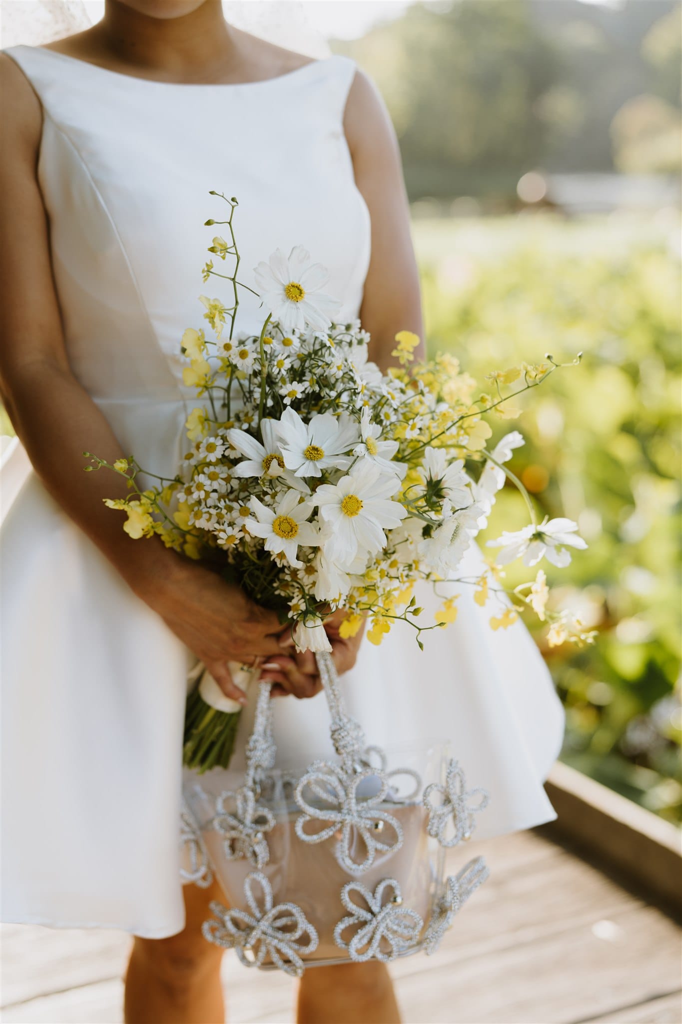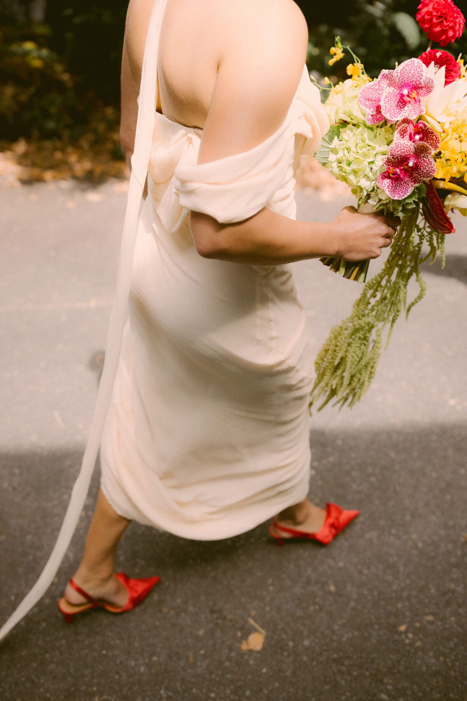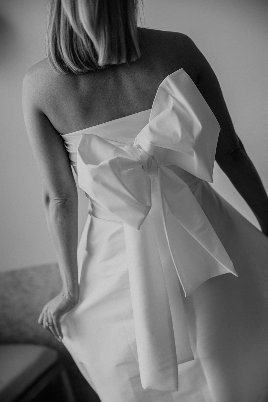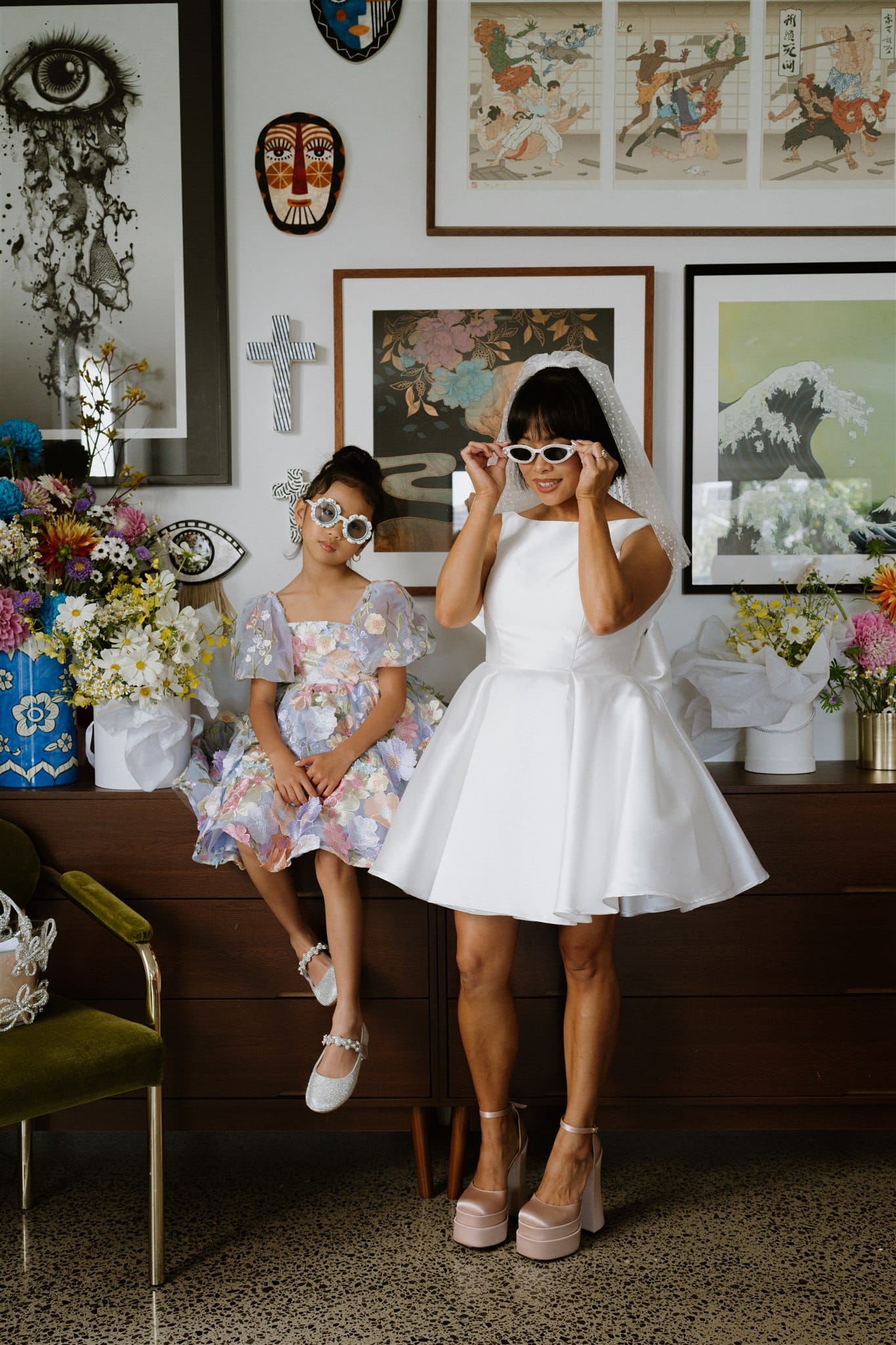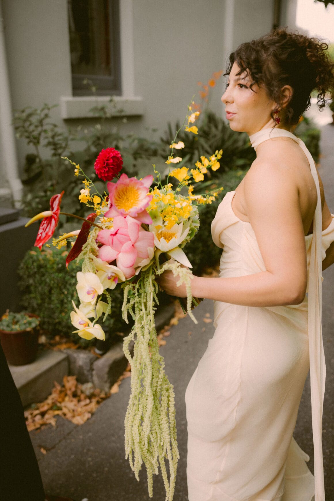 “A Melbourne designer called Seeley designed it. I wanted something nontraditional with colour and an interesting silhouette. They made a few sketches and we looked for silk that matched the buttery yellow. Once we had the dress completed, we added the neck fabric for the ’90s vibe I was looking for to tie it together. Seeley understood my brief was and took it to the next level!”