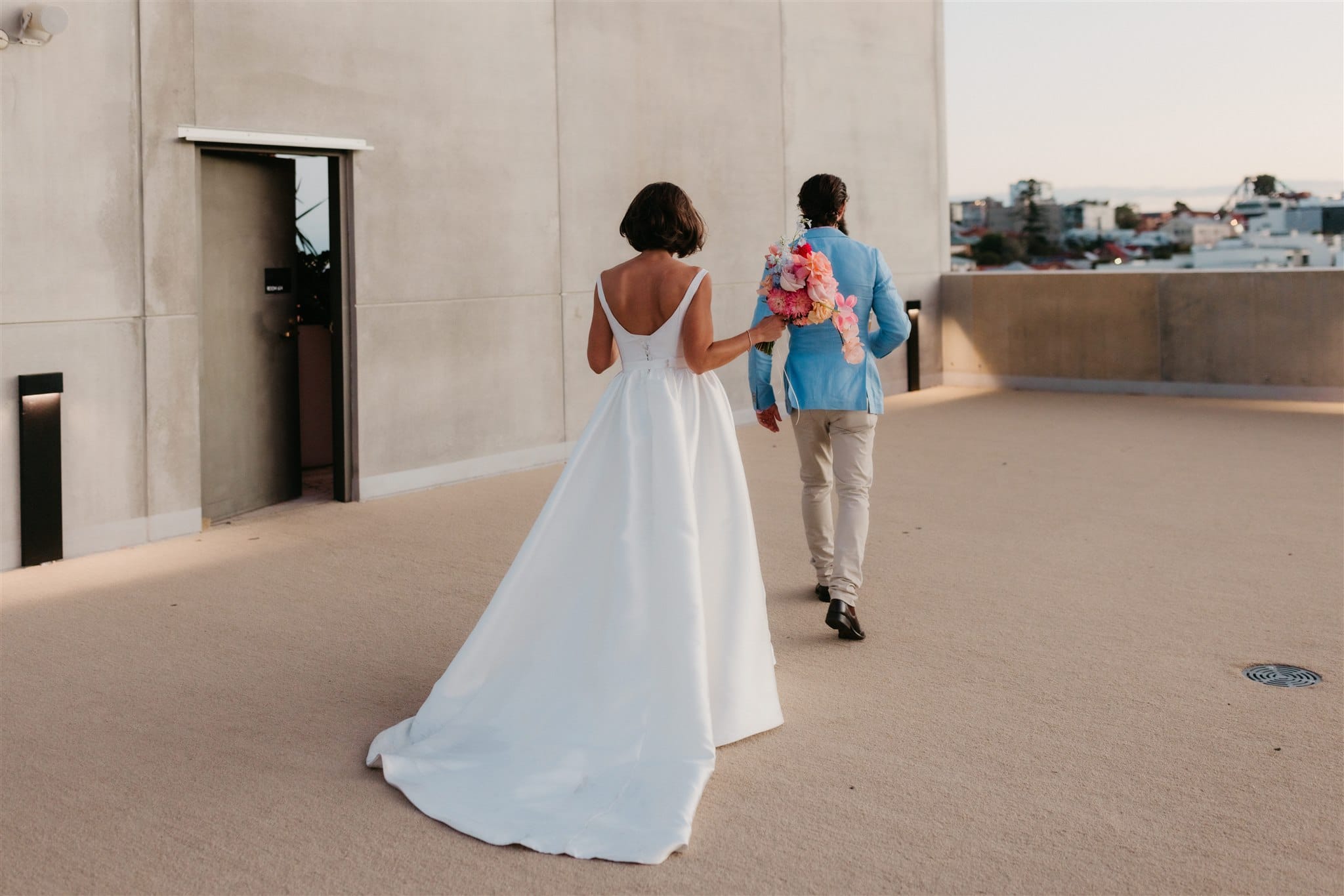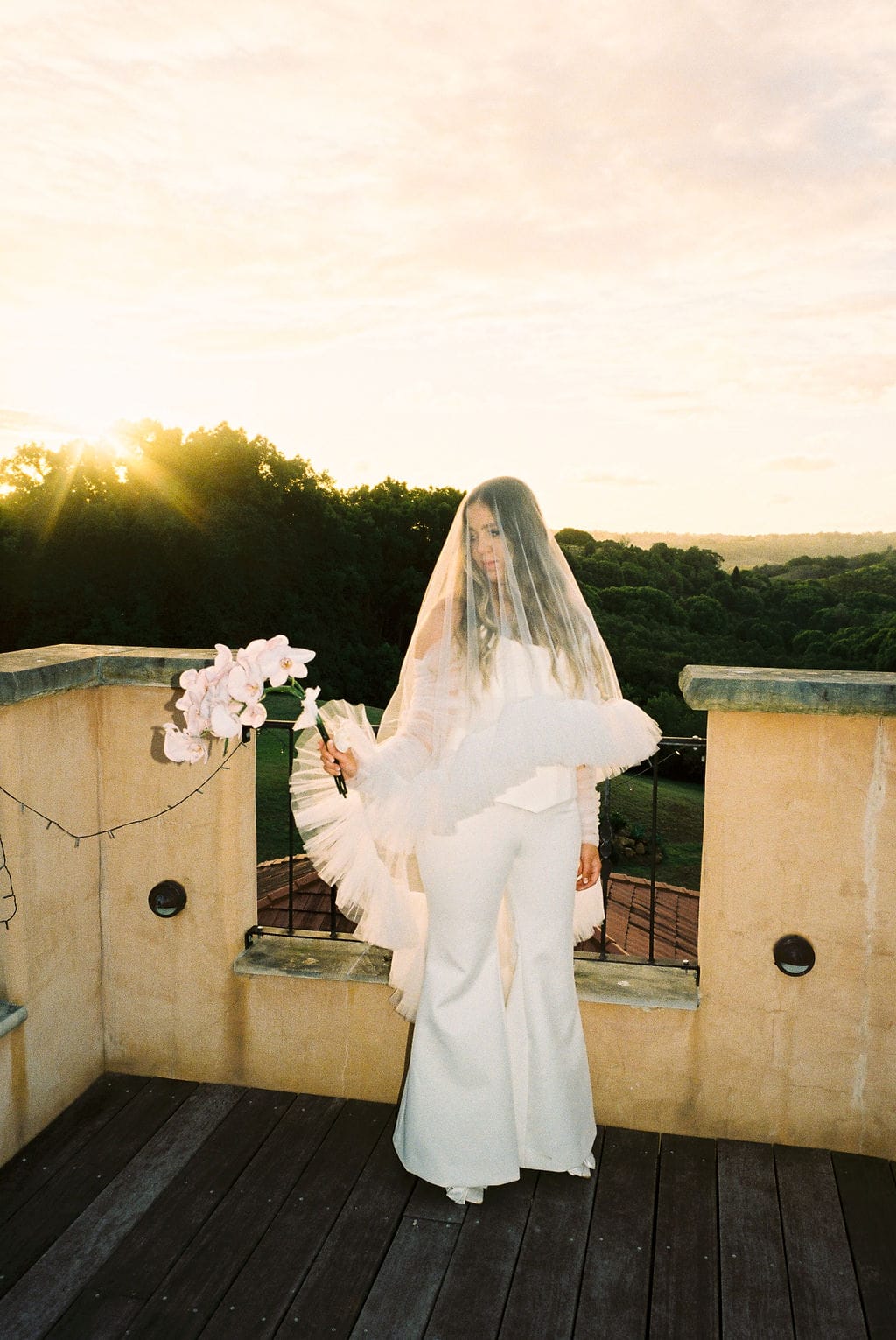 “I was very inspired by Kendall Jenner’s off-white jumpsuit from the 2018 Met Gala. I looked online at various bridal (and non-bridal) stores and didn’t find exactly what I was after, so I thought I would see if someone could make me a custom outfit. Mariam Seddiq was only the second designer that I enquired with. Whilst not typically a ‘bridal’ designer – at the time she had done one bridal collection (there are more now!), that collection along with her general collection in pop colours were in the style and silhouettes of what I was after. I loved helping to design something that was mine. Fabrics, buttons, cuts and silhouettes all decided with my input – not to mention it was made to fit my body perfectly.”