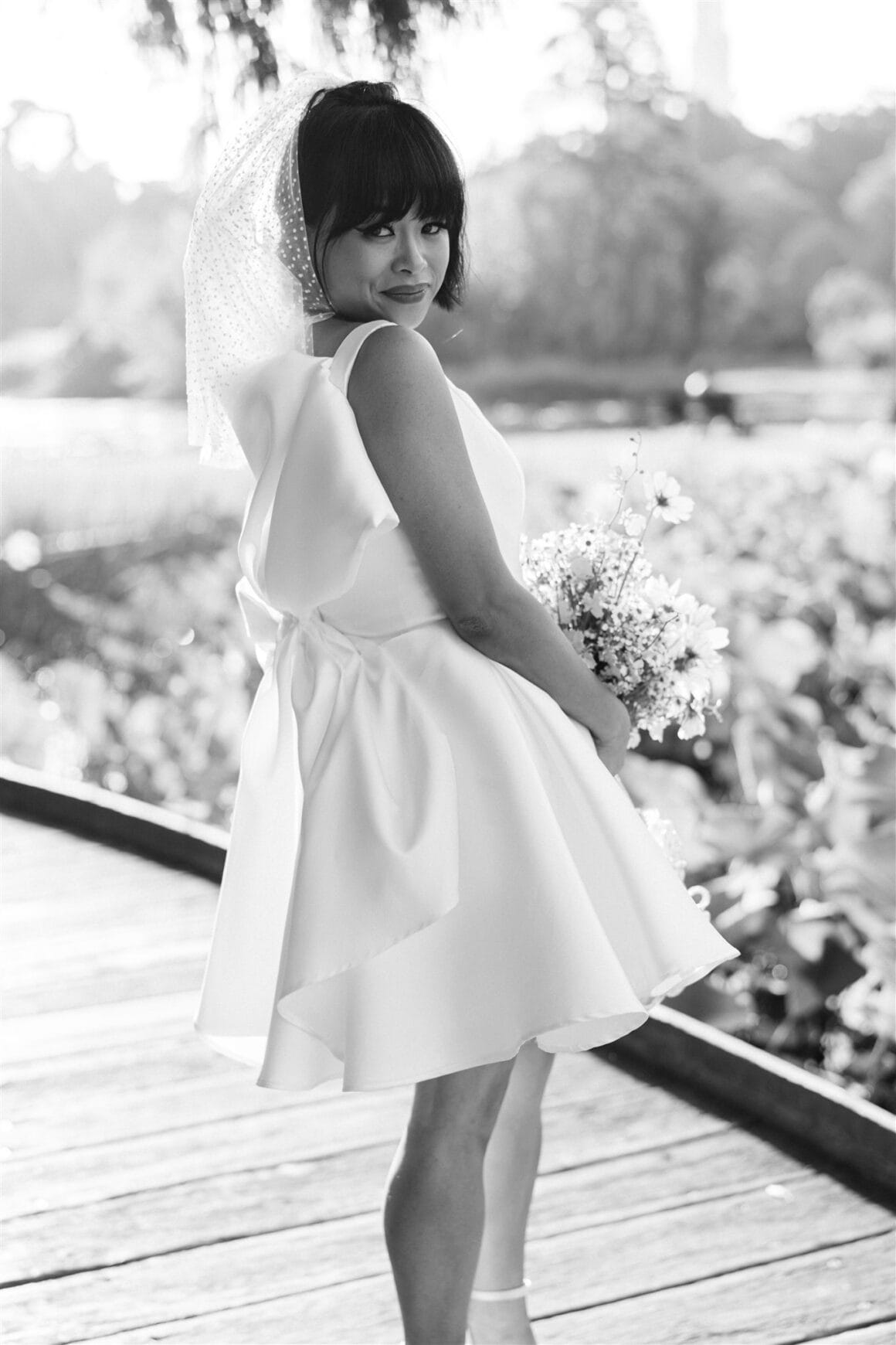 “I always knew I wanted to wear a short dress that was ’60s-inspired, so the journey started with spending lots of nights on Pinterest. The overall experience [was] nerve-racking because it didn’t come together until the very last fit, and even then, I was still unsure. But on the wedding day, it was very obvious to myself and everyone who attended that the Stephanie Biance Couture was exactly ‘me’.”