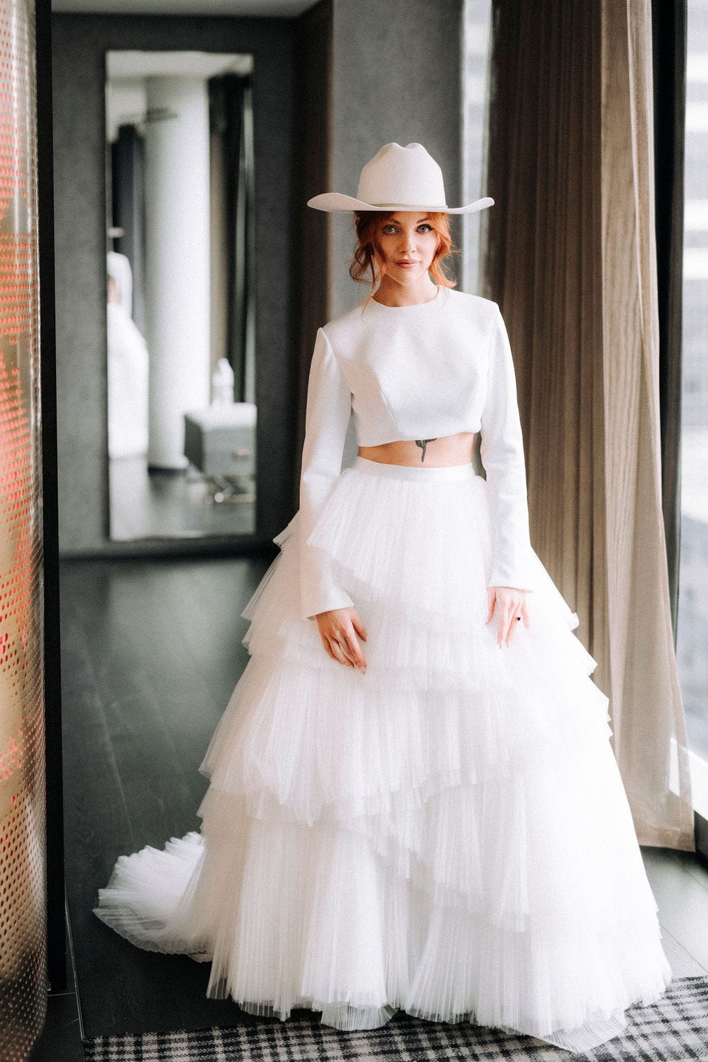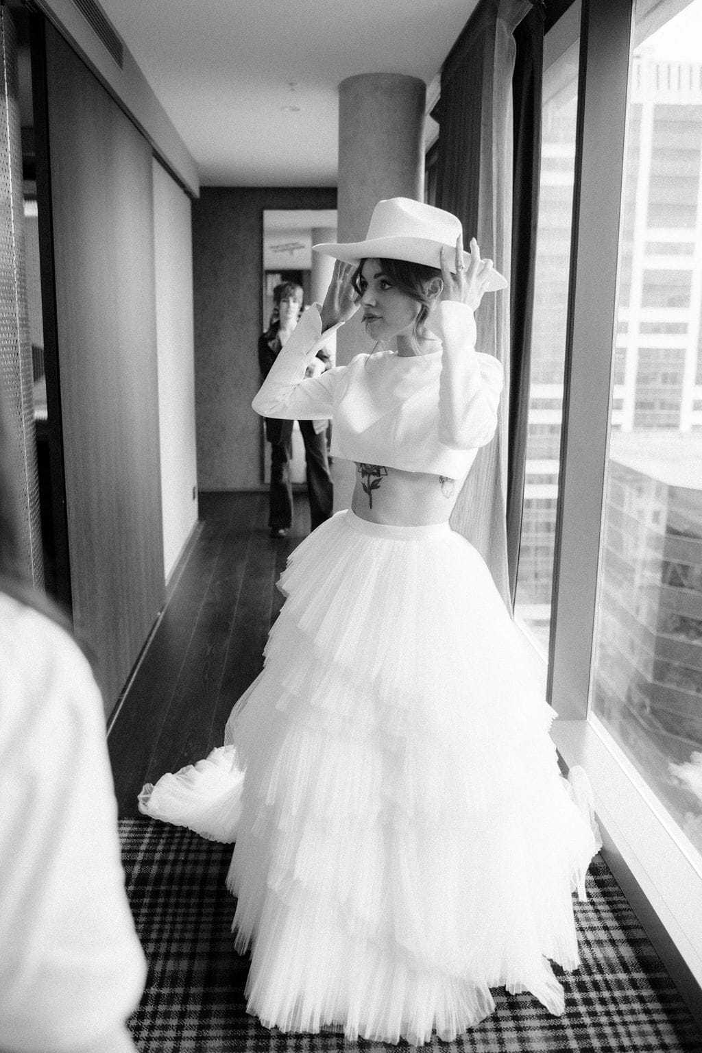 “I always knew I would wear cowboy boots and a cowboy hat (a nod to my love of riding). Then it was a matter of finding the perfect outfits to go with them. I fell in love with the KYHA Millie Skirt and knew it was the one before I even tried it on. I then complemented it with the most perfect custom top and later suit from Vasiliki Couture. Vicki from Vasiliki Couture was just gorgeous.”