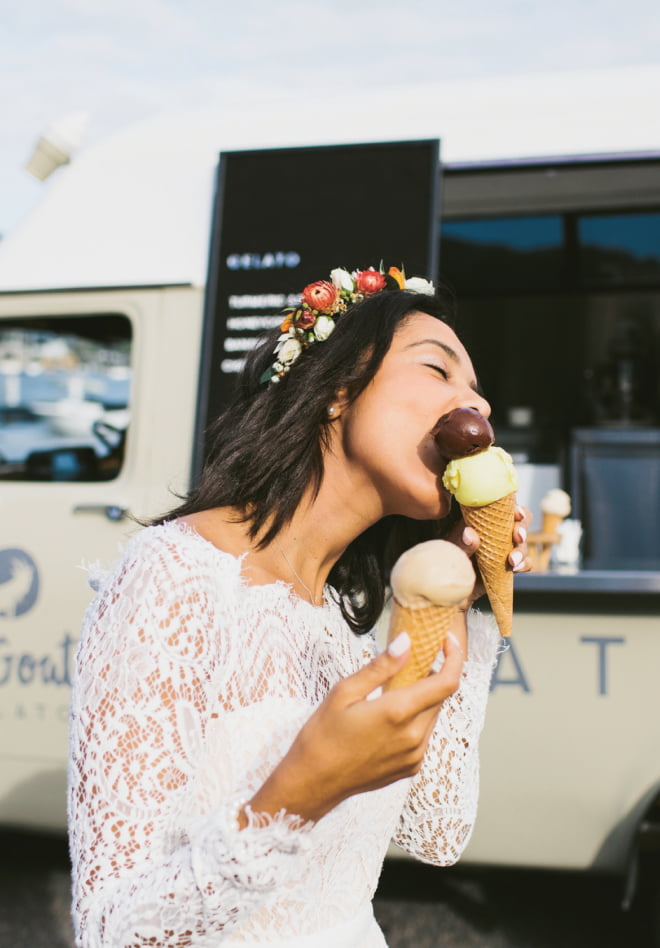 From traditional cakes (like the delicious Miss Lady Bird Cakes creation directly below) to gelato (hey there Mr Goaty, above) and even handmade rolled wagon wheels (thank you Black Pantry!), we’re bringing you ideas for delicious desserts in all shapes and sizes. And by dessert, we are of course referring to everything from the third course on your menu, to your cake – or version of – and even flavoursome wedding favours for your guests to take home.