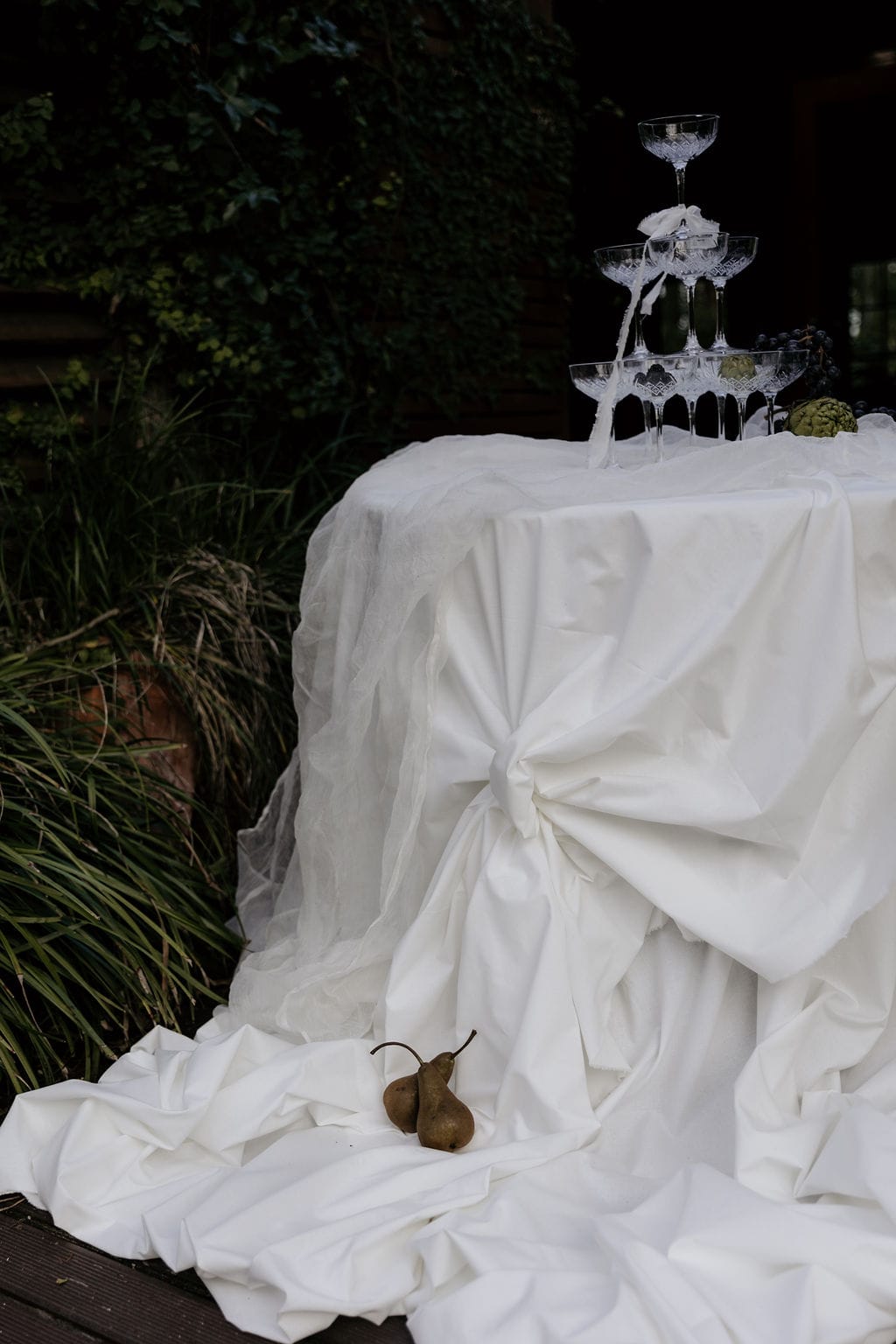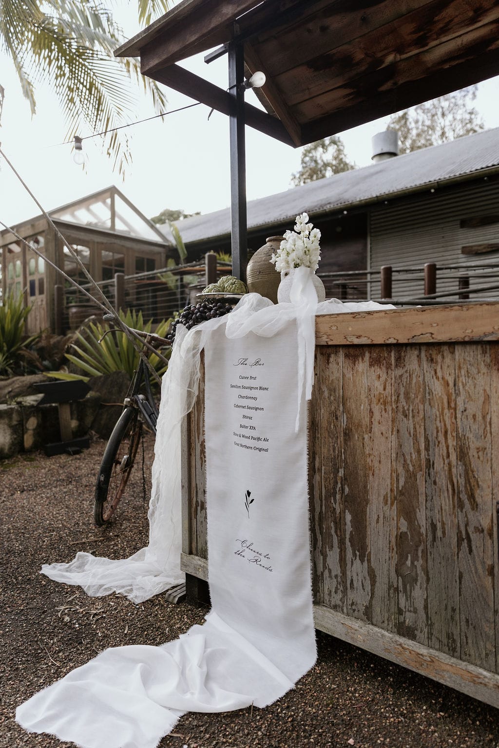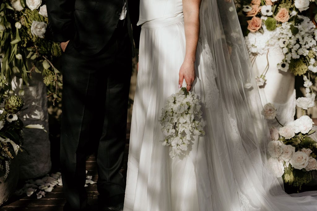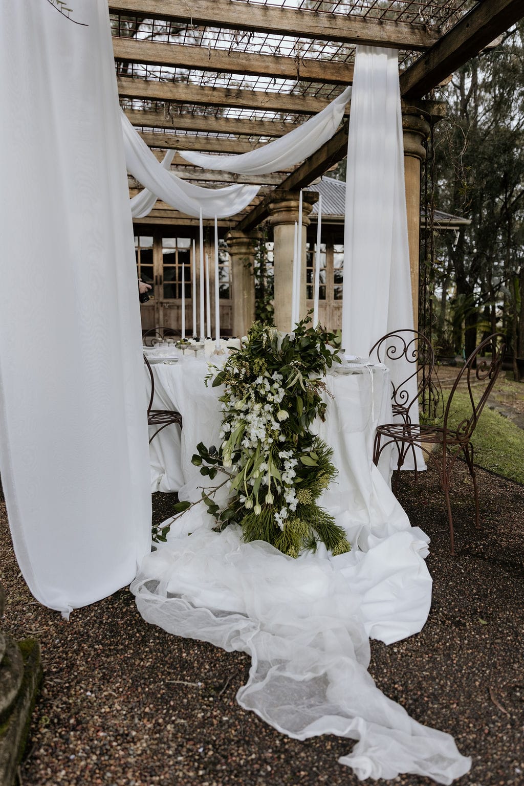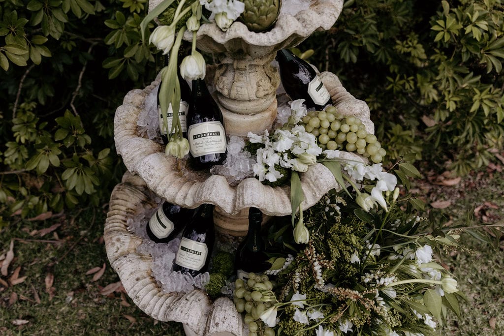 Hunter Valley-based stylist Sugar Blossom Events’ style is naturally ethereal, romantic and timeless with a touch of whimsy. When working on this shoot, the prominent, European architectural features of the colonnade present at venue Leaves & Fishes took centrestage. “They are softened with delicate draping, immersive sunset, and natural, effortless blooms. Wrapped in these romantic surrounds, this love story unfolds, exploring the decadence, playfulness and celebration that shape the fabric of this beautiful life,” says Giselle.