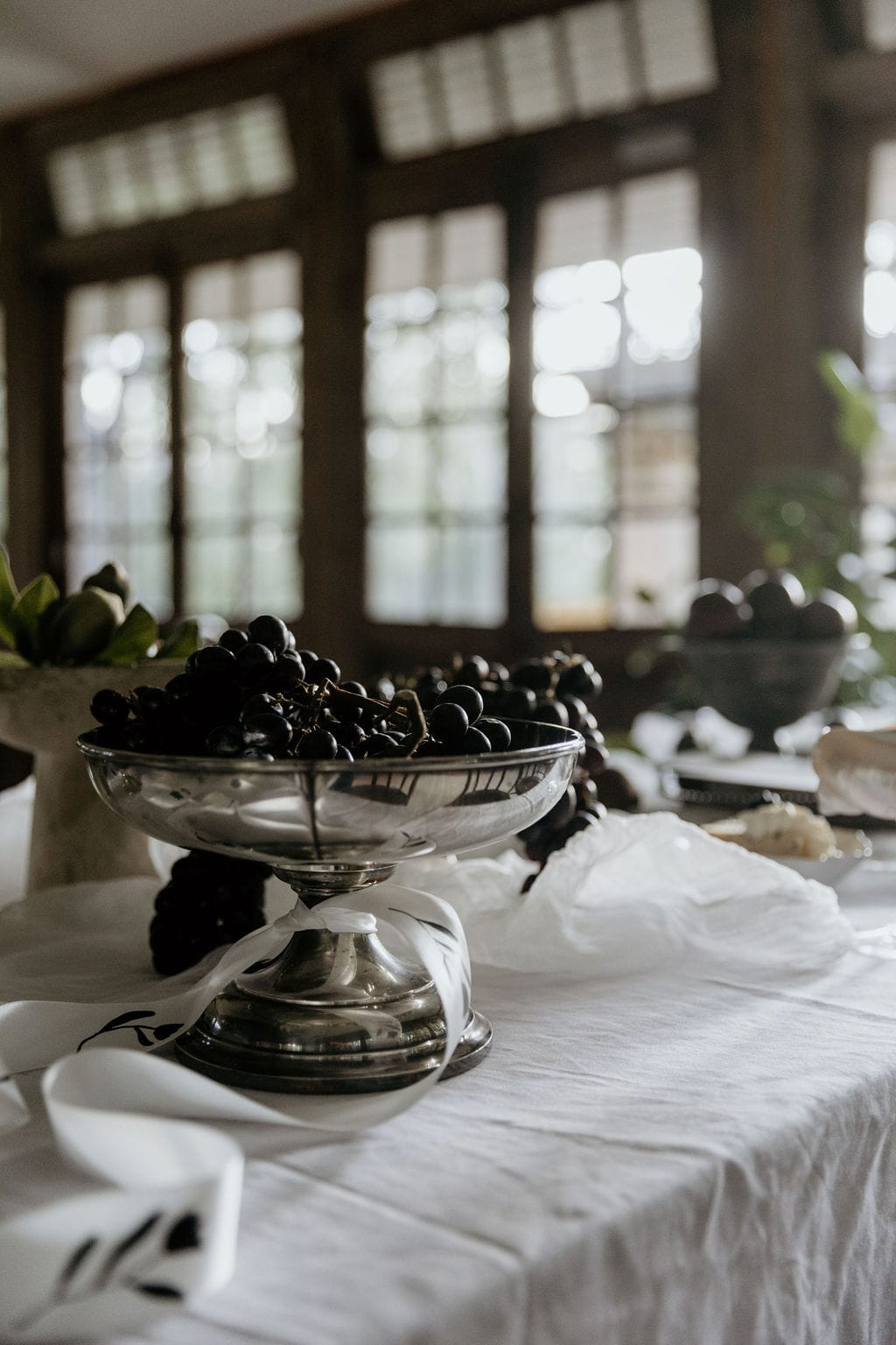 For this exquisite shoot, the vision of elegance and old-world romance, was brought to life by tabletop pieces from Sourceress, known for its ethereal and old-world collection of antique silver tableware, flatware, platters, plinths, and risers. Each piece, from delicate cake stands to intricately embossed shell flatware and vintage coupes added layers of refinement and romance. “Then to infuse a touch of nature and raw beauty, the tablescape was further adorned with statement shells and corals, a hallmark of the collection. These organic elements added to the casual opulence and natural beauty.”