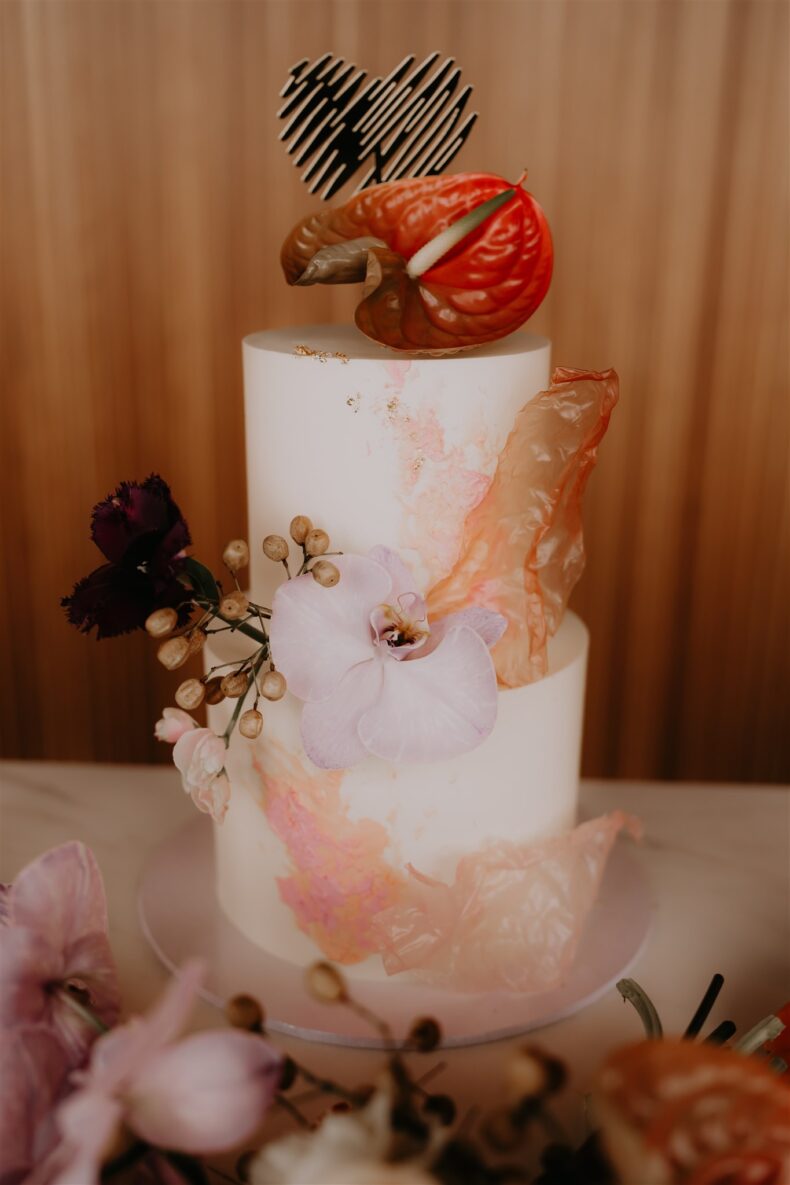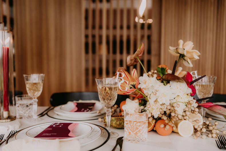 Titled “Enchanting Love”, Natalie says the concept is inspired by the “juxtaposition of wild free-flowing forms in nature, and bold elegance delivered by carefully considered styling elements. Key to the concept was a passionate energy between our couple, and a vibrant colour palette that injected personality into each part of the celebration. Unique details were really important to us, to showcase what a team of creatives can bring when couples allow us to express ourselves – elements such as the escort card display, the detailed lining of the suit, the lace sleeve on the dress, the chess board, the coloured champagne tower, and so much more, all came together to convey the enchantment in this styled shoot.”