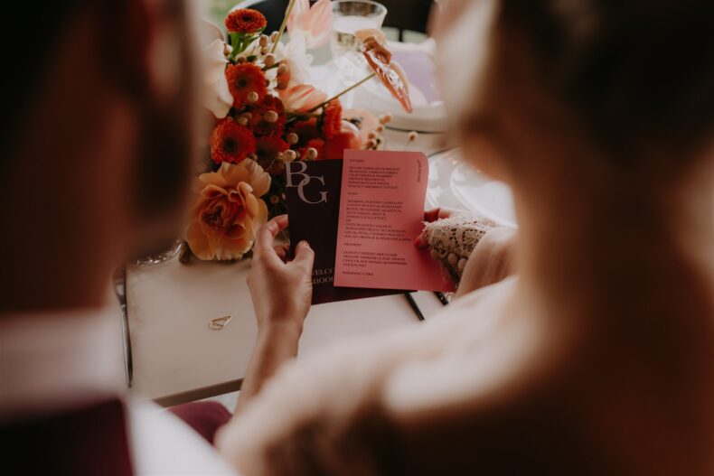 Stationery star Natalie created the concept for Enchanting Love, a vibrant and mesmerizing vibe reflected in not only the bold colour palette but also the passionate energy between our couple. “We showcased maximalism in the colours and the styling because we believe that every couple has a unique personality that should be celebrated on the biggest day of their lives,” she says. “I created a statement escort card display, an element that I would love to see more of in weddings.  The contemporary invitation suite and matching table stationery were created with textured card stock, custom shapes, and bright colours to carry important detailing throughout the whole event.”
