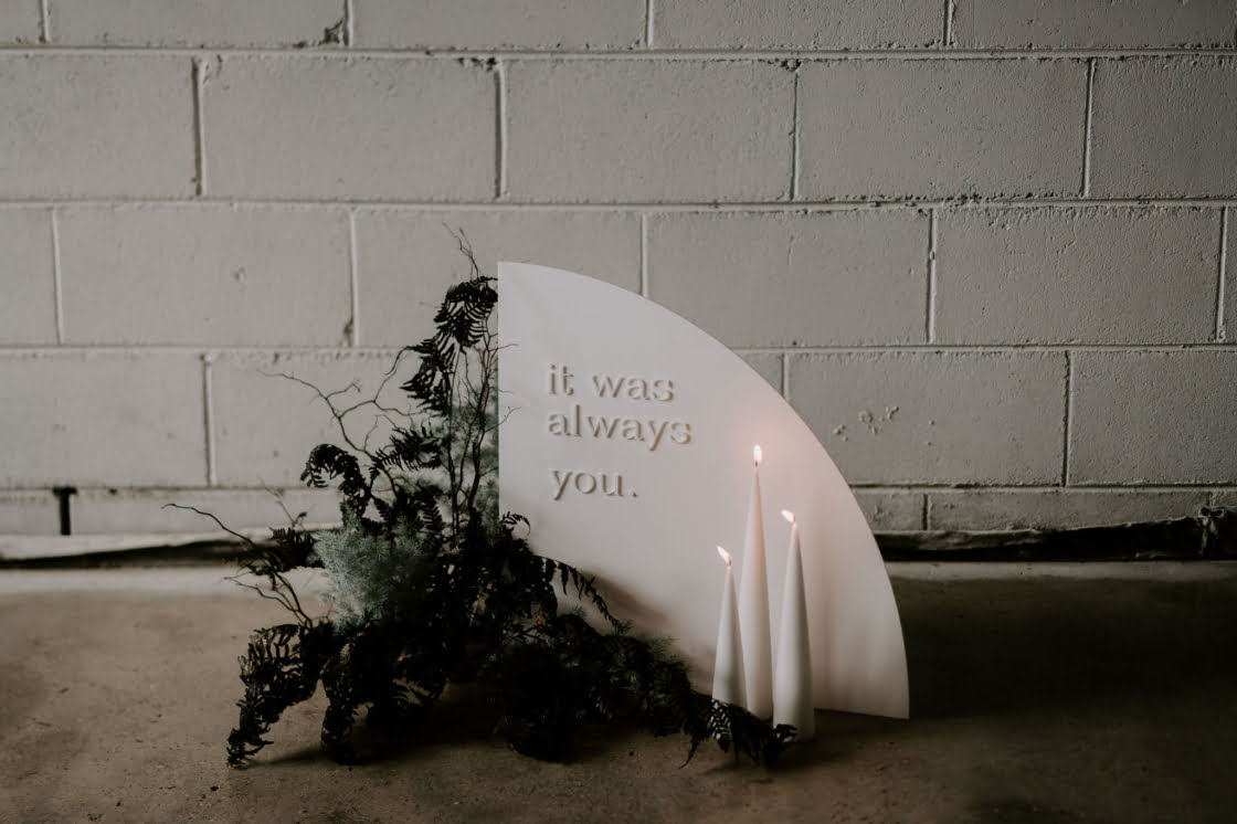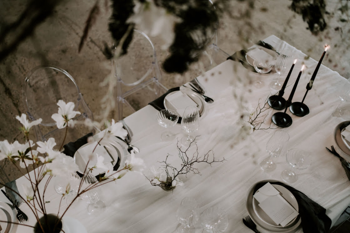 We’re big fans of the One Day Weddings & Events team so when their leading lady, Mikhayla, set out to prove that you don’t always need colour for an epic wedding set-up, we couldn’t wait to see the results. “Aiming to steer away from the soft, airy and showered in natural light looks, I wanted to create a shoot that embraced the “harsh” natural sunlight we often try and steer clear from.” How? Concrete floors, white-painted brick walls, an abundance of candles and layers of soft linen.