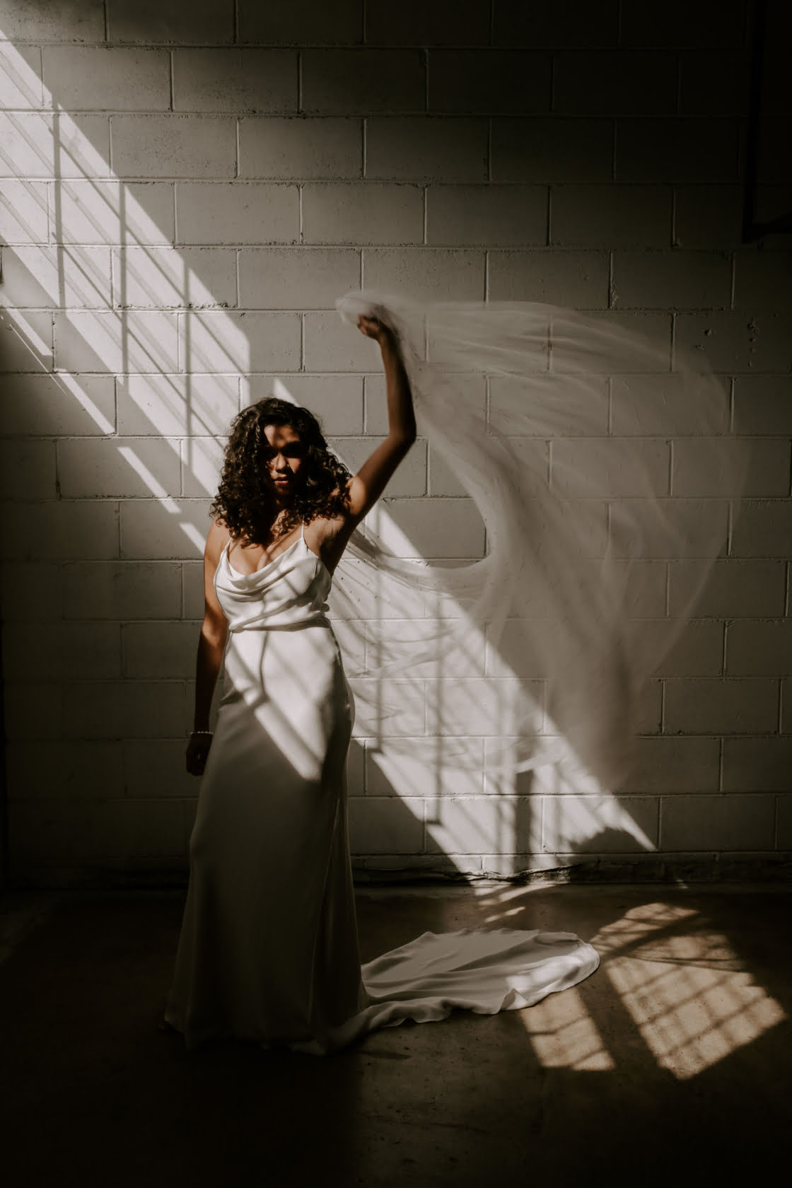 One of our fave photographers in the biz, Fox & Kin, is responsible for the moody captures. On her inspo from behind the lens, she notes, “The palette was clean and monochromatic and we played between the lines of drama and softness. Our model, Coffs local Shaz Mercy, embraced her fierce femininity in the Grace Loves Lace Honey Silk Gown with Pearly Long Veil. The hair and makeup highlighted her naturally glowing skin and wild curls.”