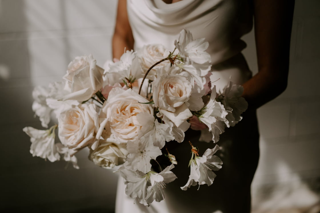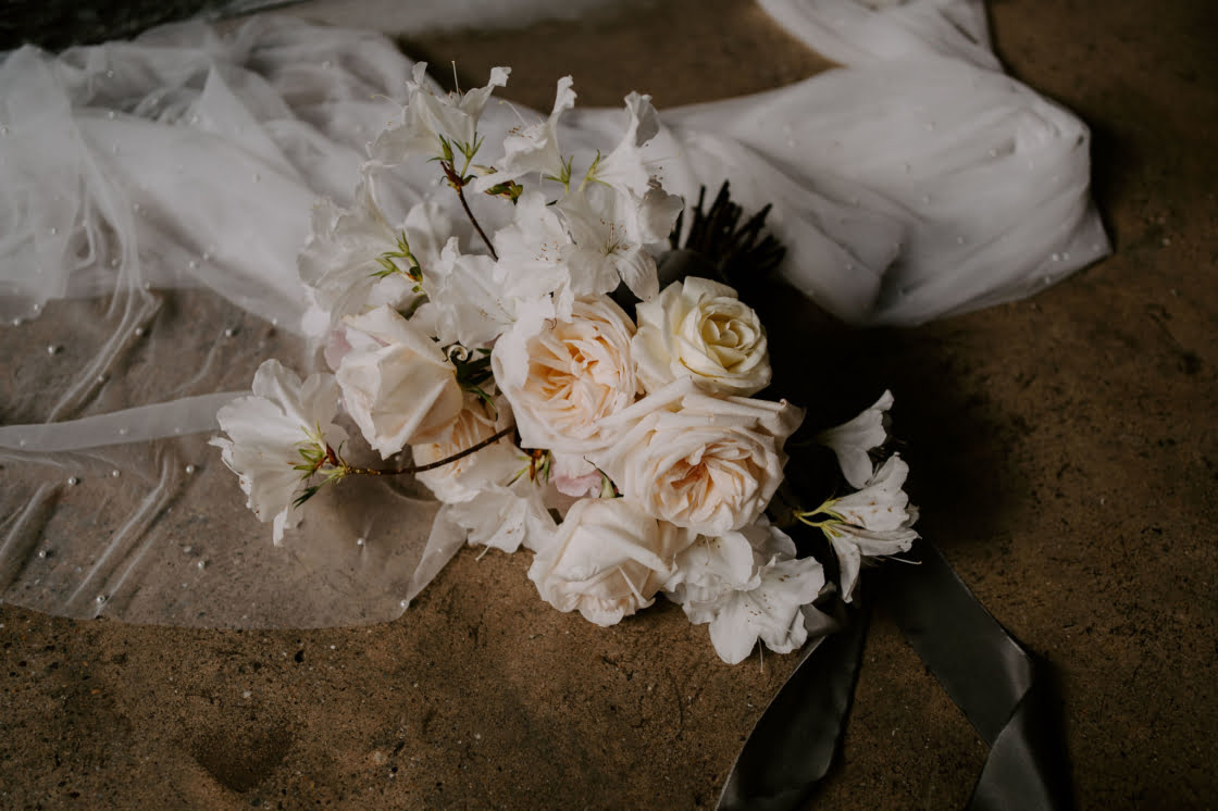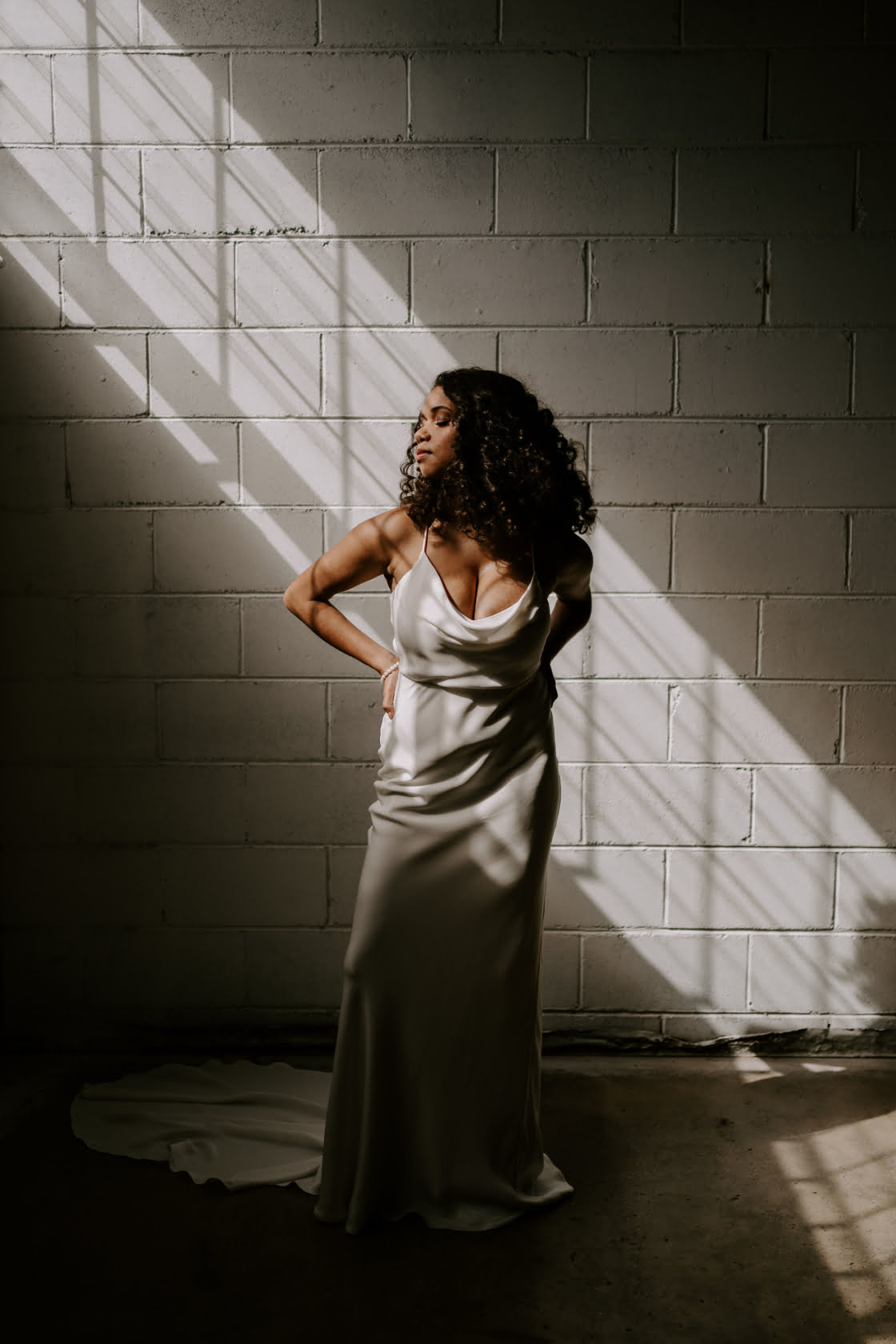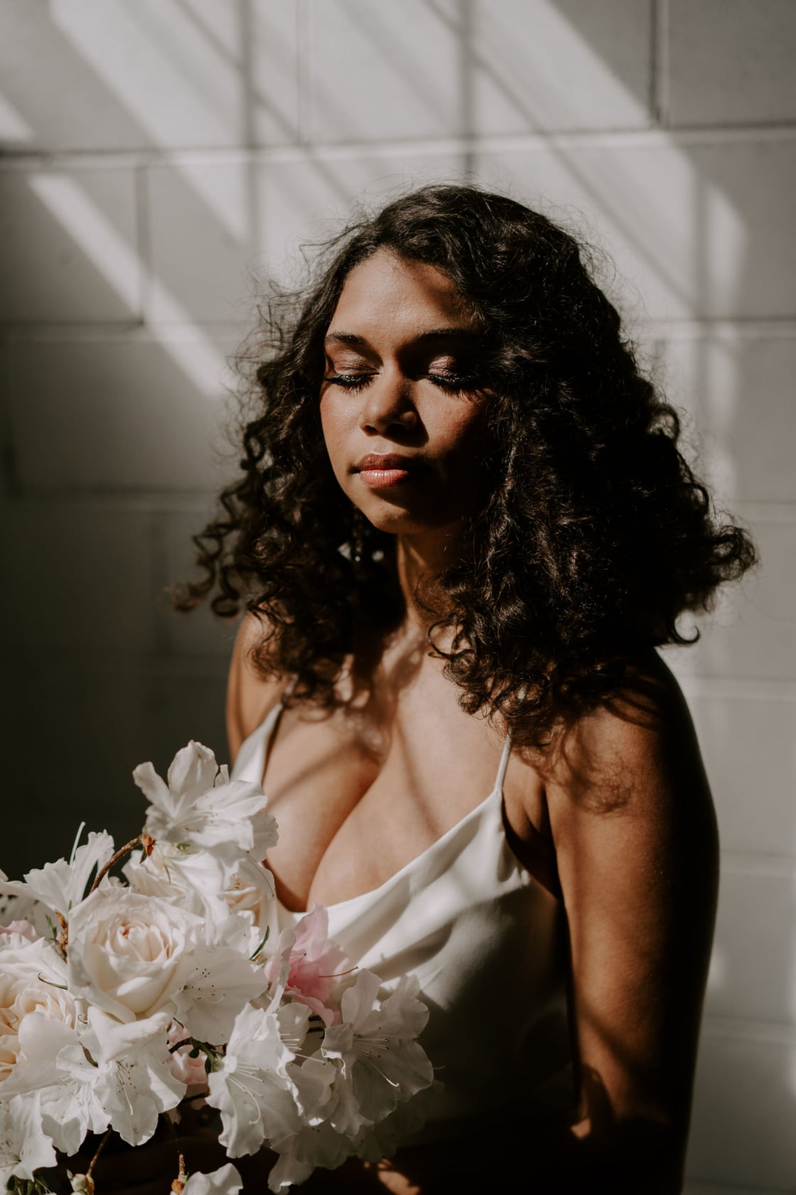 One of our fave photographers in the biz, Fox & Kin, is responsible for the moody captures. On her inspo from behind the lens, she notes, “The palette was clean and monochromatic and we played between the lines of drama and softness. Our model, Coffs local Shaz Mercy, embraced her fierce femininity in the Grace Loves Lace Honey Silk Gown with Pearly Long Veil. The hair and makeup highlighted her naturally glowing skin and wild curls.”