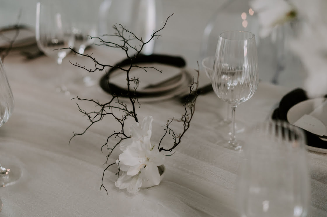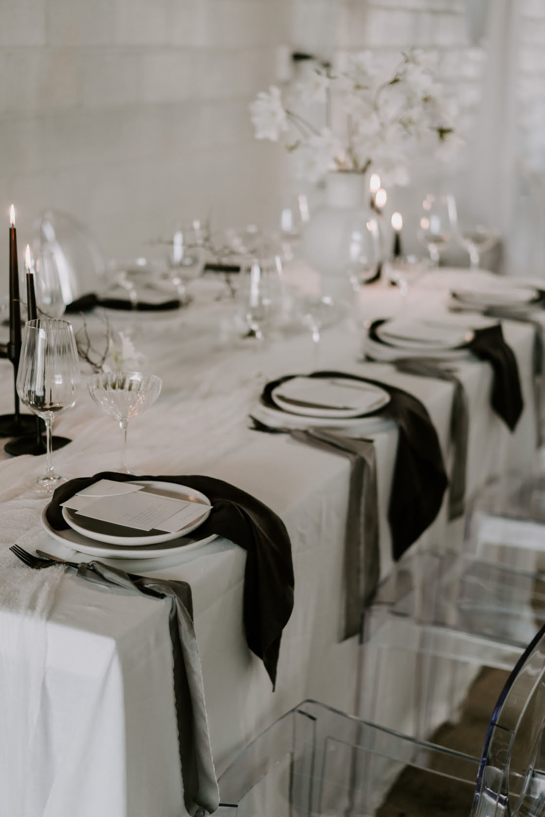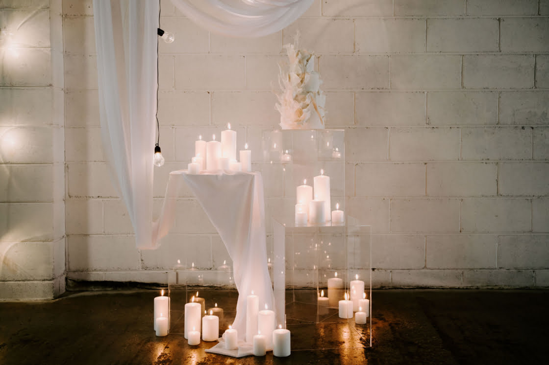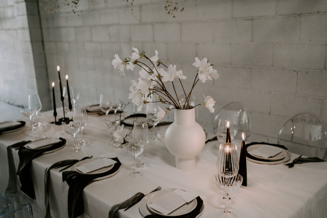 We’re big fans of the One Day Weddings & Events team so when their leading lady, Mikhayla, set out to prove that you don’t always need colour for an epic wedding set-up, we couldn’t wait to see the results. “Aiming to steer away from the soft, airy and showered in natural light looks, I wanted to create a shoot that embraced the “harsh” natural sunlight we often try and steer clear from.” How? Concrete floors, white-painted brick walls, an abundance of candles and layers of soft linen.