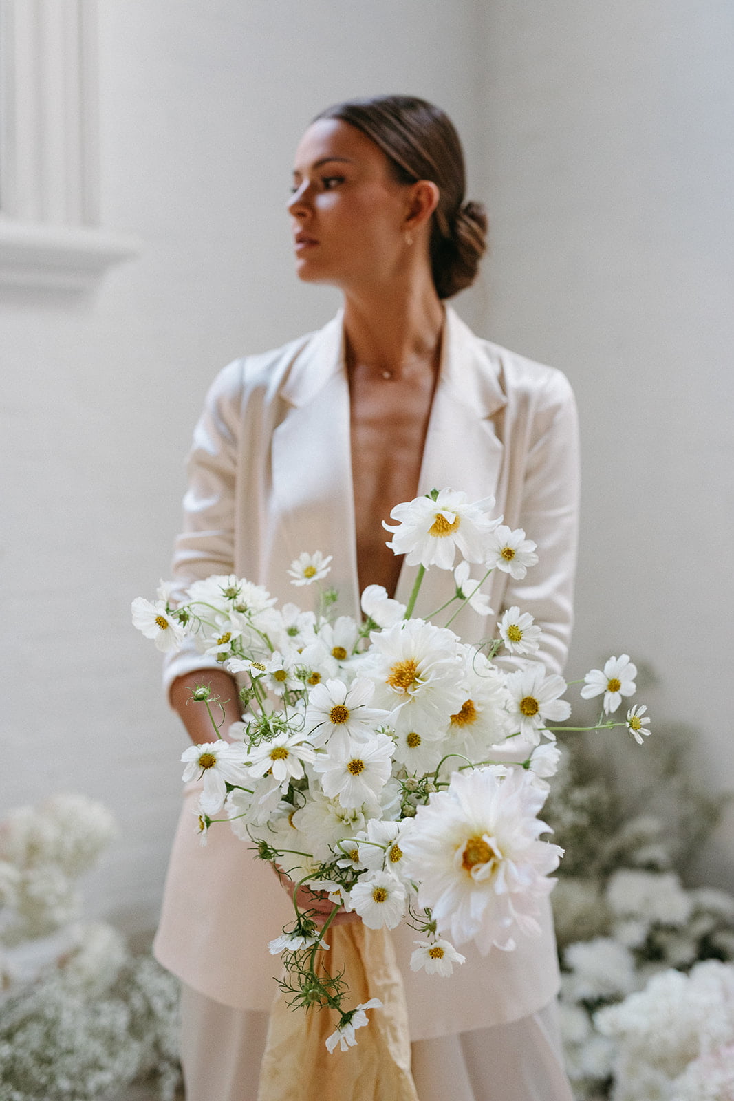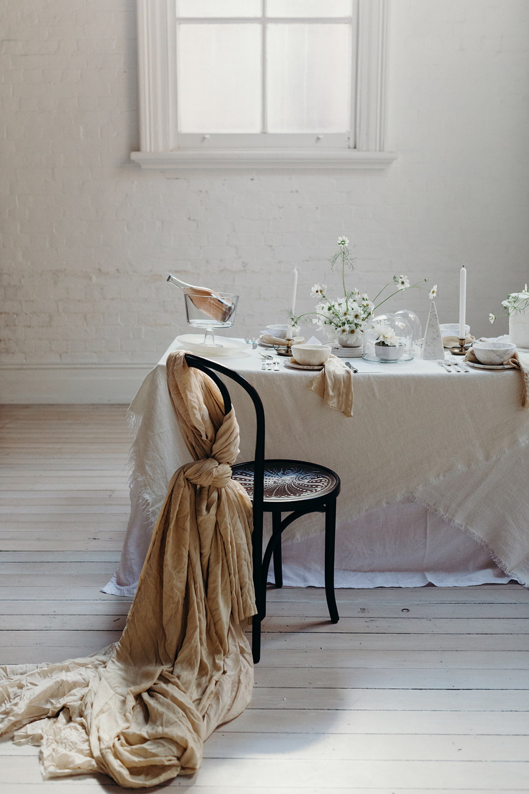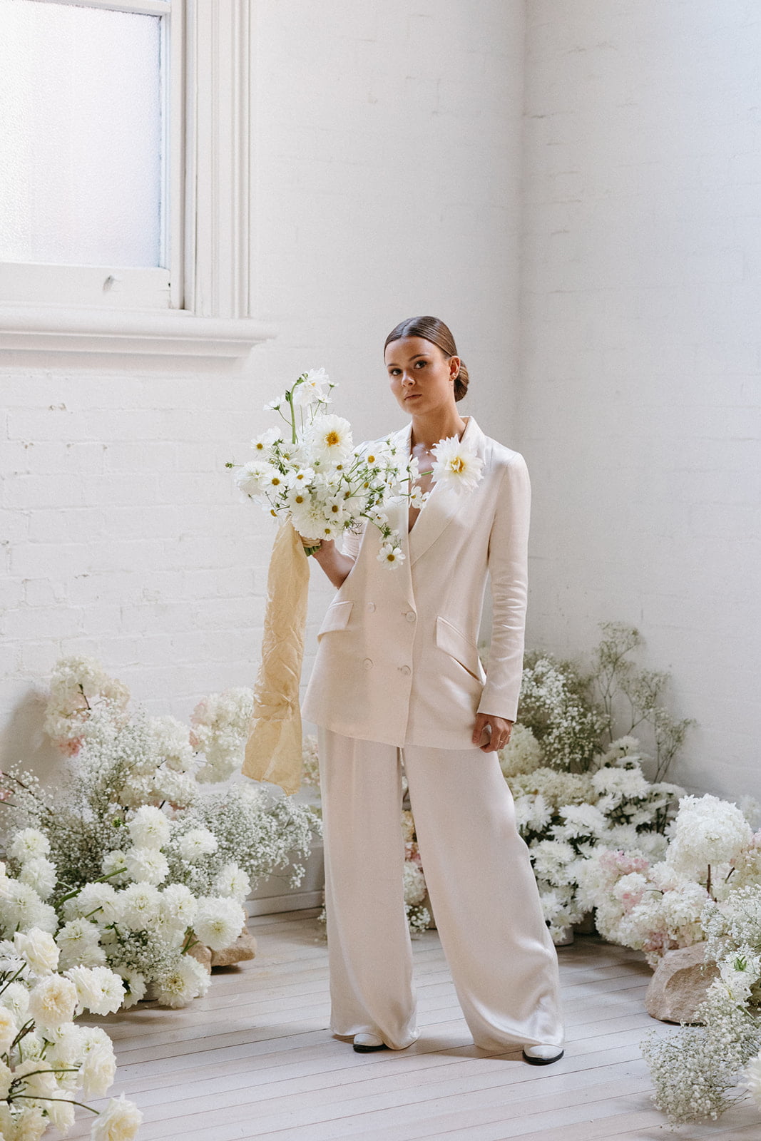The talented Ash, of Film & Foliage, was one of the masterminds behind the shoot with her textured, wild blooms and floral foam free designs front and centre. On her grounded floral crescent Ash shares, “Each bloom is locally grown by Australian growers and relevant to its season, creating a harmonious meadow for our bride.” She adds, “We featured yellow centred summery flowers throughout to carry a nostalgic and whimsical feel as a balance to the minimal and modern setting as well as tying into the muted gold tones in the table styling.” Paired with natural linens, local wines and a bridal suit, chic was the name of the game.