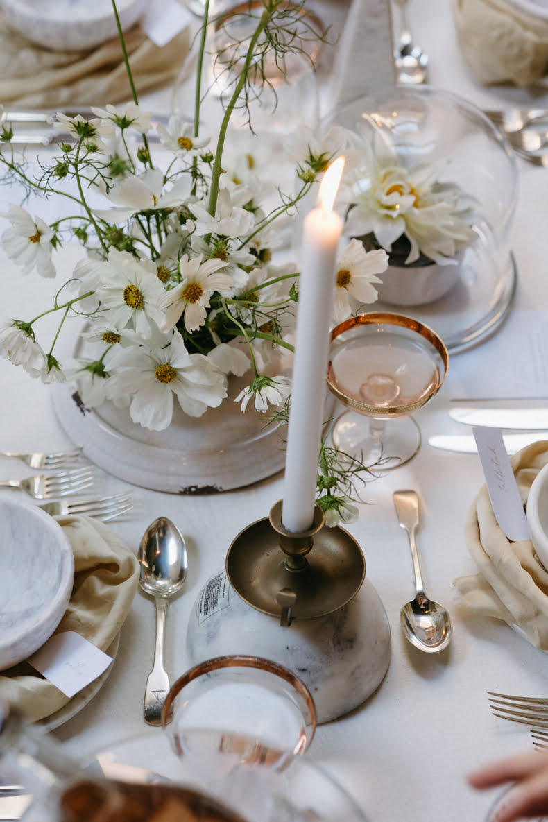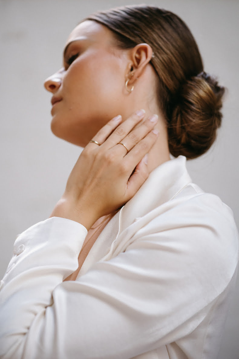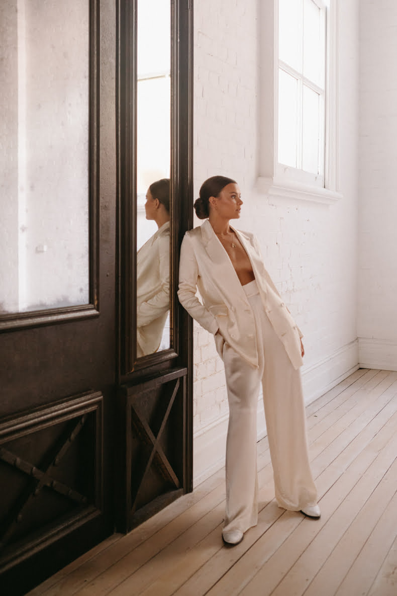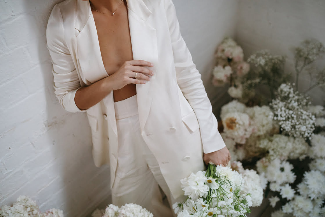The talented Ash, of Film & Foliage, was one of the masterminds behind the shoot with her textured, wild blooms and floral foam free designs front and centre. On her grounded floral crescent Ash shares, “Each bloom is locally grown by Australian growers and relevant to its season, creating a harmonious meadow for our bride.” She adds, “We featured yellow centred summery flowers throughout to carry a nostalgic and whimsical feel as a balance to the minimal and modern setting as well as tying into the muted gold tones in the table styling.” Paired with natural linens, local wines and a bridal suit, chic was the name of the game.