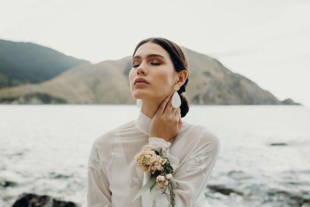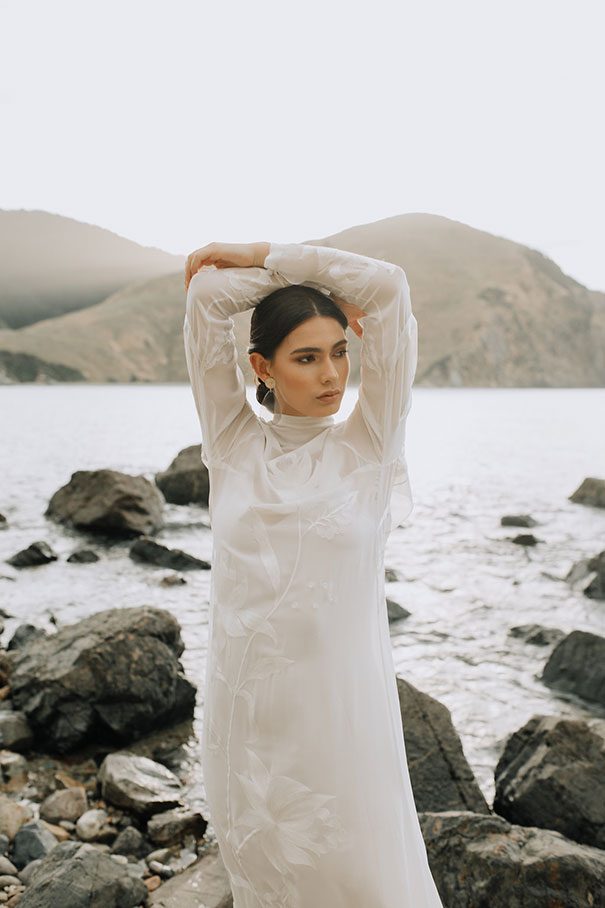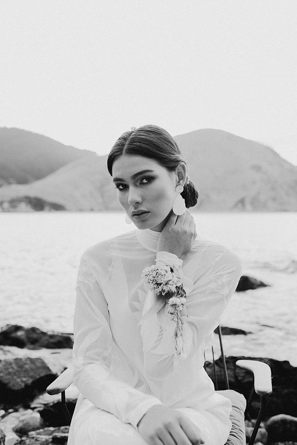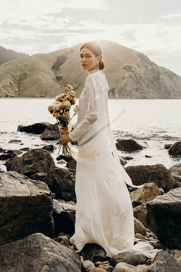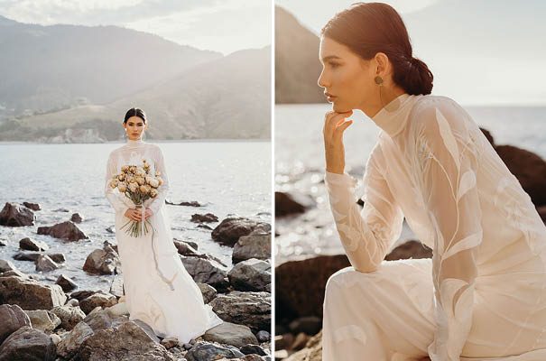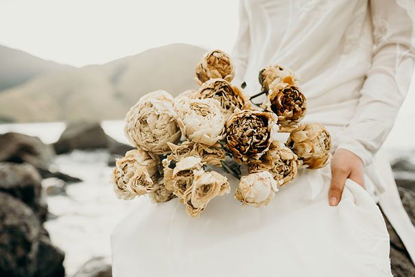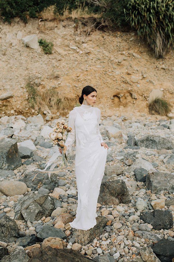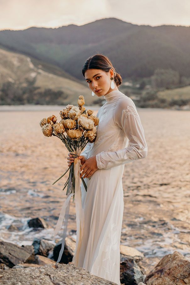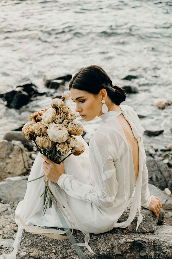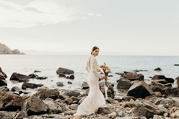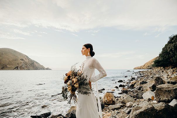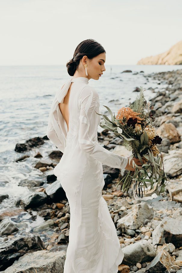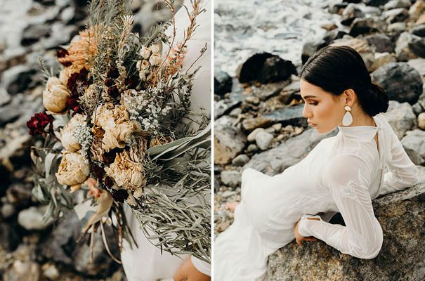 An ode to the ocean indeed, Renee Edwards combined her photographic vision with that of The Wilde Florist gals (Karen and Mollie) in creating a truely etherial shoot that pays homage to fragile yet powerful nature of the sea. The combination of dried flora and the delicate fabric of the Leto Bridal gown has us envisioning weddings of minimalism and elegance, for the carefree modern bride.