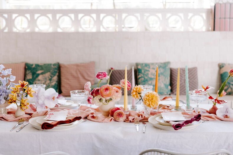 The styled shoot sure didn’t skimp on the details and we adore the on-trend stationery they incorporated on the day, especially that impressive illustrated bar menu. “The vibe was very retro-inspired, so we decided to bring the FUN to our menus and signage by using vibrant colours and the very on-trend wave cutline to compliment the floral styling and decor seamlessly.”