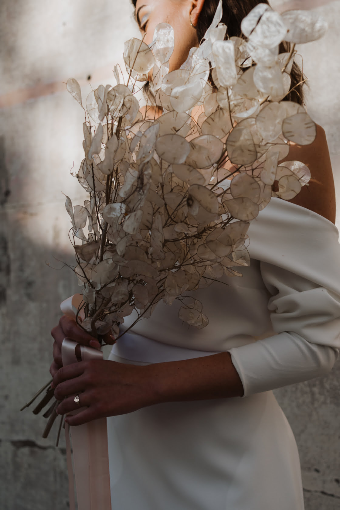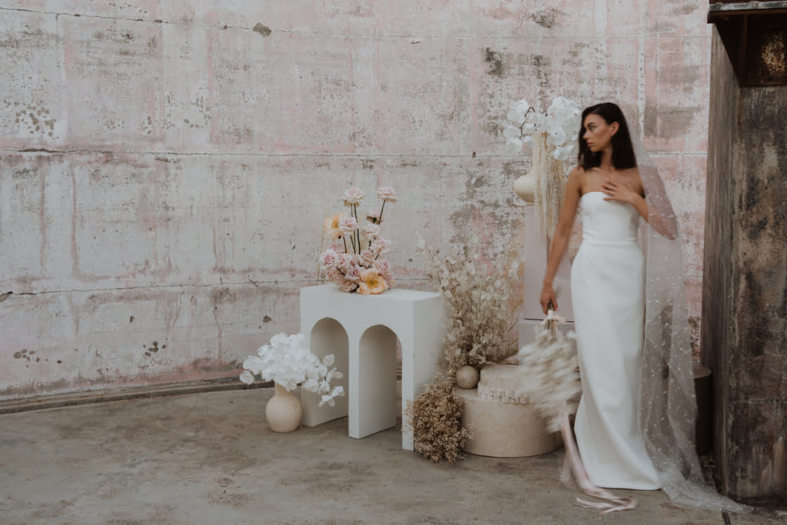 On her inspiration behind the shoot, Dany of Pia & Jade shares, “Mt Stromlo Observatory has always been a favourite location of ours, especially at sunset. The burnt-out, rusted windows juxtaposed with the sorbet pink tones in the concrete are just pure magic. We wanted to create something quite ethereal with simplistic, en-masse florals and textured styling elements for a super romantic yet modern look.”
