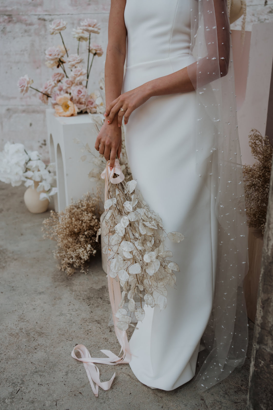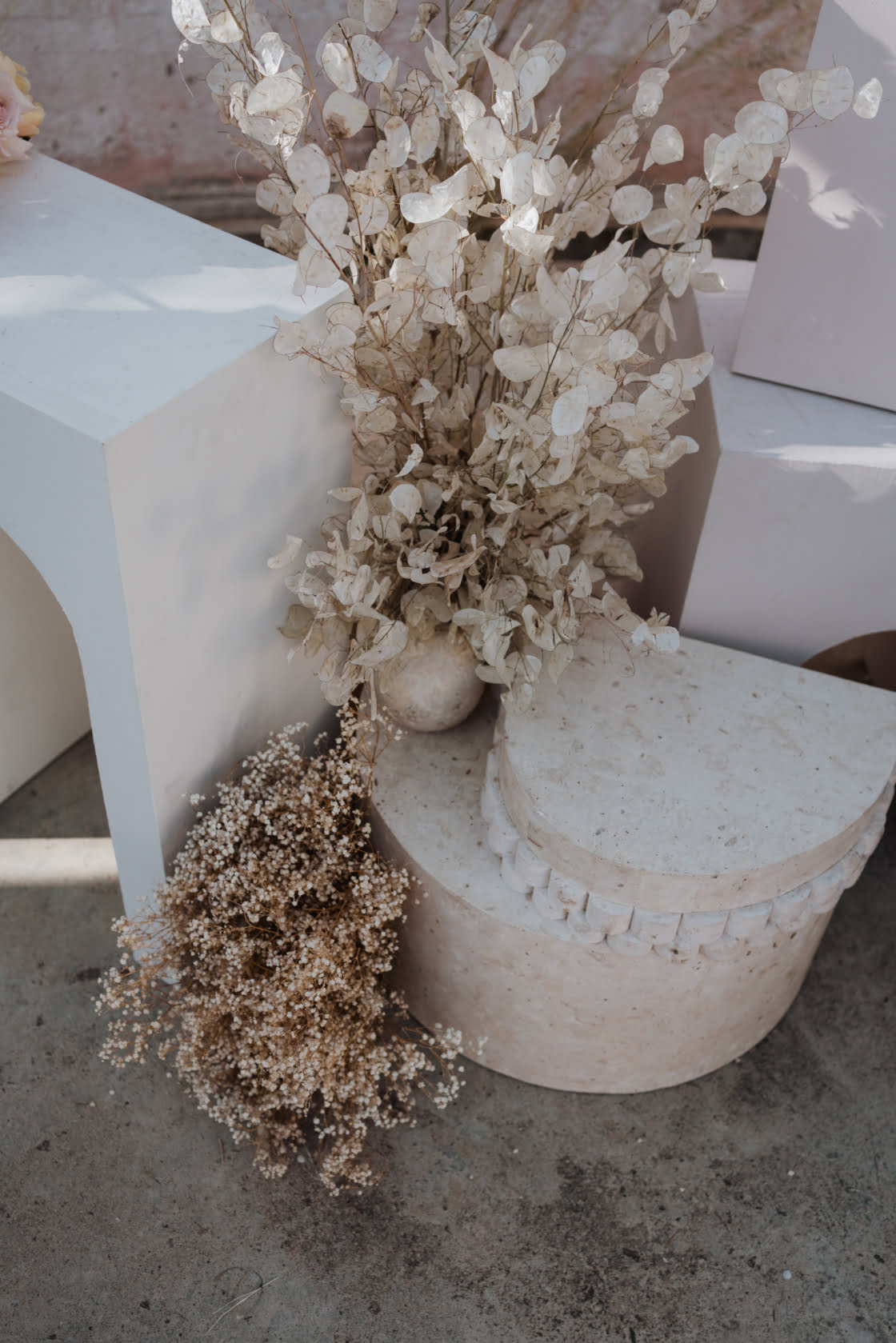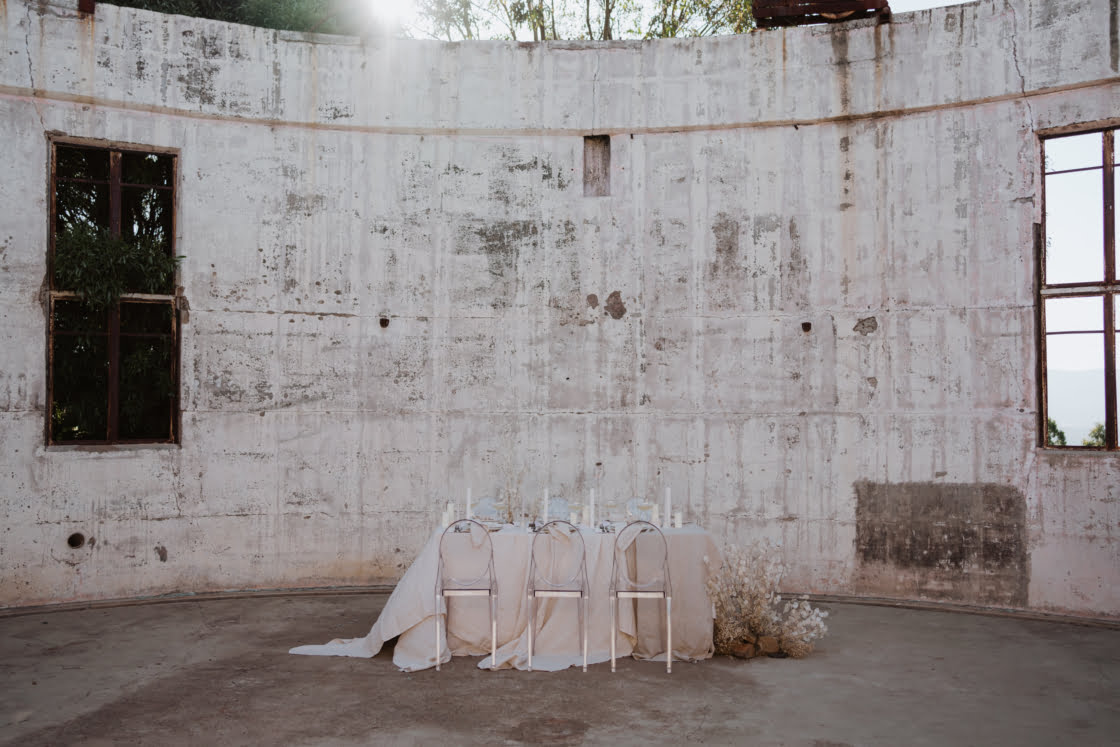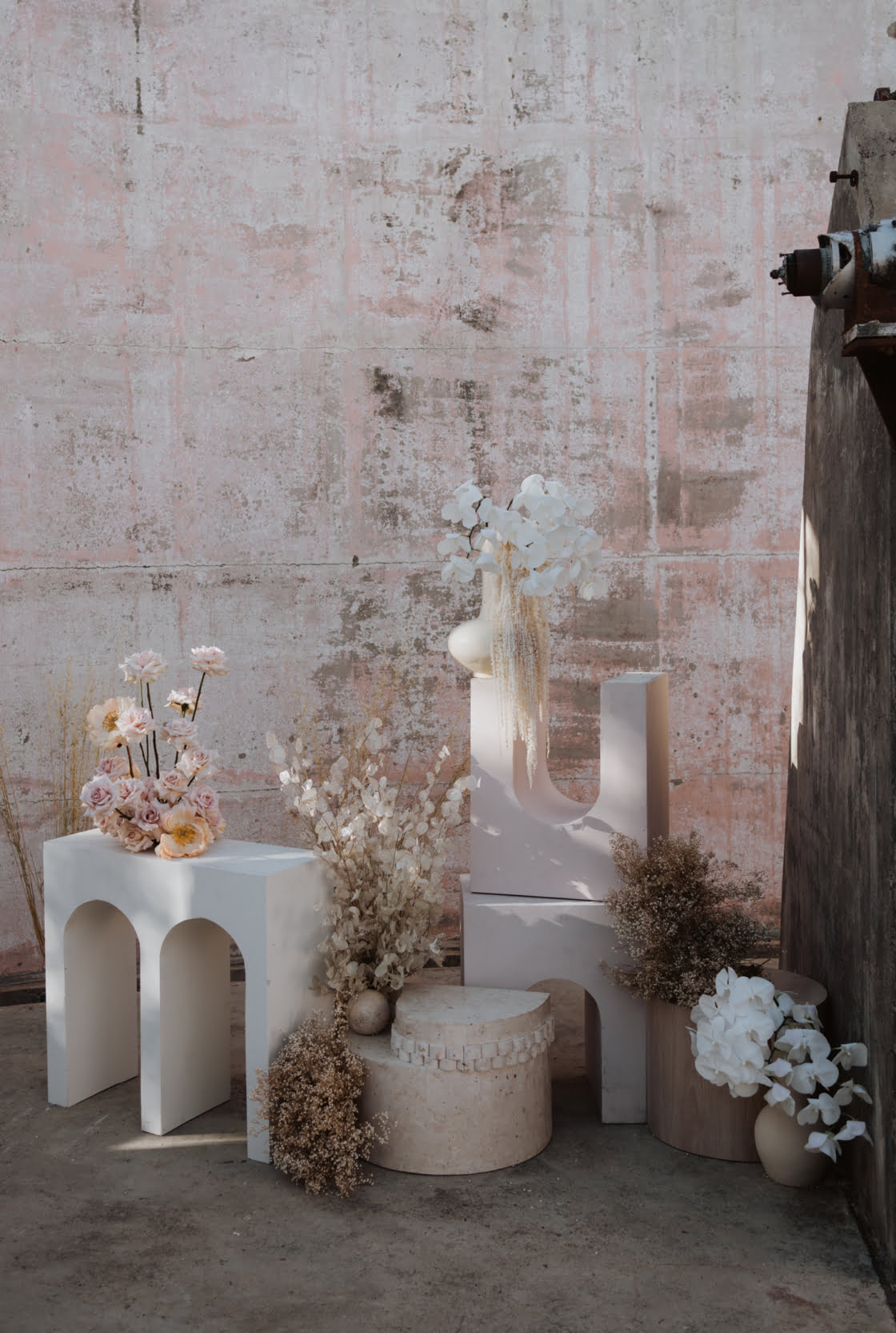 On her inspiration behind the shoot, Dany of Pia & Jade shares, “Mt Stromlo Observatory has always been a favourite location of ours, especially at sunset. The burnt-out, rusted windows juxtaposed with the sorbet pink tones in the concrete are just pure magic. We wanted to create something quite ethereal with simplistic, en-masse florals and textured styling elements for a super romantic yet modern look.”