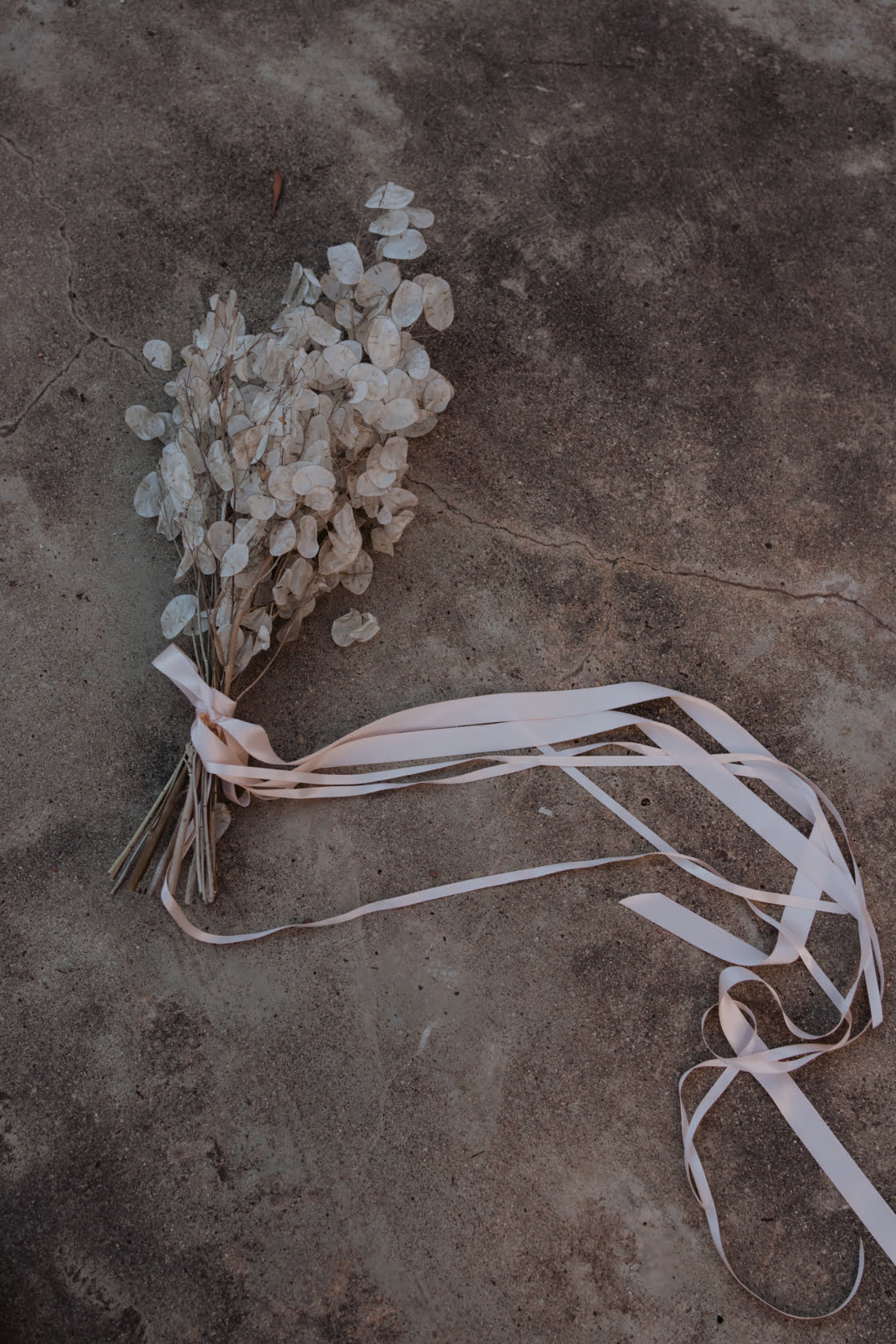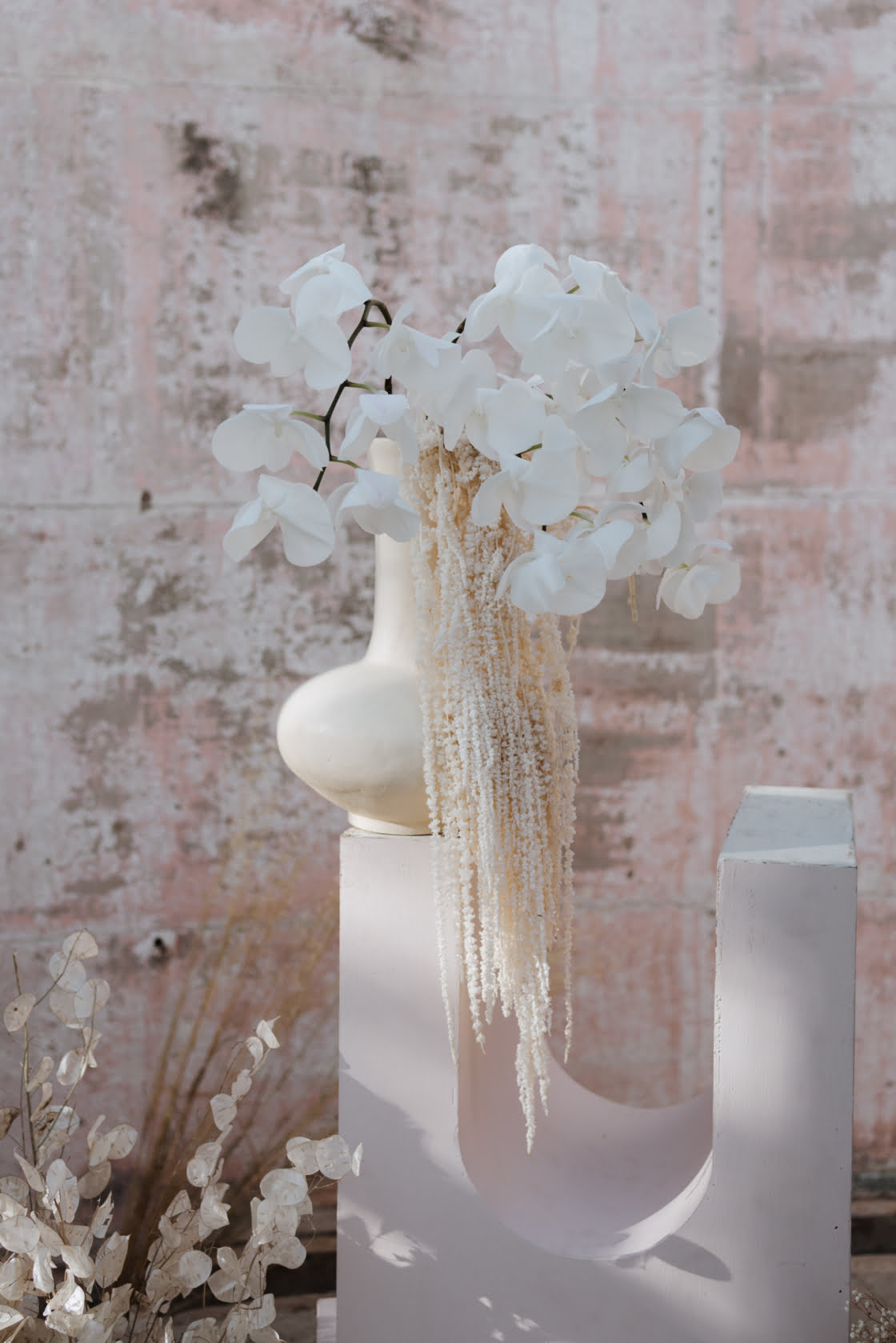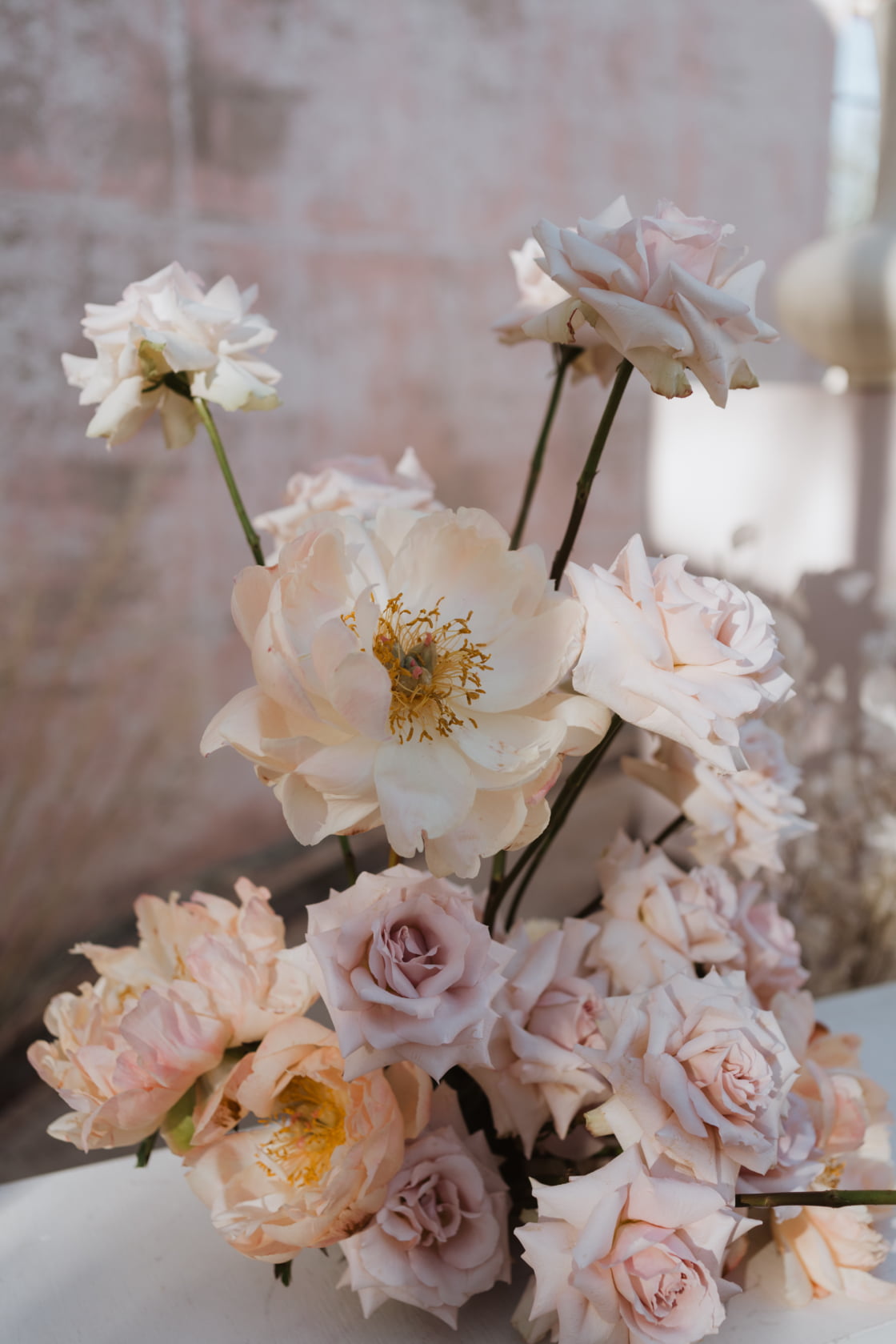 On her inspiration behind the shoot, Dany of Pia & Jade shares, “Mt Stromlo Observatory has always been a favourite location of ours, especially at sunset. The burnt-out, rusted windows juxtaposed with the sorbet pink tones in the concrete are just pure magic. We wanted to create something quite ethereal with simplistic, en-masse florals and textured styling elements for a super romantic yet modern look.”