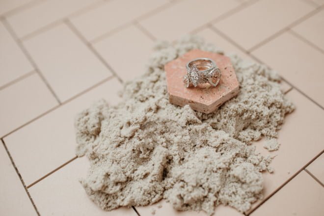 “Understated with a contemporary edge, this shoot draws inspiration from the natural textures and tones of sand dunes. The natural light filters gently through the immense central skylight within this architectural wonder of a building,” she explains, of the Old Customs House, Fremantle location in Western Australia. “We wanted to hero this central space by creating a hanging installation, which cascaded from the skylight suspended above the bridal table. This feature brought a unique sculptural element to the venue and provided a modern interpretation of a romantic setting. With subtle tones of clay, nude blooms evoked a sense of romance but were kept contemporary with wild harvested foliage which crept towards the light.”