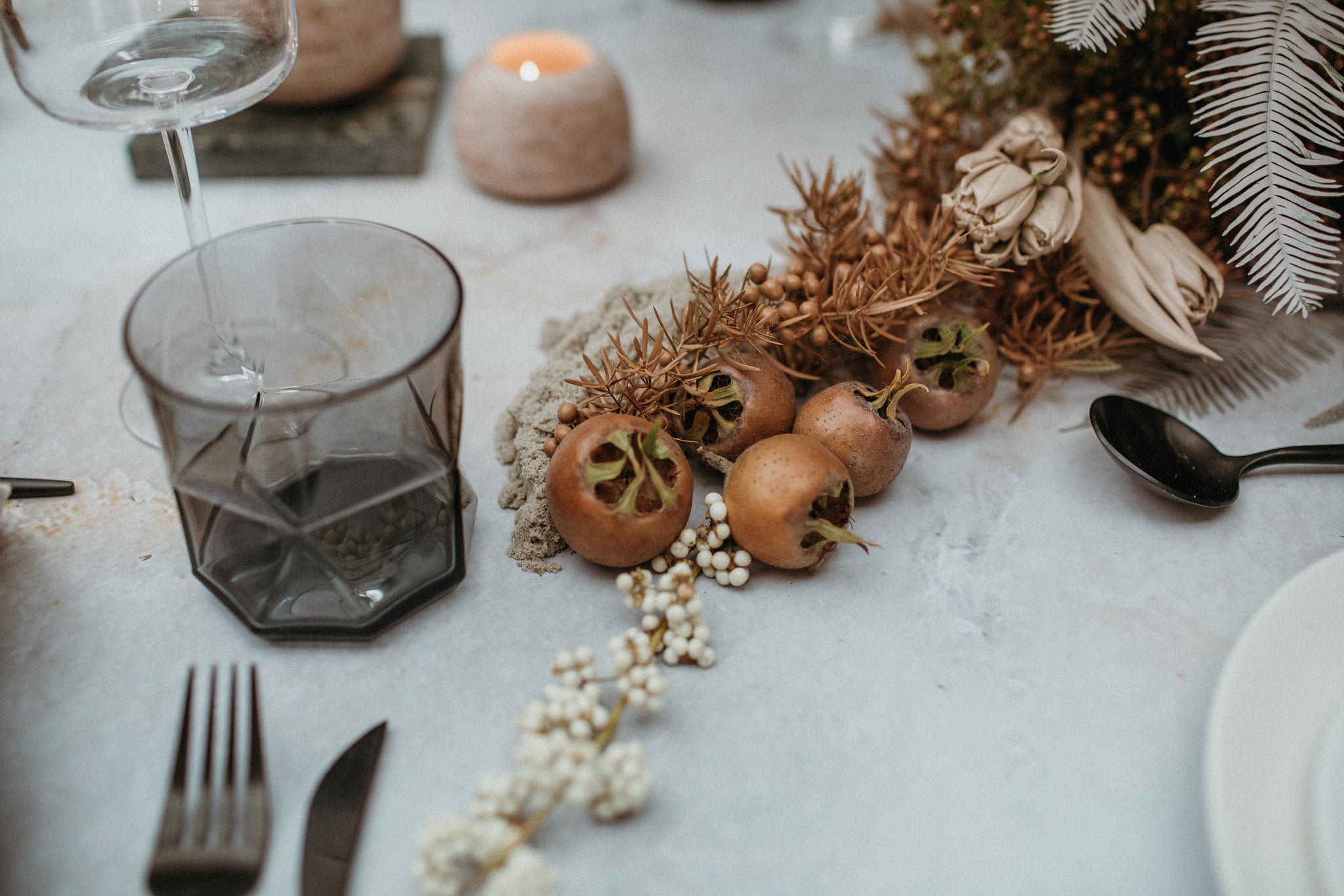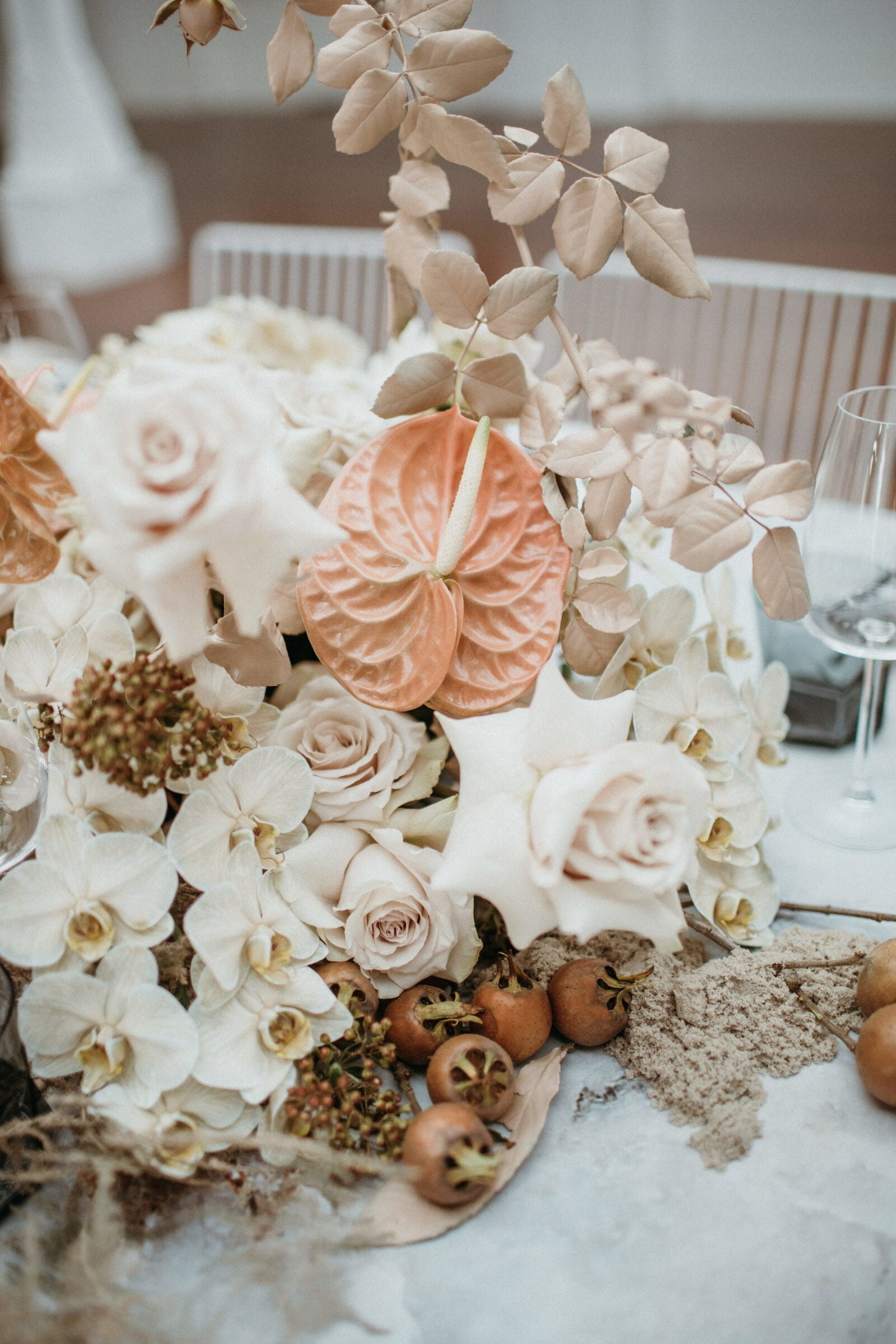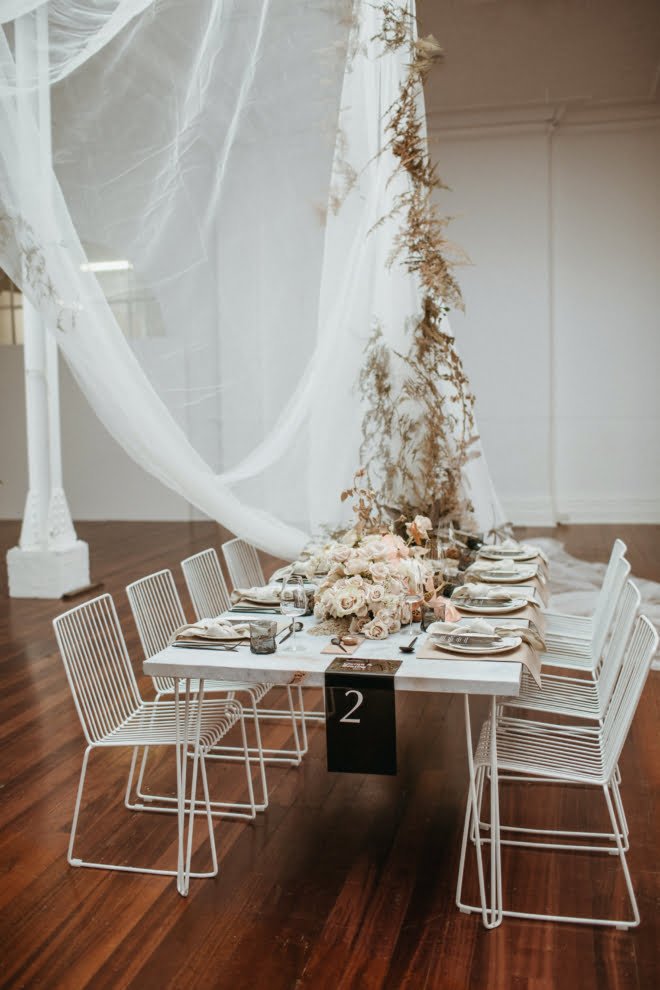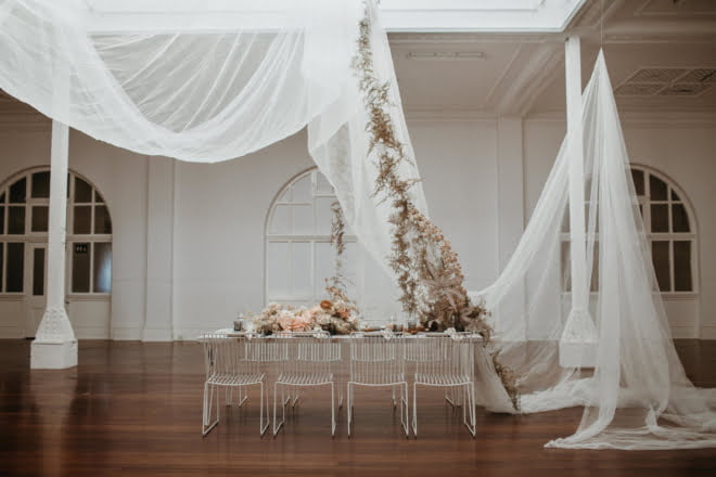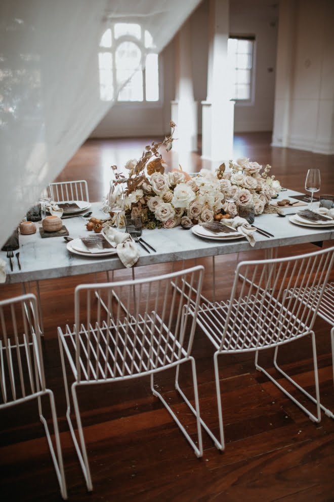 “Understated with a contemporary edge, this shoot draws inspiration from the natural textures and tones of sand dunes. The natural light filters gently through the immense central skylight within this architectural wonder of a building,” she explains, of the Old Customs House, Fremantle location in Western Australia. “We wanted to hero this central space by creating a hanging installation, which cascaded from the skylight suspended above the bridal table. This feature brought a unique sculptural element to the venue and provided a modern interpretation of a romantic setting. With subtle tones of clay, nude blooms evoked a sense of romance but were kept contemporary with wild harvested foliage which crept towards the light.”