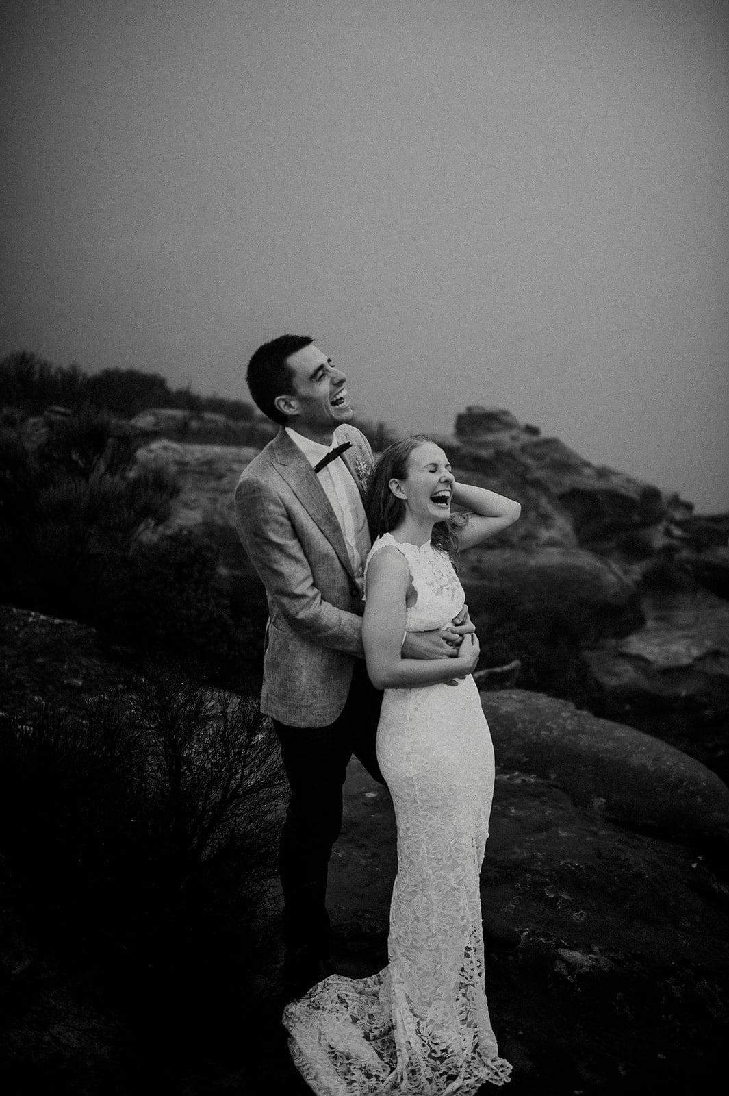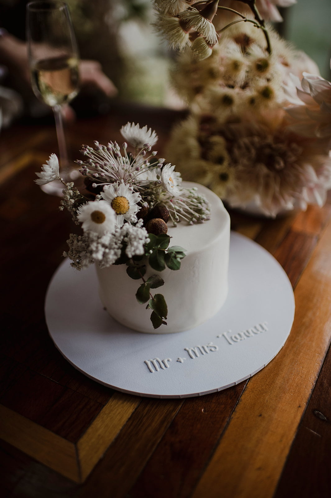 FAVE DETAILS “One of our favourite details was the venue itself. The Treehouse Blue Mountains is one of the most spectacular accommodations we have ever seen! It sits almost 11m above the ground in the tree canopies overlooking Wollemi National park. You could hear the river flowing at the base of the valley, the fog and cloud formation changed by the second and the view was just breathtaking! Although it was December it was actually quite cool due to the rain, which was perfect as there was a fireplace in the treehouse and made the mood and setting so much more magical! Our other favourite detail of the day was hiking up Mount Banks in the pouring rain for our adventure shoot with our photographer, Barefoot & Bearded, and cinematographer, The Lucky Ones. It had been raining for a few days so the ground was quite wet, we hiked 20 minutes up the mountain in our raincoats (we planned in advance as the weather wasn’t looking good), took them off at the top of the mountain and got absolutely soaked walking back down. But this memory I will never forget!