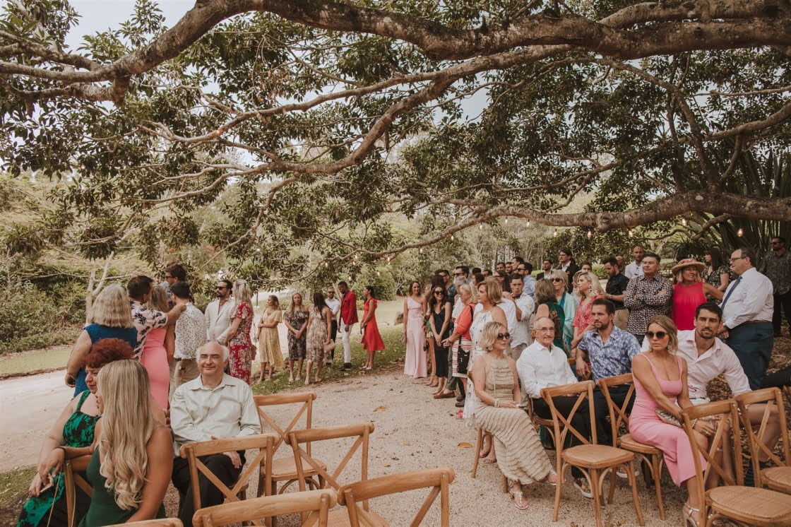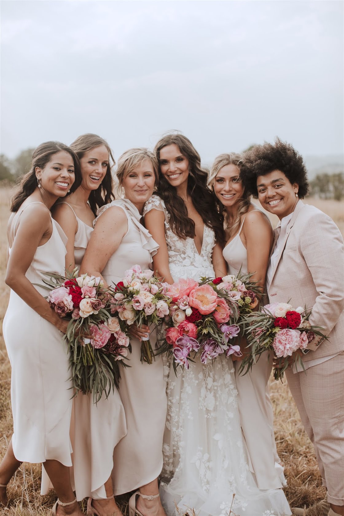 THE VIBE “We wanted to keep the theme true to Byron Bay using bohemian accents and highlighting natural materials like timber, linens, and cane to blend in with the natural surroundings. We used pops of colours throughout our floral arrangements to make a statement in our ceremony and reception setting and told all of our guests to wear colour or loud printed shirts.”