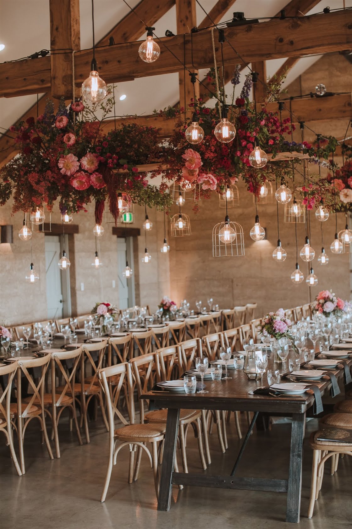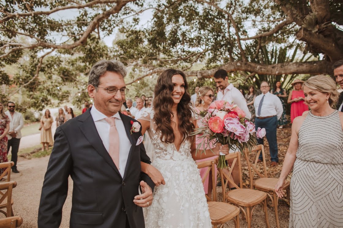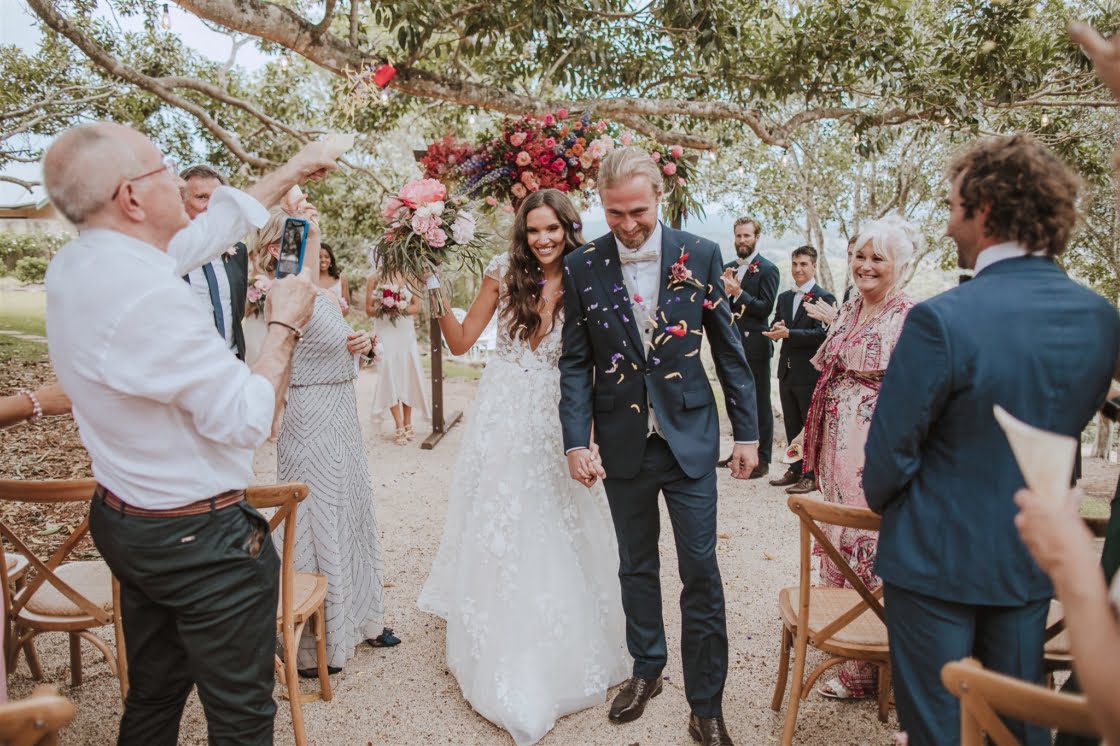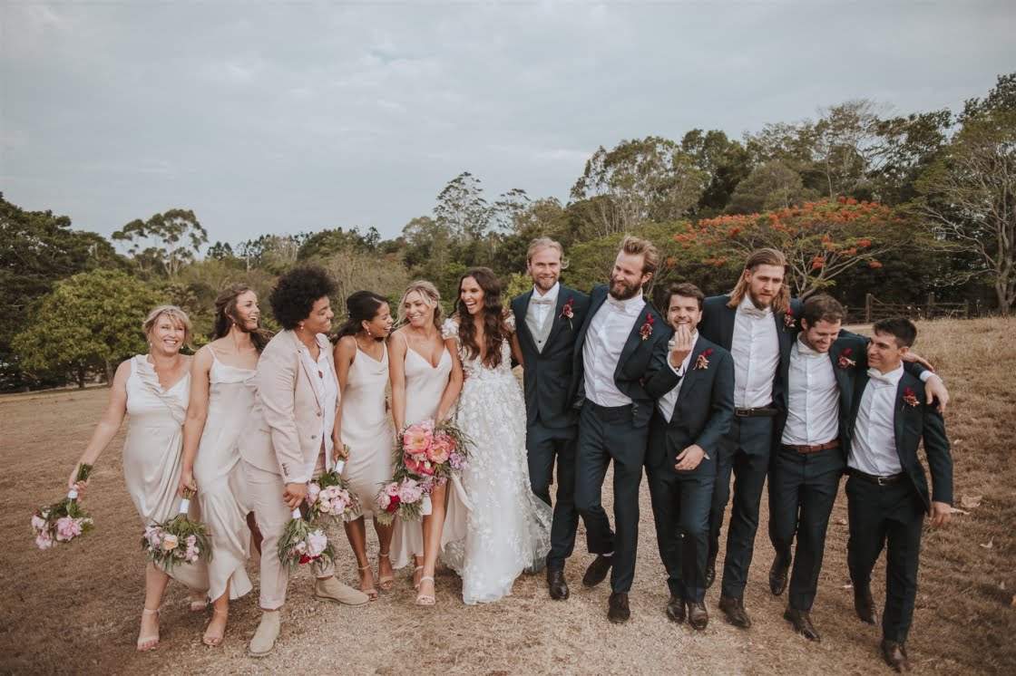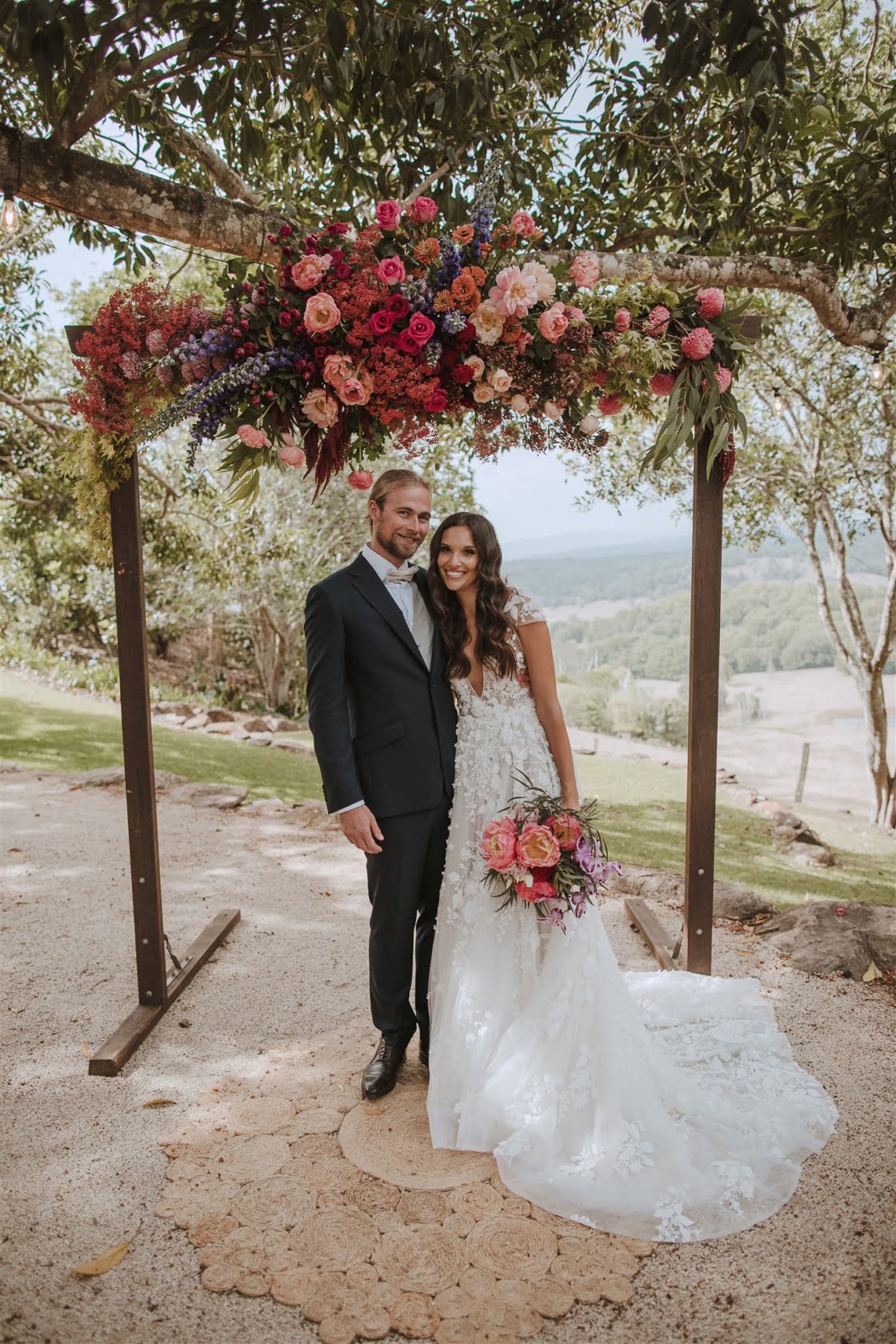 THE VIBE “We wanted to keep the theme true to Byron Bay using bohemian accents and highlighting natural materials like timber, linens, and cane to blend in with the natural surroundings. We used pops of colours throughout our floral arrangements to make a statement in our ceremony and reception setting and told all of our guests to wear colour or loud printed shirts.”
