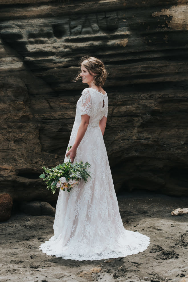THE DRESS I couldn’t find a dress that was really ‘me’. I talked to a family friend and she agreed to make my dress for me. I decided on a simple dress with a natural-coloured silk underneath to make the lace stand out. I loved the experience of designing it myself and creating a dress that I absolutely loved.