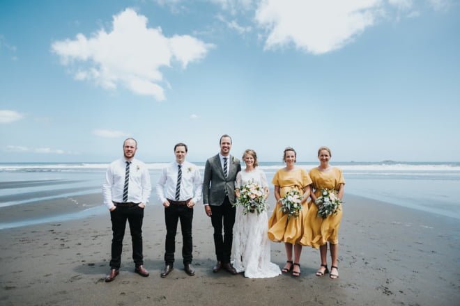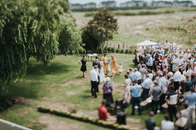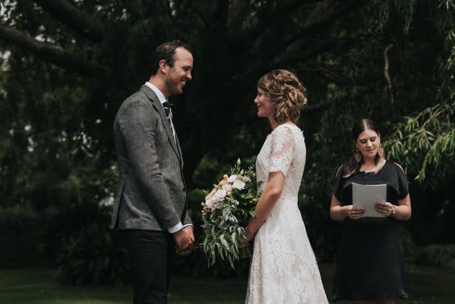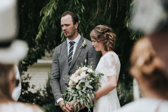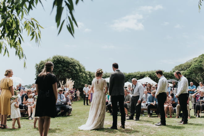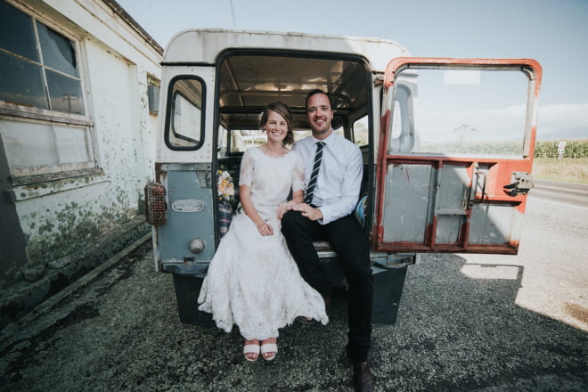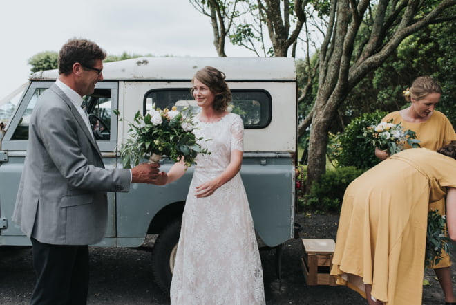 Setting the intention to keep the wedding ‘simple’, Lex and Dunc decided on “natural colours and textures, calico, wood, and greenery,” plus a delightful “pop of yellow” thanks to the bride’s love of the sunny colour. Caught on camera by Abi Hackling Photography, this New Zealand wedding was a hit- our favourite part (and the bride’s)- was the old school Land Rover used as the wedding car, adding to the rustic vibe. Scroll down to see it all.
