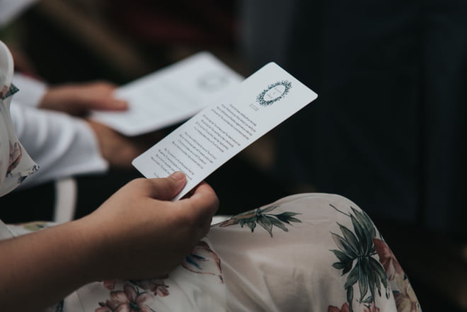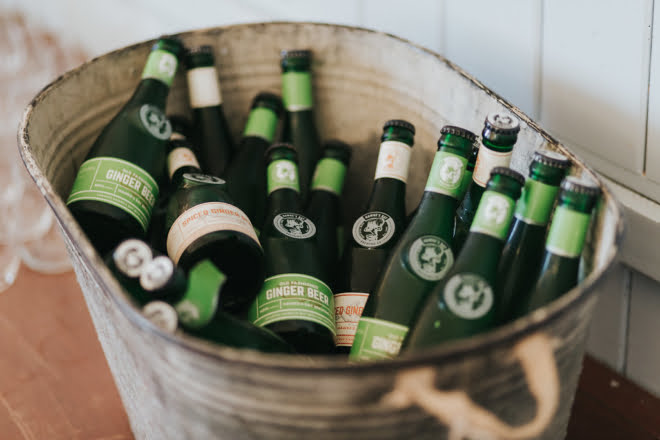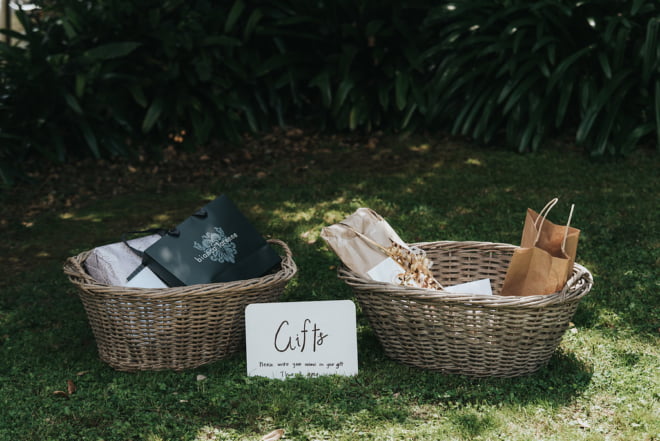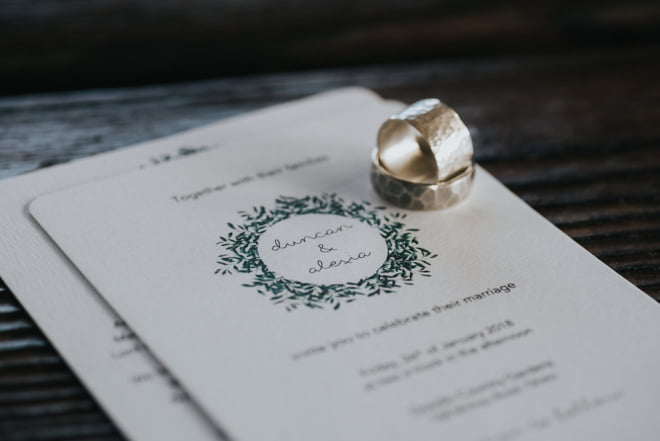 DIY I designed the invitations, wedding logo, place cards and hand wrote signs on calico fabric. Duncan and I made salted caramel popcorn a few nights before the wedding, which we put in cellophane with a handwritten sticker on the front. My family foraged a few days before the wedding to find the greenery that we put on the tables at the reception.