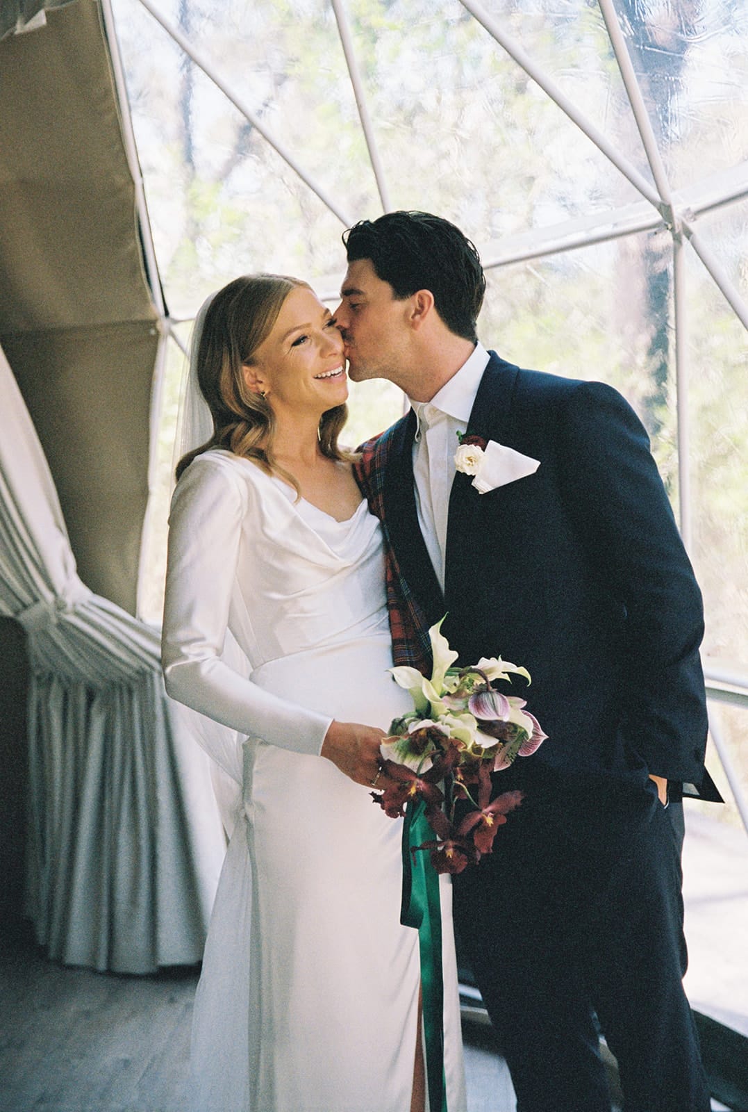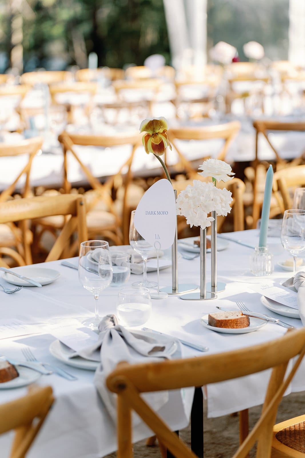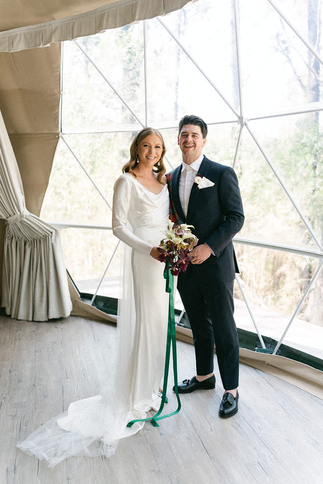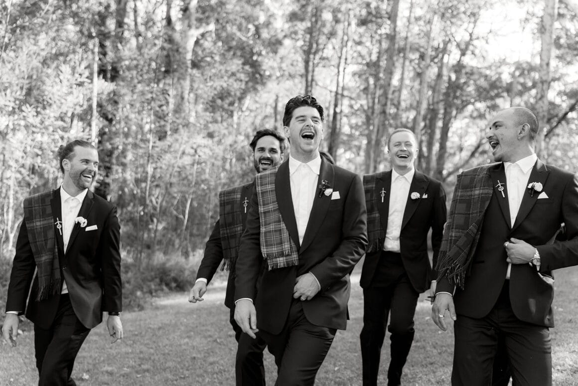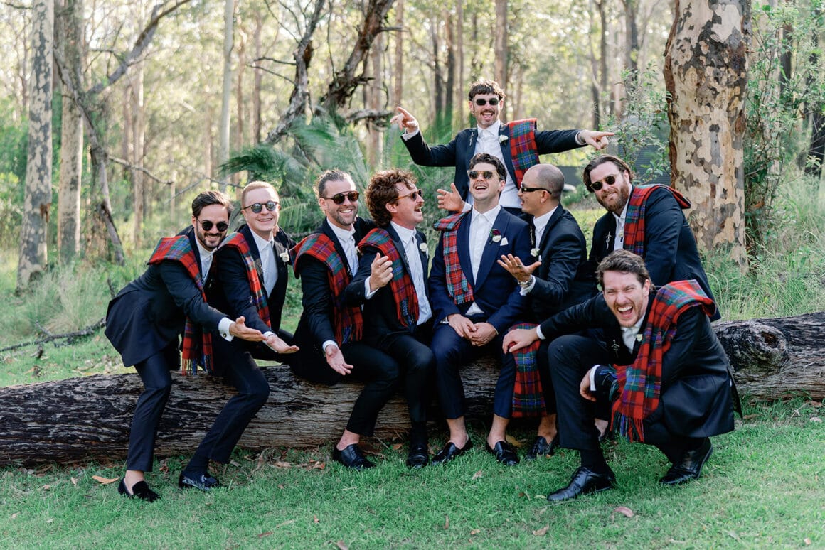 FAVE DETAILS ” The grooms’ party Scottish scarves – I’m half Scottish and Lachy has Scottish heritage, so this was a nice nod to the Davidson and McLean Scottish clans. The stationery – our good friend Anna Rose Carmody designed all our menus, welcome signs, seating plan etc. She’s extremely talented and it was special to have her involved in our wedding. And my bouquet from Fritillerie. I originally wanted just white calla lilies with a green ribbon, but she texted me a couple of days before saying that she had found an amazing green and burgundy slipper orchid and an insane deep dark purple burgundy oncidium orchid. I’m happy I said yes as the colours were so stunning.”