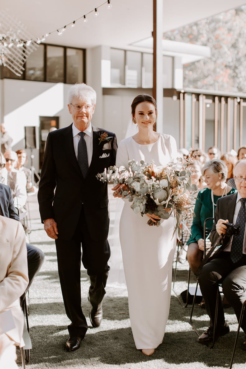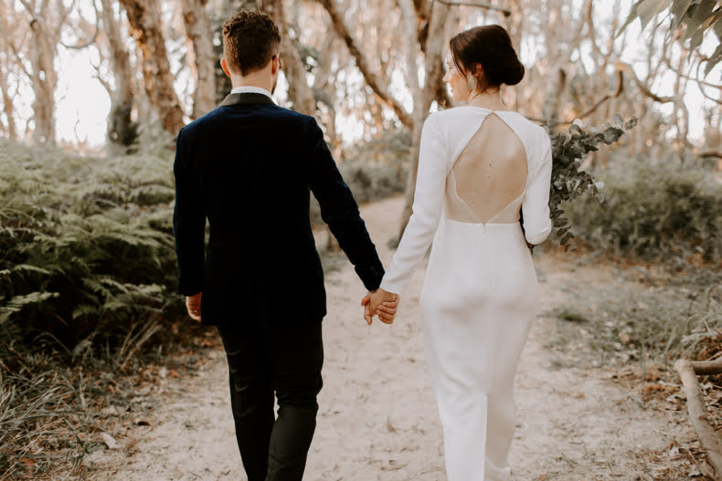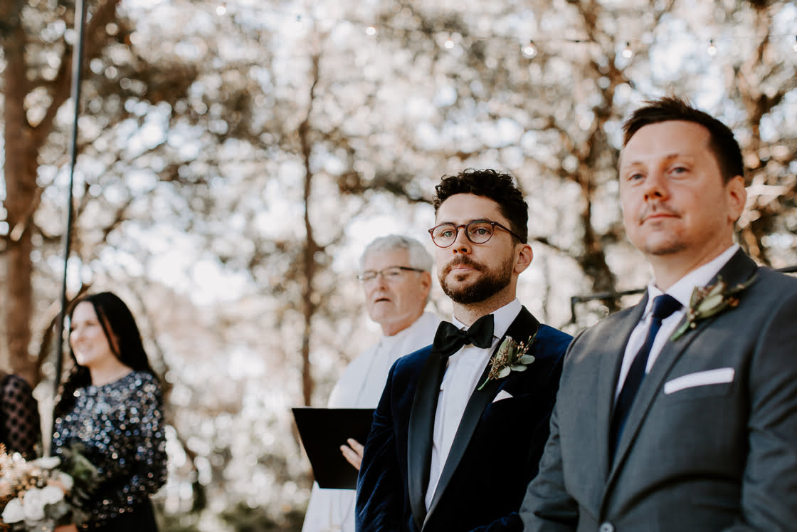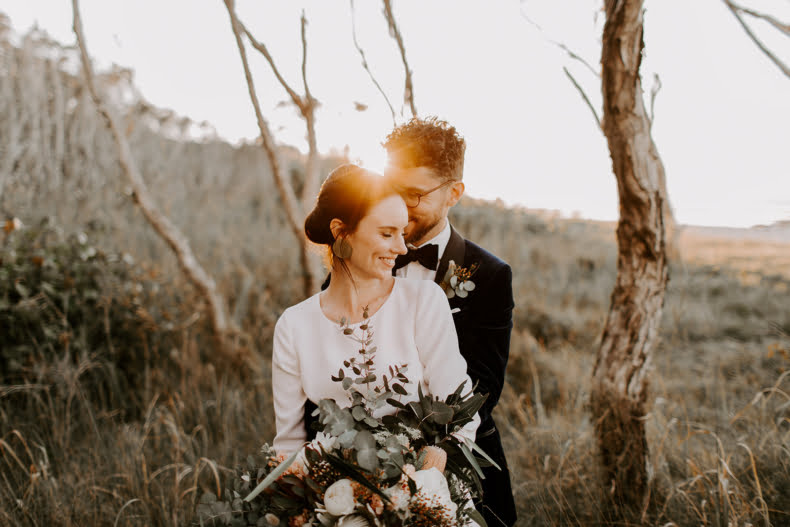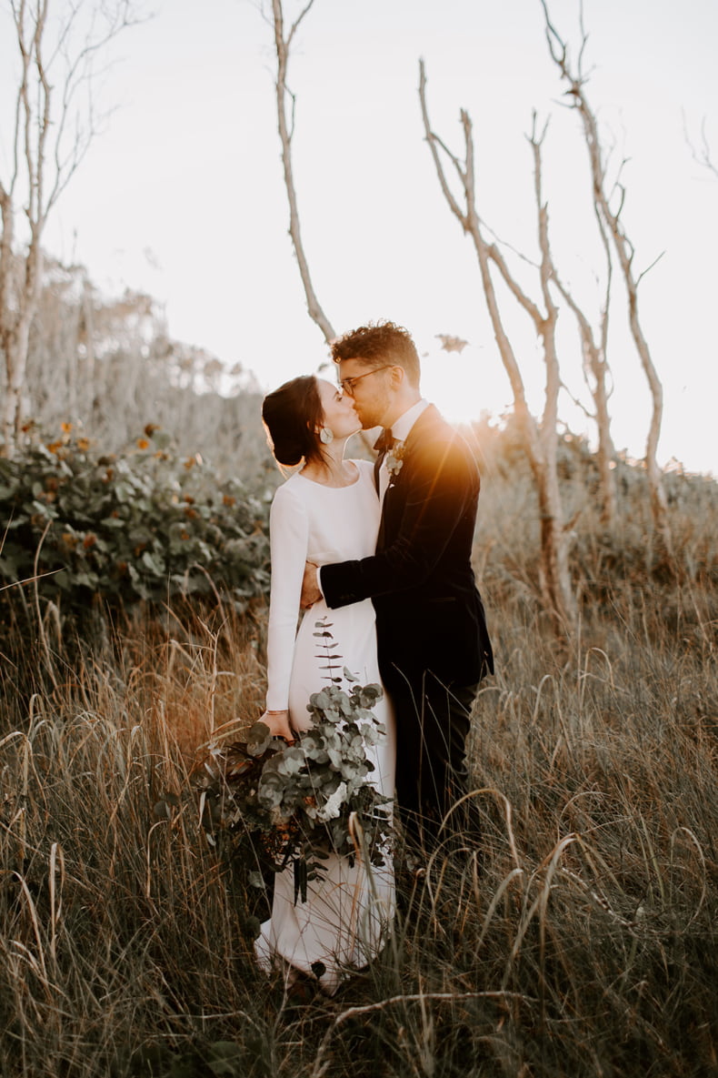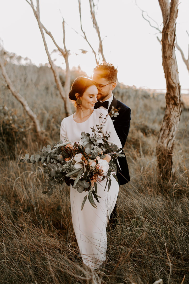 FAVE DETAILS “Standouts were our invitations – the beautiful textured paper letterpressed with terracotta ink. Erin of Paper / Paper made the whole process with our invitations and event day stationery a dream. 31 Degrees, who made our delicious cake and chocolates. She surprised me by making my favourite freckles to include on the sweets table – it was such a sweet and kind gesture. Jeannie from Two Little Rows did an amazing job creating a beautiful space for us. Those florals were divine! And, of course the setting, the bush with a view of the beach through the trees!”