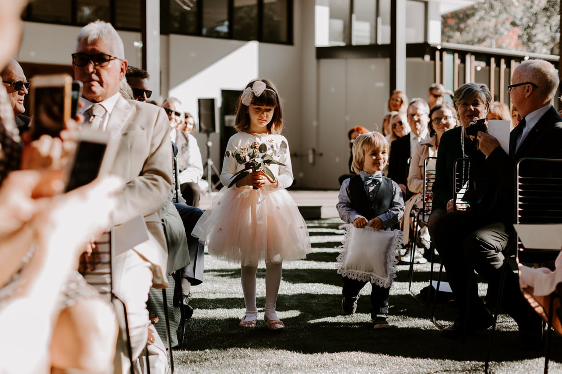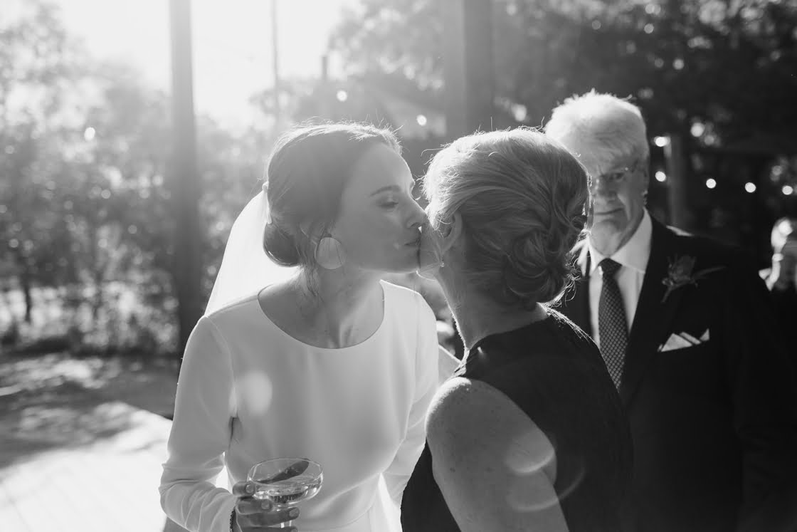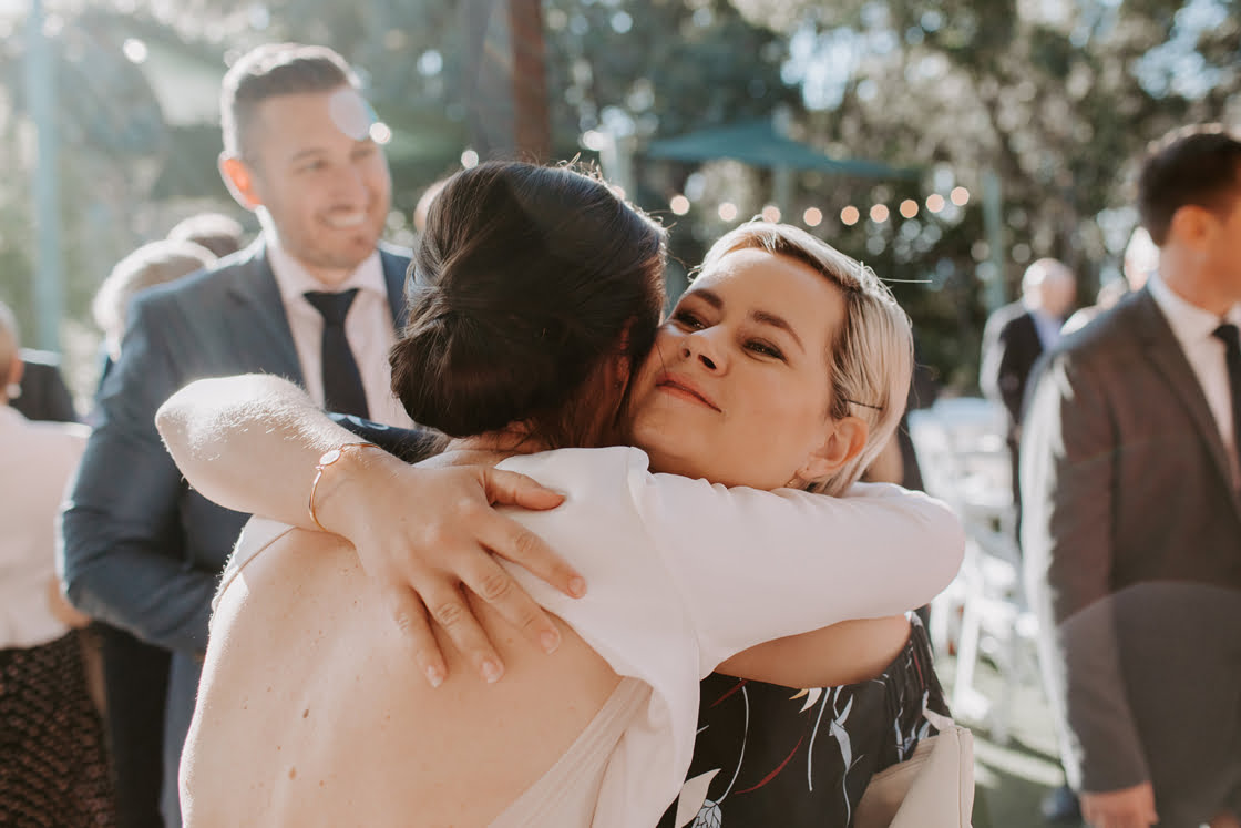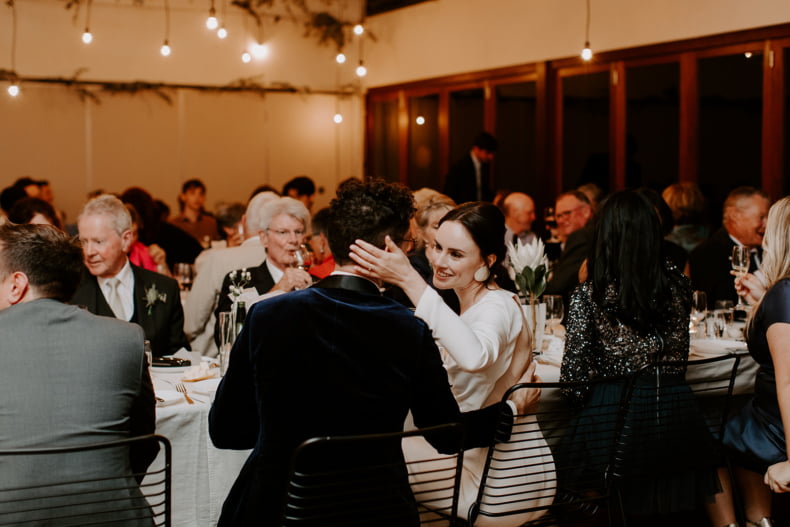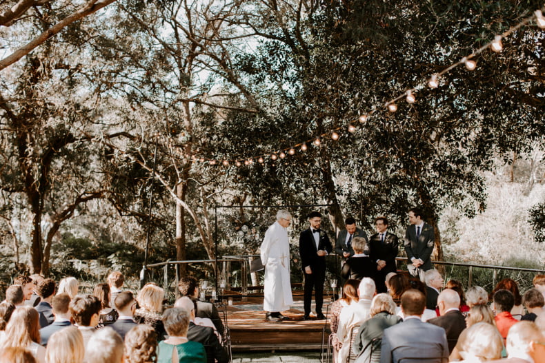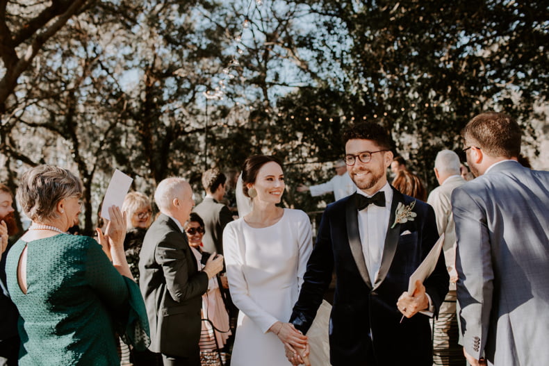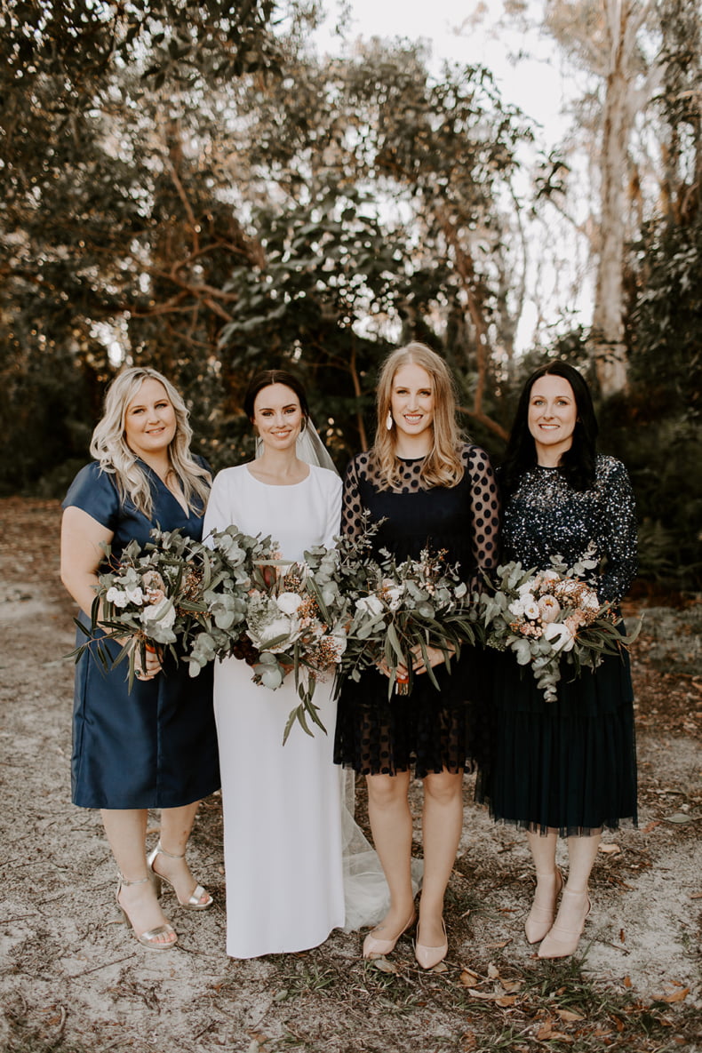 FAVE DETAILS “Standouts were our invitations – the beautiful textured paper letterpressed with terracotta ink. Erin of Paper / Paper made the whole process with our invitations and event day stationery a dream. 31 Degrees, who made our delicious cake and chocolates. She surprised me by making my favourite freckles to include on the sweets table – it was such a sweet and kind gesture. Jeannie from Two Little Rows did an amazing job creating a beautiful space for us. Those florals were divine! And, of course the setting, the bush with a view of the beach through the trees!”
