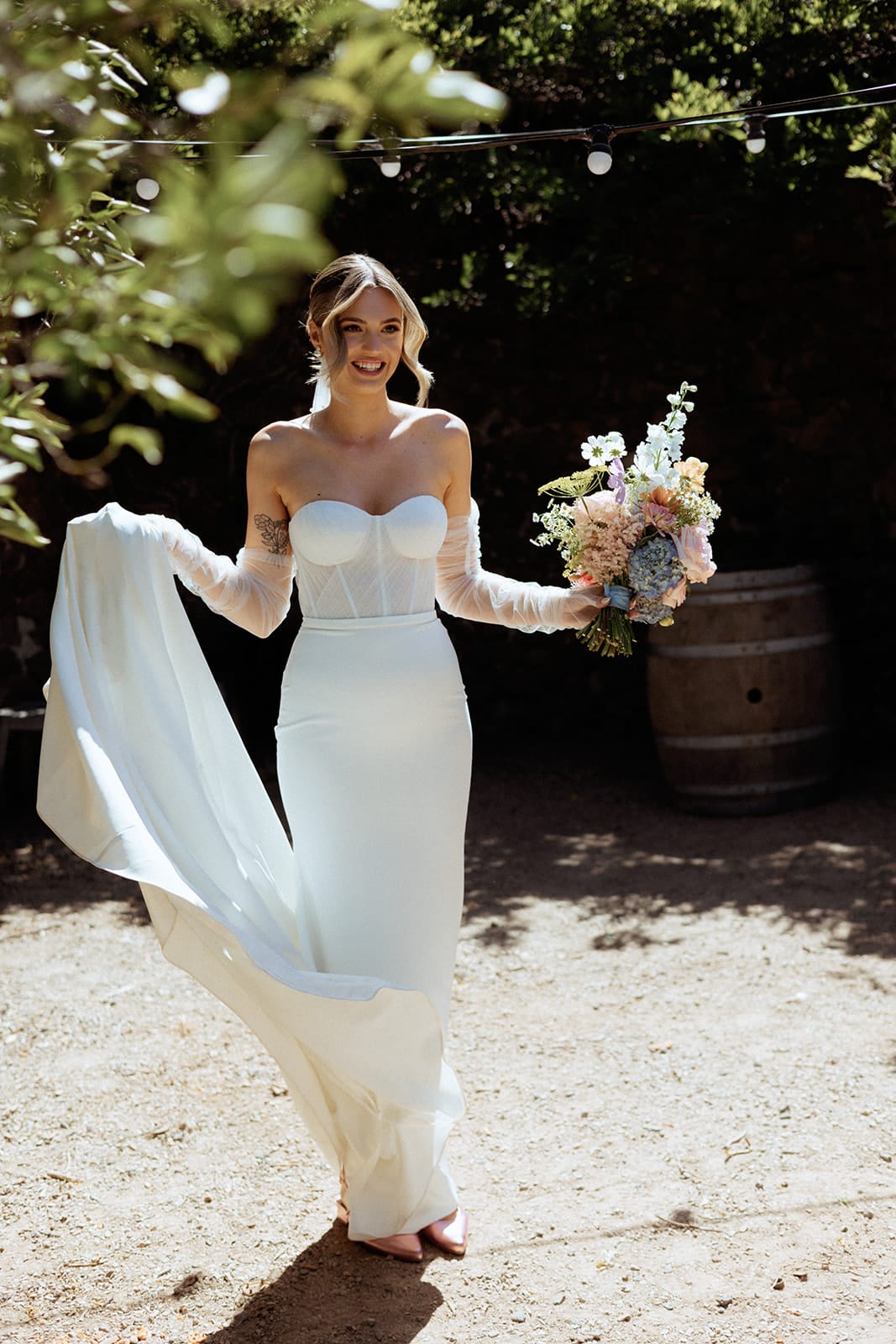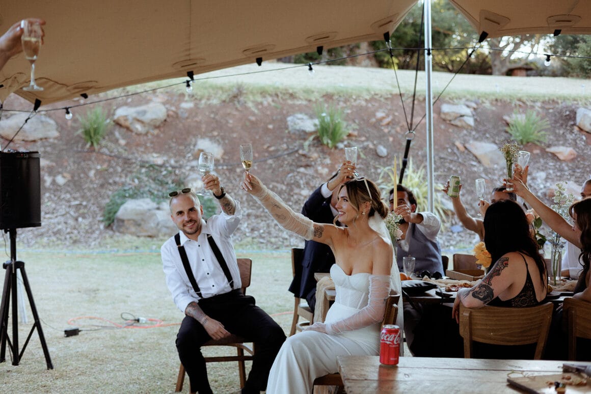 CONTRIBUTING VENDORS Photographer & Cinematographer Caity & Duncan Florist Riana Jayarj – Shanti Flower Venue Camp Sunnystones Catering Happy Camper Pizza Beverage Carts Victorian Mobile Bar Services Cake Maker Good Good Cake Hire Items One Big Day Event Hire & Premier Event Hire Marquee / Teepee & Lighting Hire Stretched Events Signage It’s Yours Collective Entertainment Gabrielle Sparnon & Yo Mama Cover Band Celebrant Samuel Miller – The Bearded Celebrant Rings Cullen Jewellery Audio Guest Book Off The Hook THE BRIDE Bridal Gown Designer Made With Love Bridal (First Dress) & Meshki (Second Dress) Veil Made With Love Bridal Getting Ready PJs Kat The Label Shoes Bared Footwear Accessories Gregory Ladner via David Jones (Earrings), The Traveller Series (Earrings) & KYHA Studios (Clutch) Hair Hair by Brittany Makeup Sharni Rose Beauty Fragrance/Perfume Maison Margiela THE GROOM Suit & Pants Savile Row via Mens Suit Warehouse Shirt Gibson via Mens Suit Warehouse Suspenders & Bow Tie Mens Suit Warehouse Shoes Dr. Martens Watch Fossil