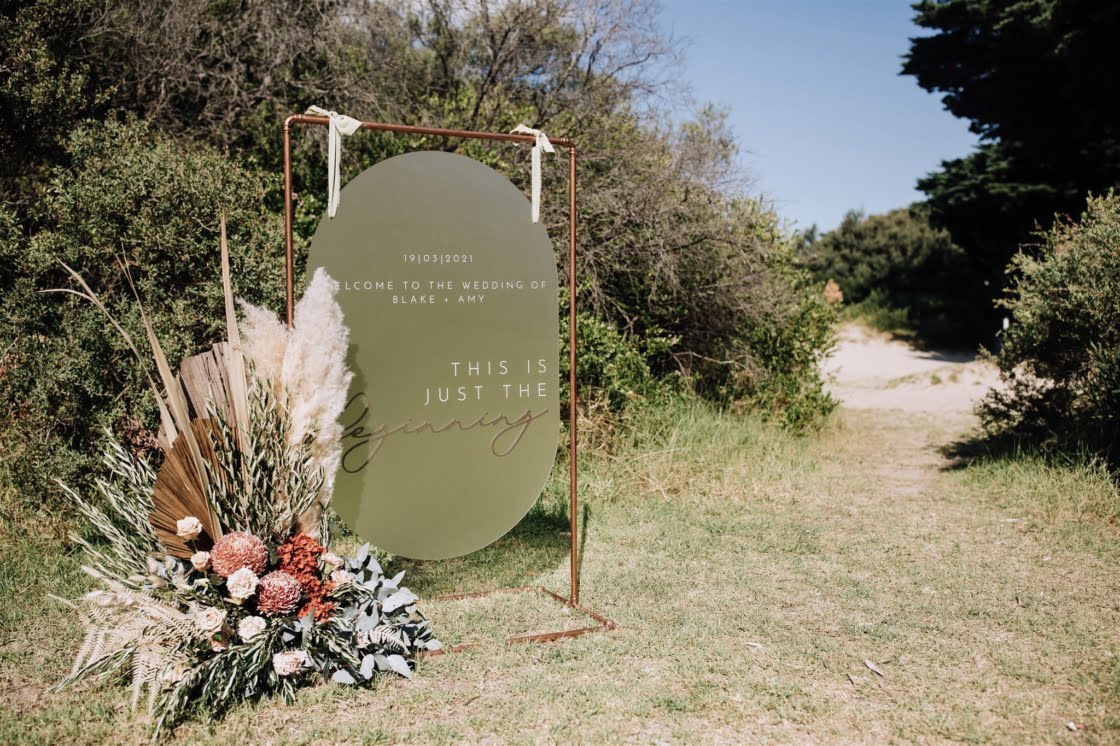 DIY “Blake created our welcome sign stand. Being a plumber he knew it would be something he could create out of copper! As for the table deco at the reception, I collected and recycled all the bottles from work. I knew I didn’t want large posies on the guest tables rather a scattered, unstructured vibe. The dried flowers that decorated the recycled glass jars were a mix of personally collected dried elements from when we would go on walks around my parent’s property mixed with some purchased dried flowers from a local store. The fortnight before the wedding my sister mum and I had an afternoon of creativity where we styled up all the glass jars/vases all ready for the big day.”