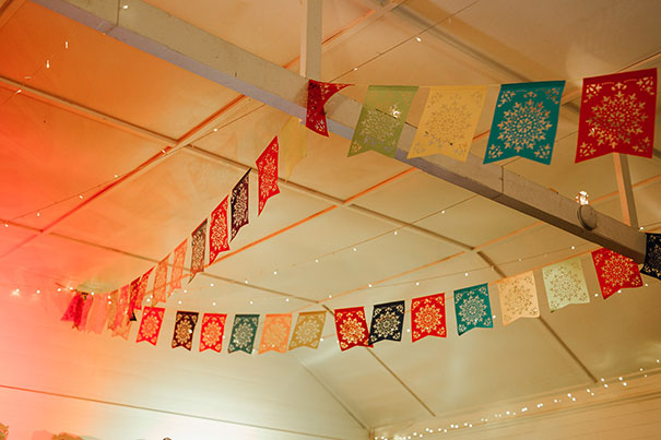 “It was was bright, fun and vibrant… just as we had pictured! The Mexican party bunting, fairy lights and table clothes, cake, balloons, pom-pom wall  so much colour,” says the bride, who wore a stunning Grace Loves Lace gown.