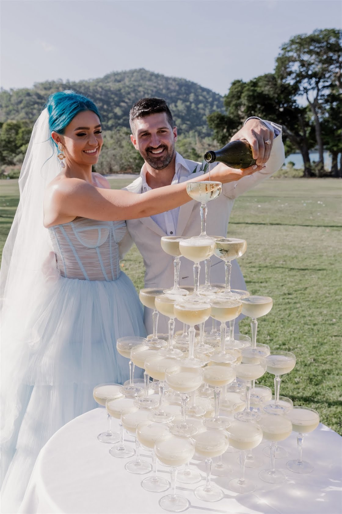 Til Death Events did a stellar job of pulling together their dream ‘tropical-luxe’ day, giving them all the paradise feels they ever could’ve wanted. “We wanted a tropical theme but we also wanted to keep it modern,” shares Amy, who’s a member of Brisbane indie pop band Sheppard. “Our wedding planner presented the term ‘tropical-luxe’, which I think describes our day perfectly. We wanted it to be beachy but no sand and no frangipanis.” Men’s health coach Lachie’s casj M.J. Bale linen suit was total coastal vibes, Amy’s powder-blue dress was something from a fairytale – and the pics, by the talented Florido Weddings, are absolutely everything.