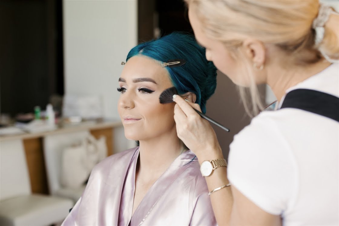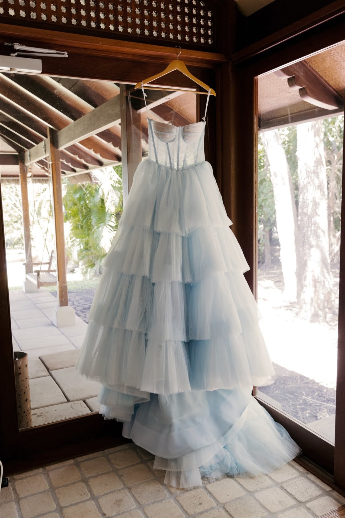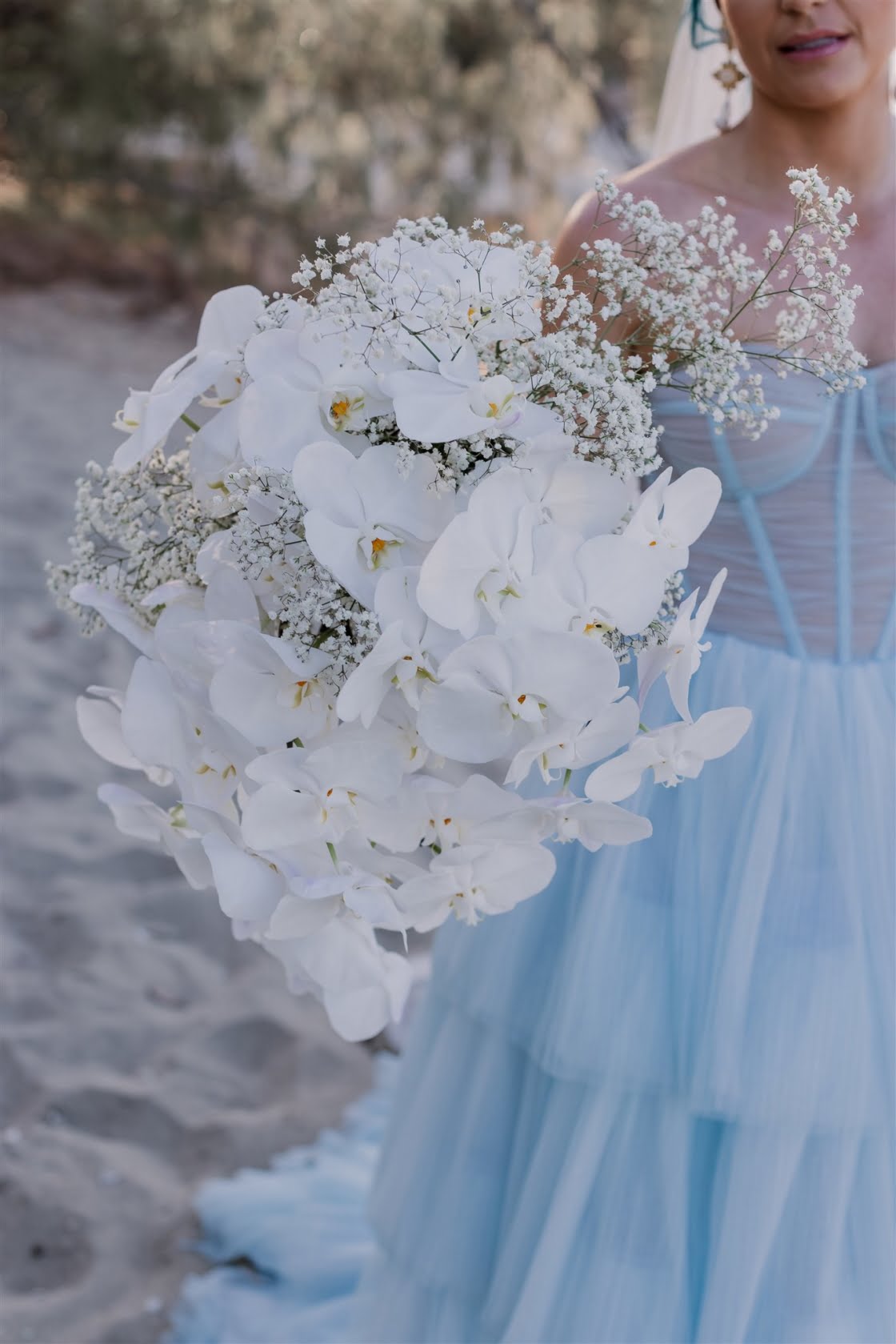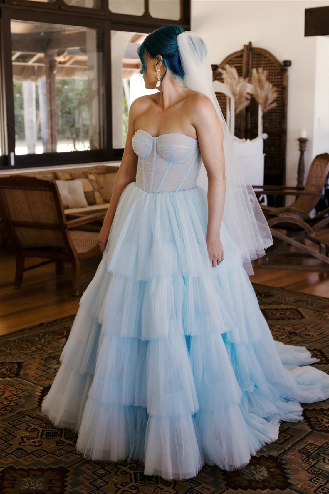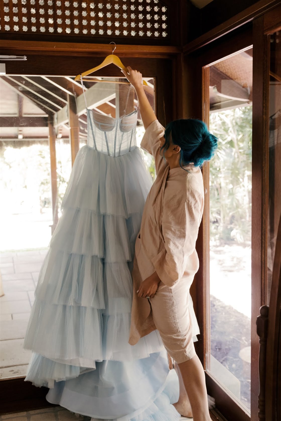 THE DRESS “After trying on what seemed like thousands of white dresses, I knew I didn’t want to walk down the aisle in a traditional dress. The selection of non-white wedding dresses is very small and I couldn’t find a single wedding dress in blue. Ella Moda had invited me in to come in for a fitting and I presented her with my vision of having a powder-blue tulle gown. It was clear that my request wasn’t going to be an easy task (especially during a pandemic) but her team quickly sketched up a drawing of the dress and sent tulle samples off to be test dyed. Once we knew the fabric was going to hold the dye, it all came together without too much concern. Ella and her team were a dream to work with. They understood my vision and brought it to life. I know a lot of hard work went into that blue gown and I’m so grateful they could make it happen. Ella Moda also made my reception dress. I knew this was my chance to wear a white dress so I chose a white beaded midi dress with cut outs and a dramatic leg split. It was so comfortable to wear and was easy to dance in.”