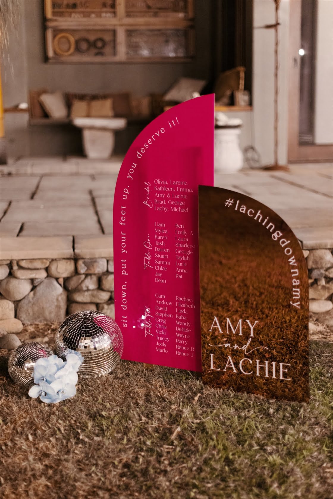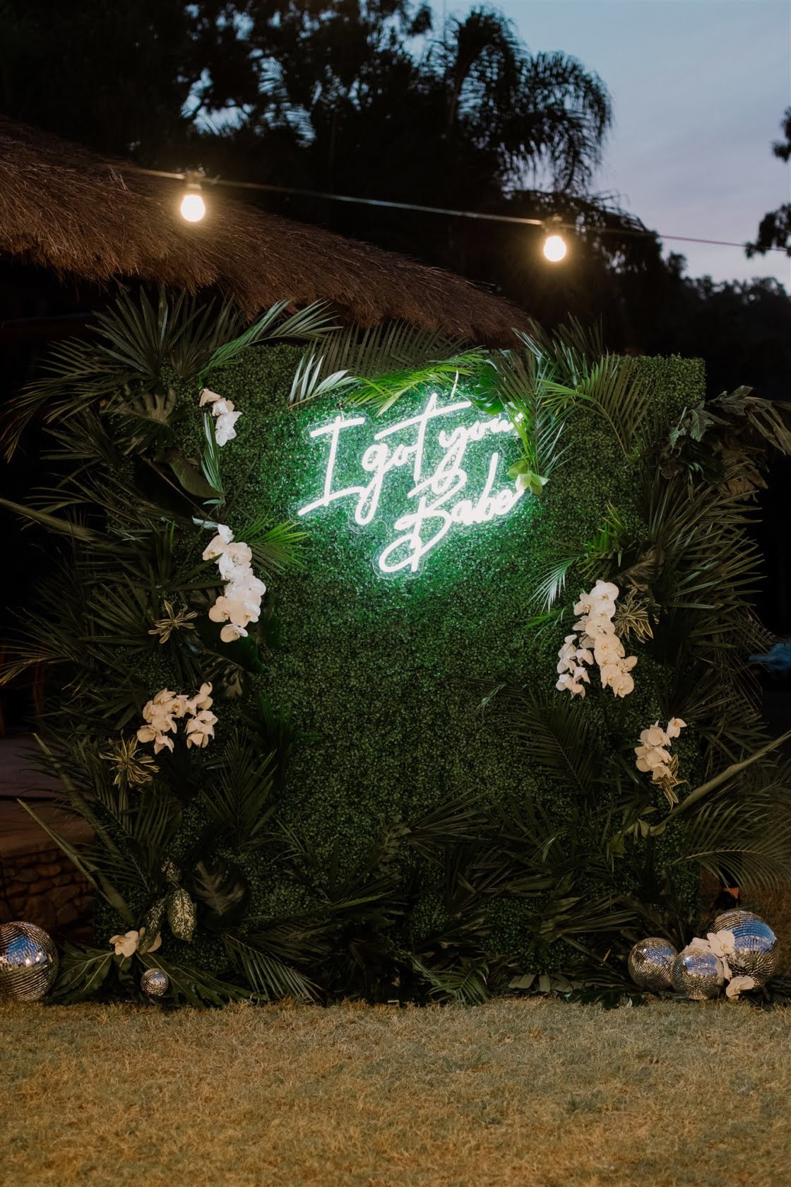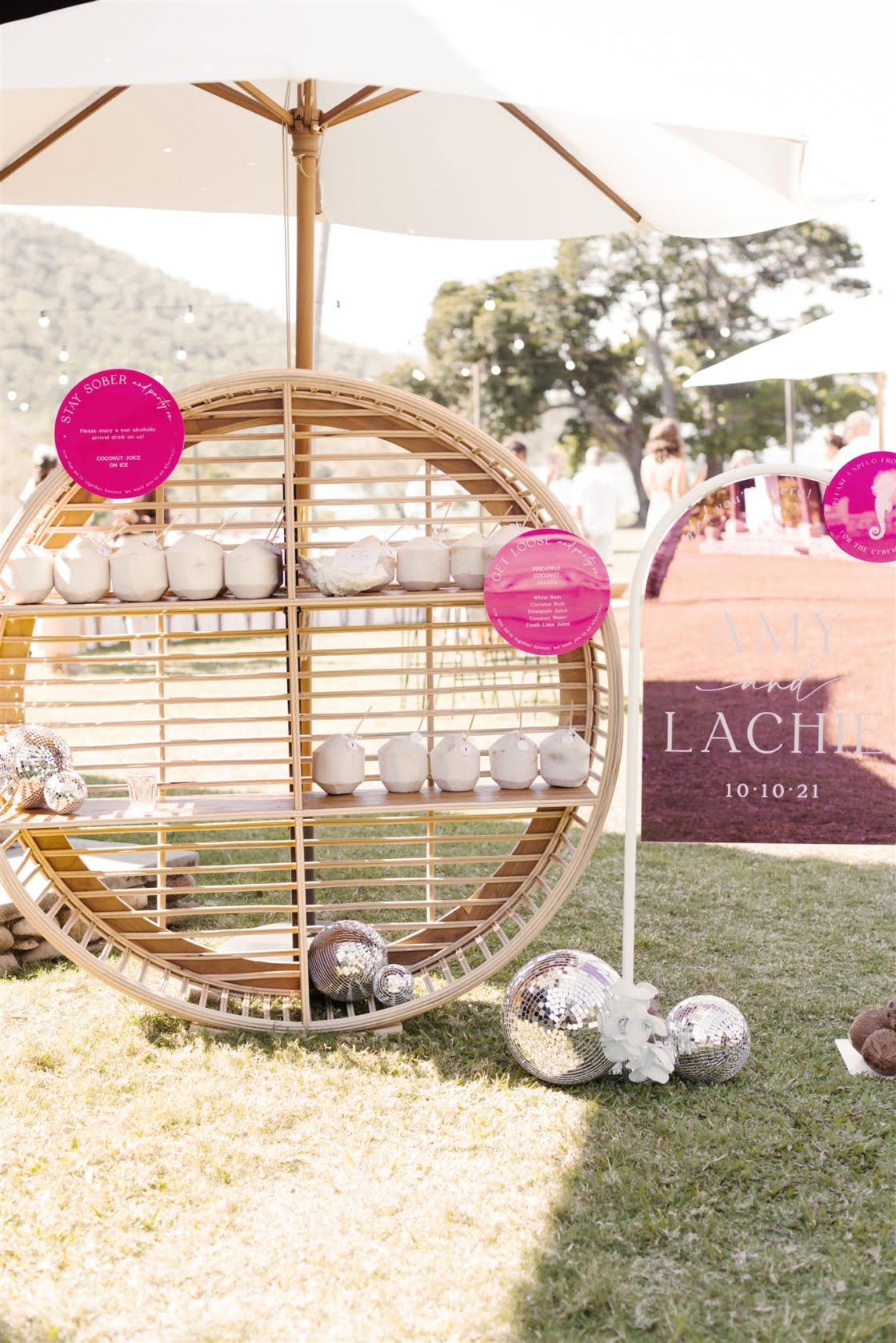 FAVE DETAILS “I really loved planning our wedding. I paid special attention to every detail that I could possibly think of. We designed our own wedding logo, which we tried to incorporate as much as we could. Our bamboo arbour was handmade by our florist, Evoke Floral Design, and her husband and it was everything I imagined and more. We chose orchids as our hero flower and they lasted so beautifully in the humidity. Our guests were treated to a welcome cocktail on arrival, which was presented in a coconut, and once the cocktail party kicked off, fresh seafood and boozy ice blocks circulated. The signage and stationary were made up of pink, white and rose gold acrylic and we tried to keep the language fun, casual and witty. In terms of entertainment, we had an acoustic guitar loop pedalist playing up until the reception. We then switched to a DJ who added a nice touch by also playing saxophone. Instead of a photobooth we decided to have a photo wall with a custom neon sign by Neon Republic. The wall was decorated with greenery, orchids and disco balls. Towards the end of the evening, we surprised our guests with a fireworks show. It was a truly spectacular moment.”