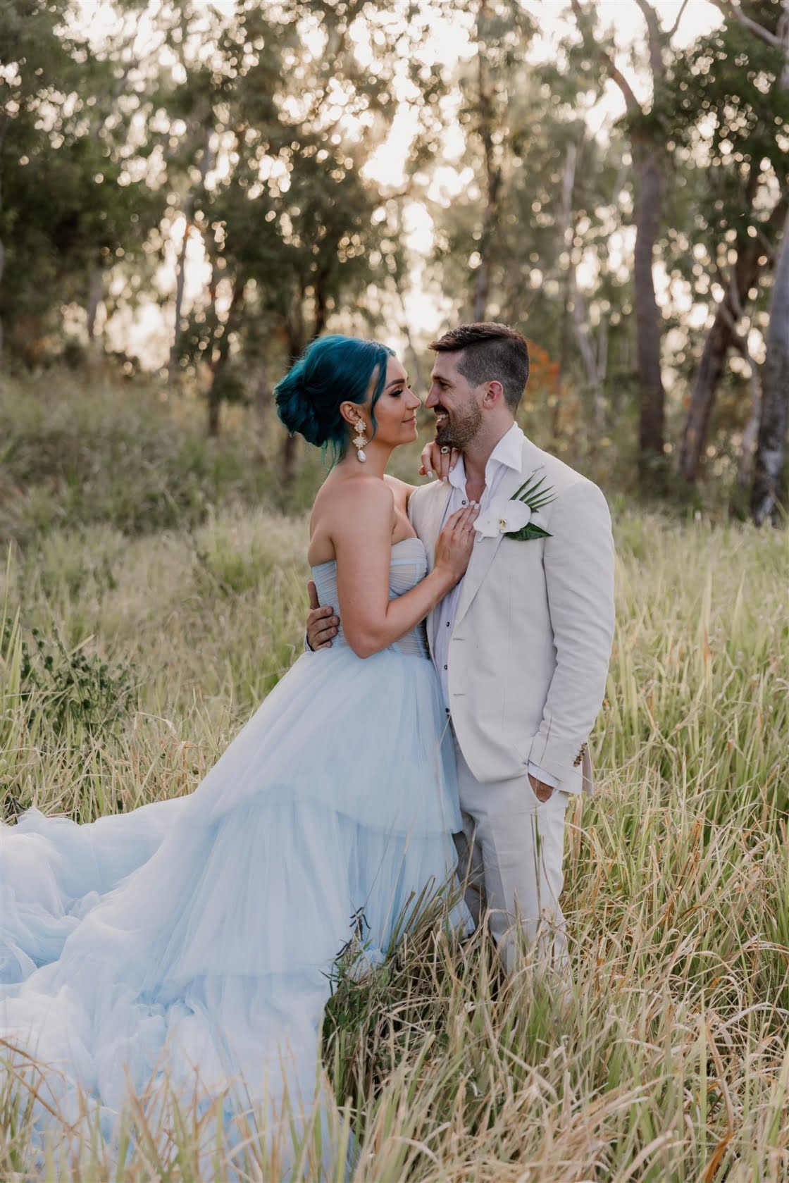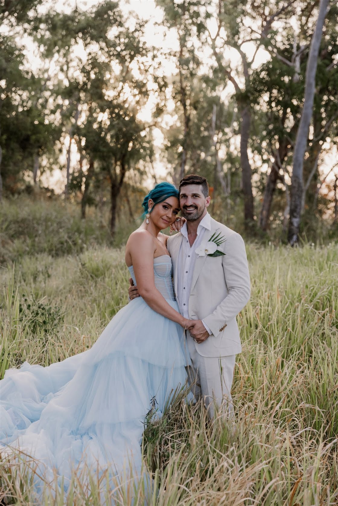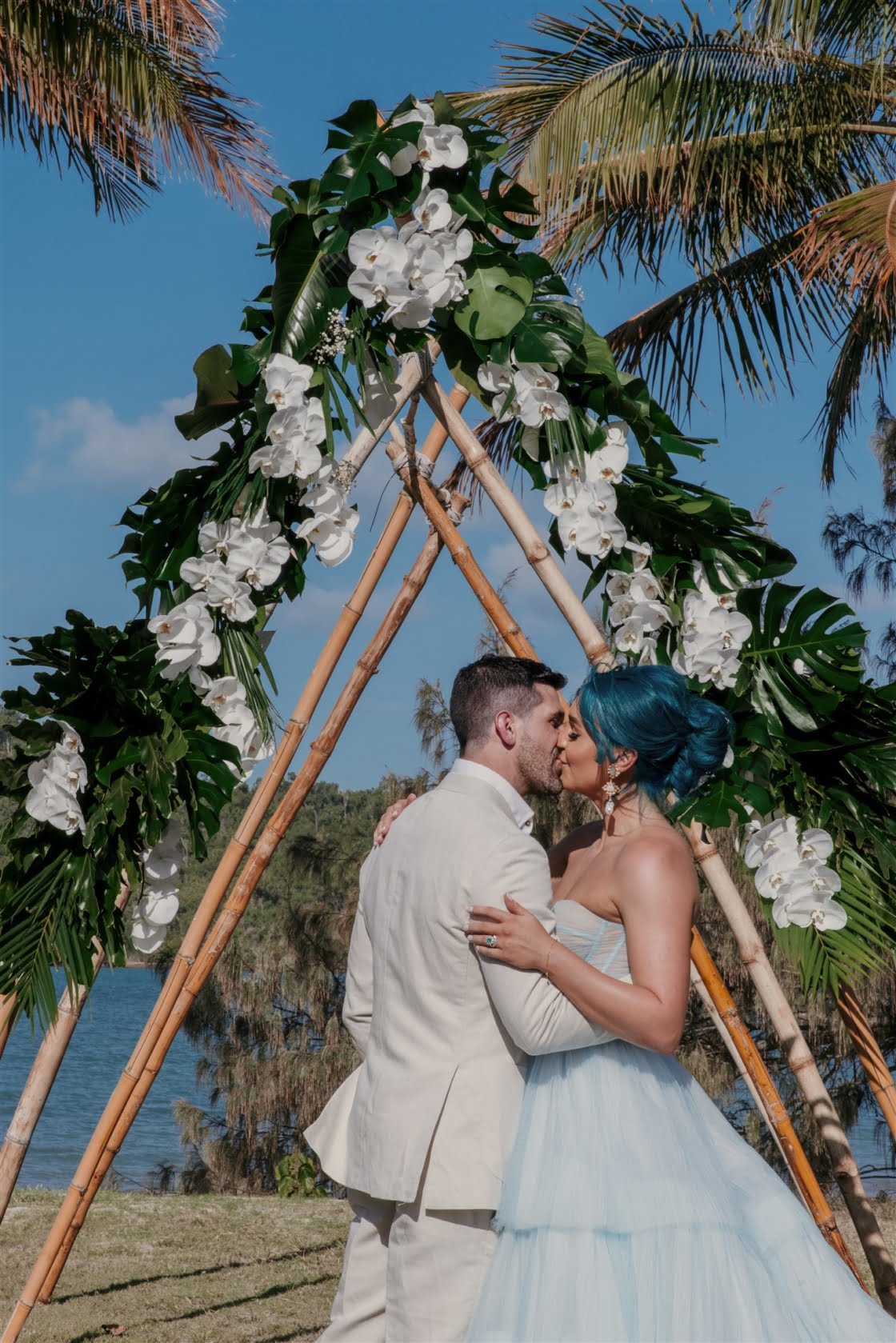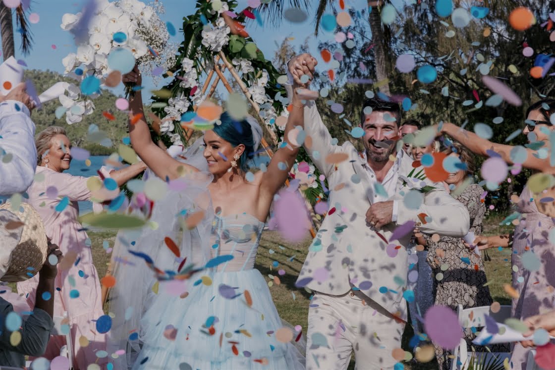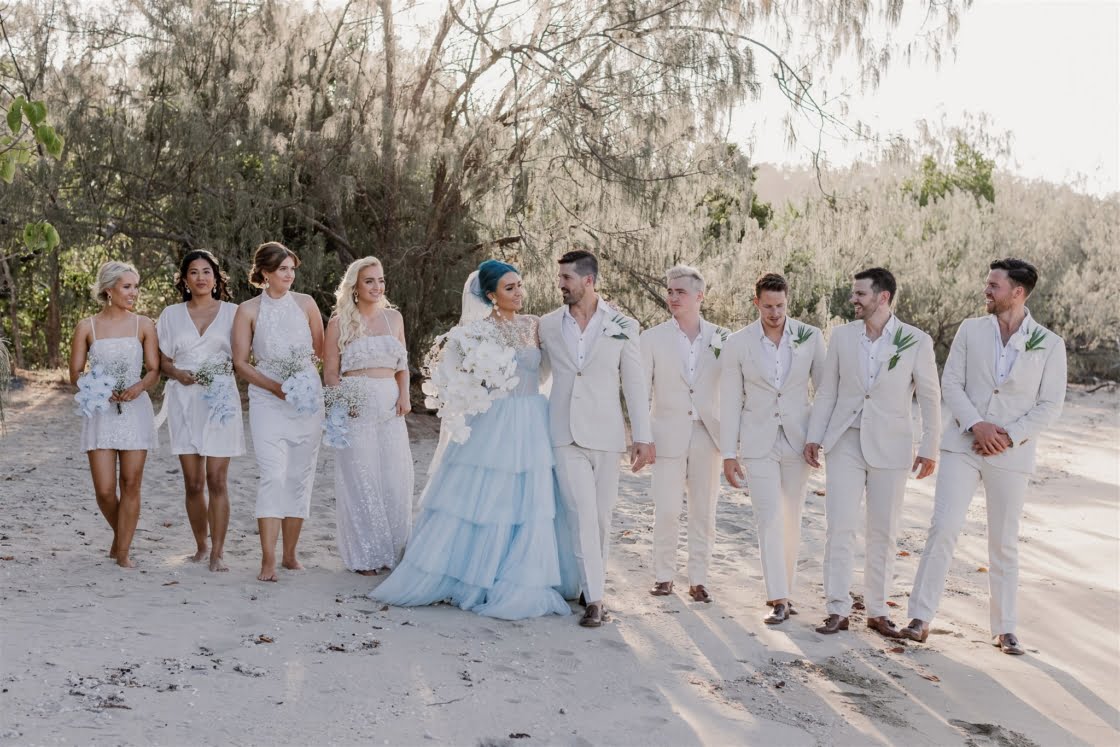 Til Death Events did a stellar job of pulling together their dream ‘tropical-luxe’ day, giving them all the paradise feels they ever could’ve wanted. “We wanted a tropical theme but we also wanted to keep it modern,” shares Amy, who’s a member of Brisbane indie pop band Sheppard. “Our wedding planner presented the term ‘tropical-luxe’, which I think describes our day perfectly. We wanted it to be beachy but no sand and no frangipanis.” Men’s health coach Lachie’s casj M.J. Bale linen suit was total coastal vibes, Amy’s powder-blue dress was something from a fairytale – and the pics, by the talented Florido Weddings, are absolutely everything.