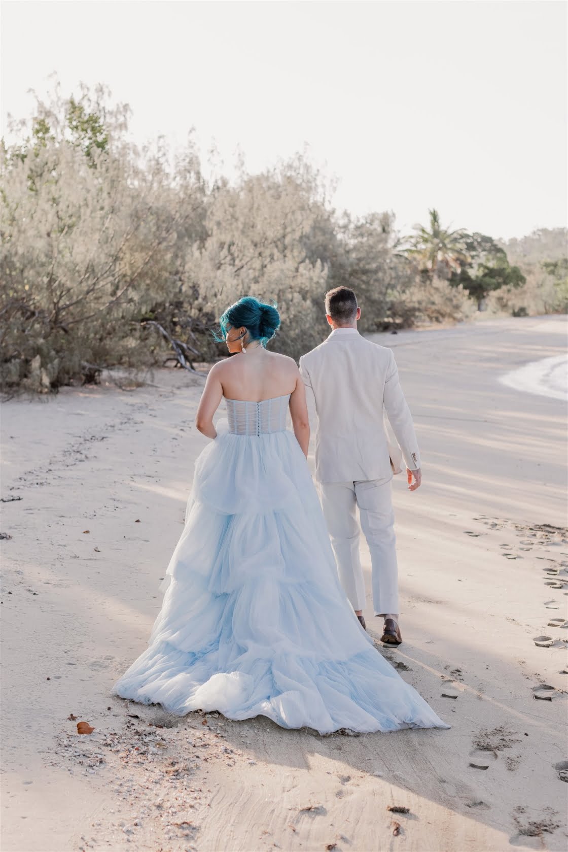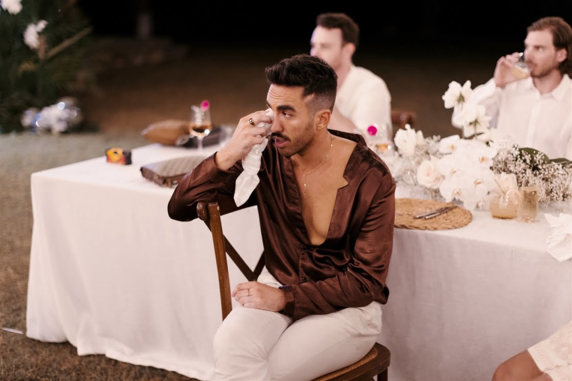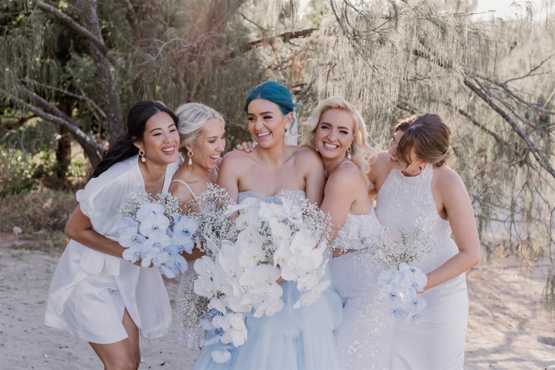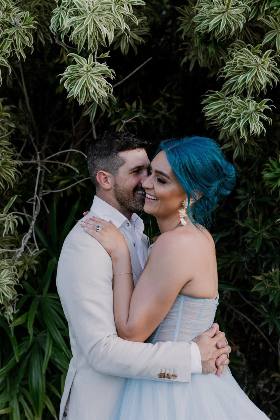 Til Death Events did a stellar job of pulling together their dream ‘tropical-luxe’ day, giving them all the paradise feels they ever could’ve wanted. “We wanted a tropical theme but we also wanted to keep it modern,” shares Amy, who’s a member of Brisbane indie pop band Sheppard. “Our wedding planner presented the term ‘tropical-luxe’, which I think describes our day perfectly. We wanted it to be beachy but no sand and no frangipanis.” Men’s health coach Lachie’s casj M.J. Bale linen suit was total coastal vibes, Amy’s powder-blue dress was something from a fairytale – and the pics, by the talented Florido Weddings, are absolutely everything.