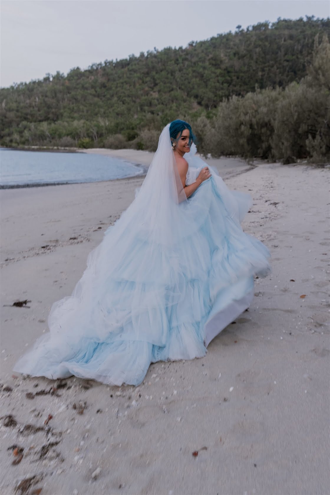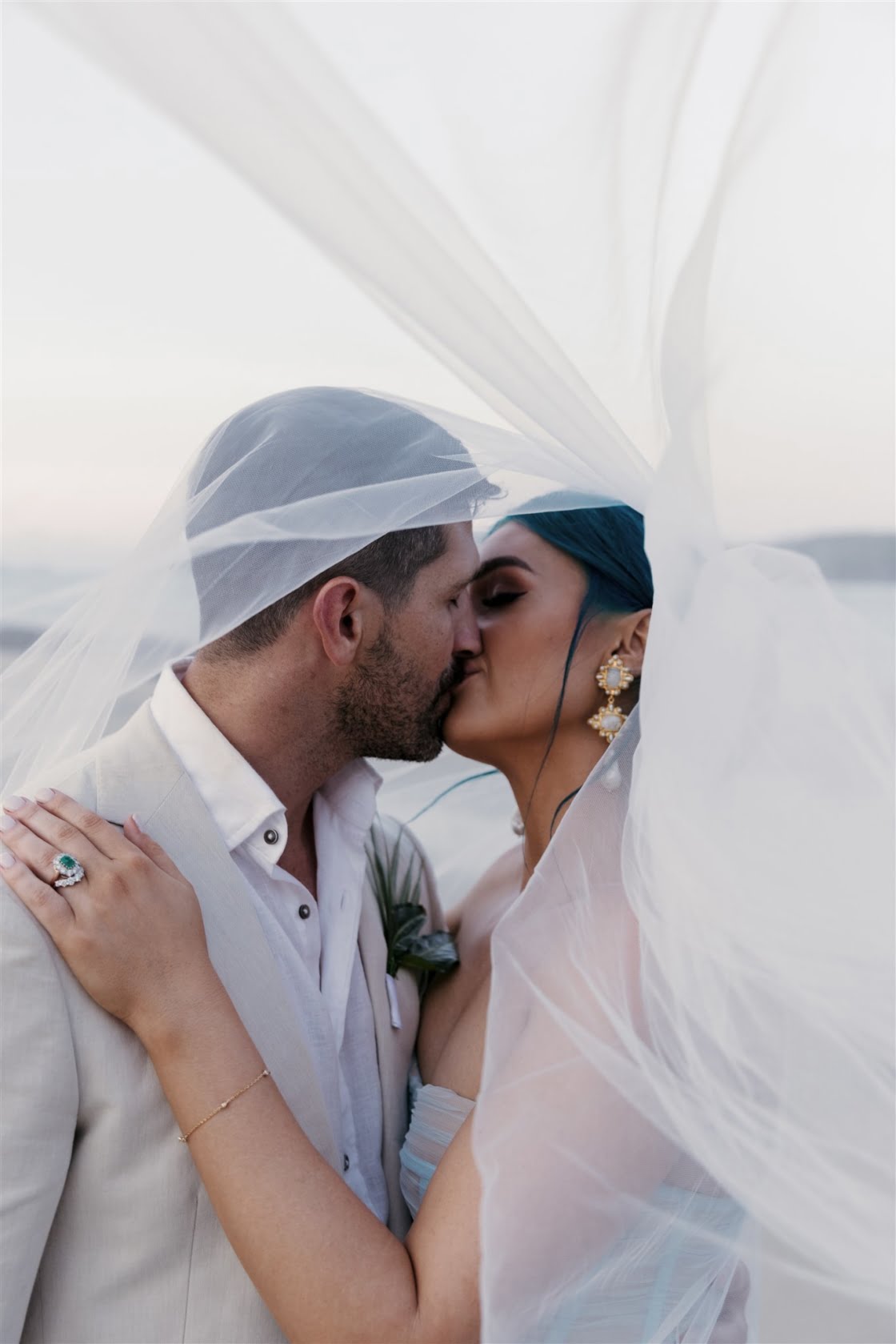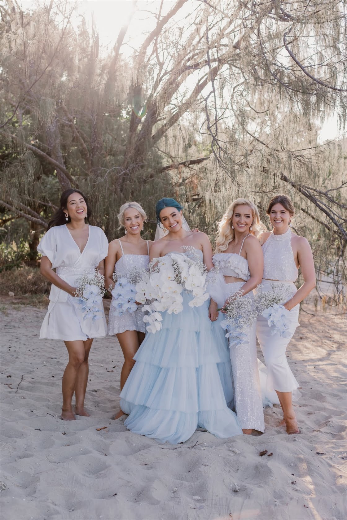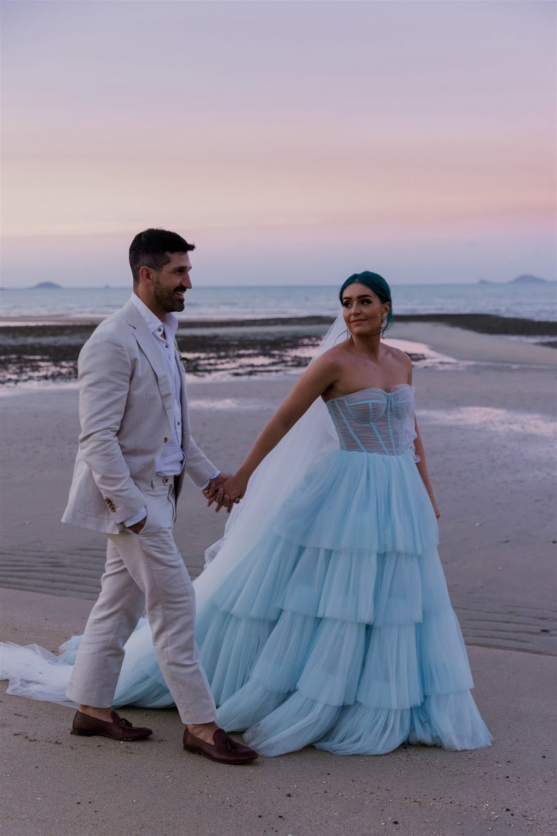 Til Death Events did a stellar job of pulling together their dream ‘tropical-luxe’ day, giving them all the paradise feels they ever could’ve wanted. “We wanted a tropical theme but we also wanted to keep it modern,” shares Amy, who’s a member of Brisbane indie pop band Sheppard. “Our wedding planner presented the term ‘tropical-luxe’, which I think describes our day perfectly. We wanted it to be beachy but no sand and no frangipanis.” Men’s health coach Lachie’s casj M.J. Bale linen suit was total coastal vibes, Amy’s powder-blue dress was something from a fairytale – and the pics, by the talented Florido Weddings, are absolutely everything.
